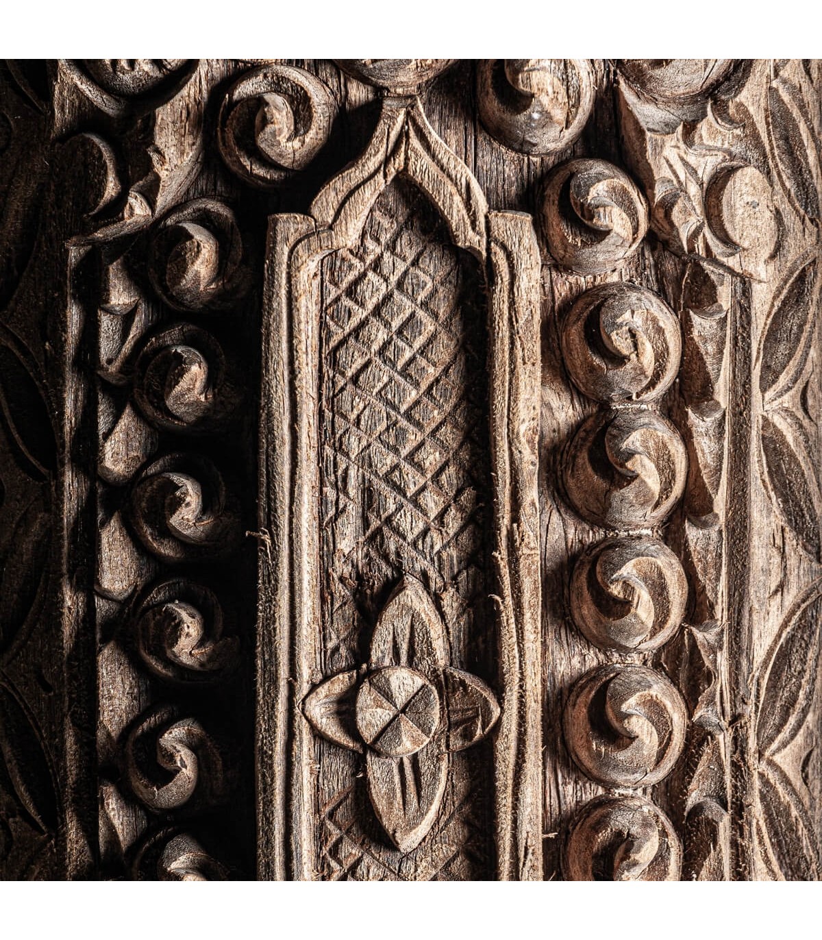 La combinación entre la madera tallada de teca natural y la base de hierro negro crea un contraste visual atractivo y elegante. Ideal para espacios amplios, halls, esquinas destacadas o zonas de paso donde busques un impacto visual auténtico con alma artesanal.