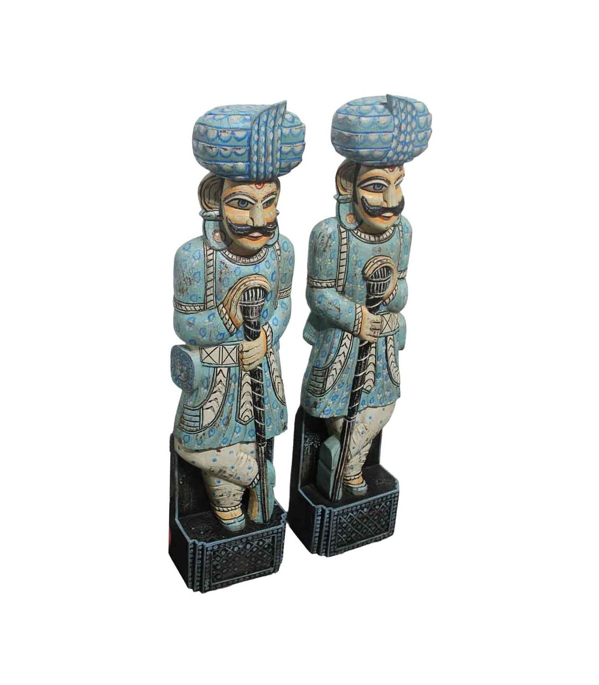 Este conjunto de figuras decorativas de inspiración oriental esculpidas en madera tropical aporta un aire exótico y artesanal a cualquier ambiente. Talladas y policromadas a mano con gran detalle, destacan por sus tonos azulados, sus turbantes tradicionales y su carácter simbólico.