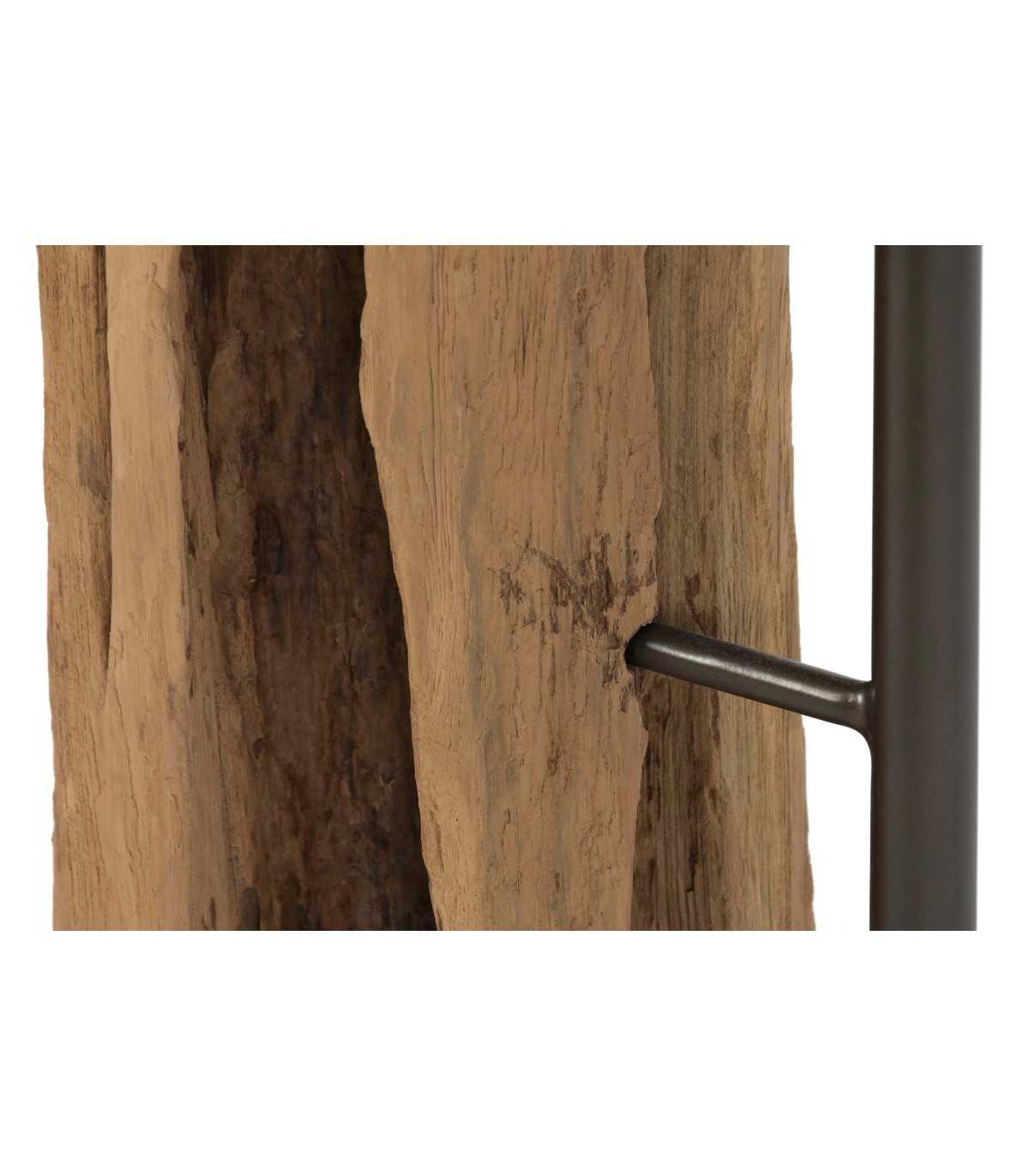 Diseñada como una pieza escultórica, esta lámpara de pie combina la solidez de la madera de teca con la ligereza del metal y la suavidad del lino. Su pantalla en color topo difunde una luz cálida que realza las vetas naturales del tronco tallado. La base metálica cromada aporta estabilidad y un toque actual sin restar protagonismo al acabado orgánico.