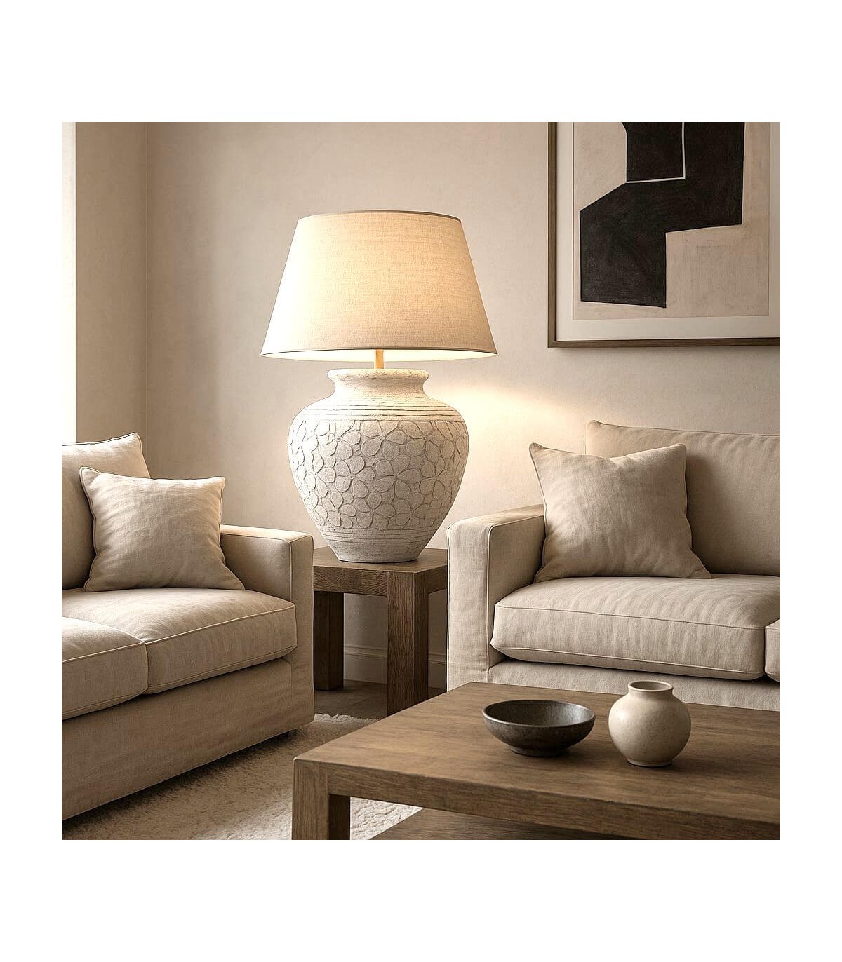 La lámpara de sobremesa XXXL destaca por su base artesanal de terracota labrada, con un acabado blanco rozado sobre fondo negro que aporta carácter y singularidad a cualquier ambiente. Su diseño de inspiración boho convierte cada detalle en una expresión de estilo natural, donde la textura rugosa de la cerámica se funde con la calidez de la pantalla en yute.