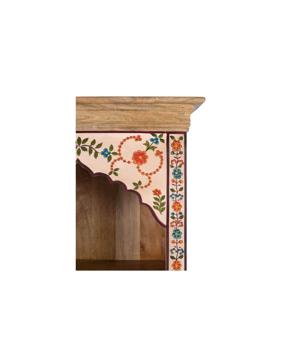 El frontal está decorado completamente a mano con motivos florales multicolor que aportan vida y personalidad a cualquier estancia. Su forma estilizada la hace perfecta para rincones pequeños o pasillos con encanto.