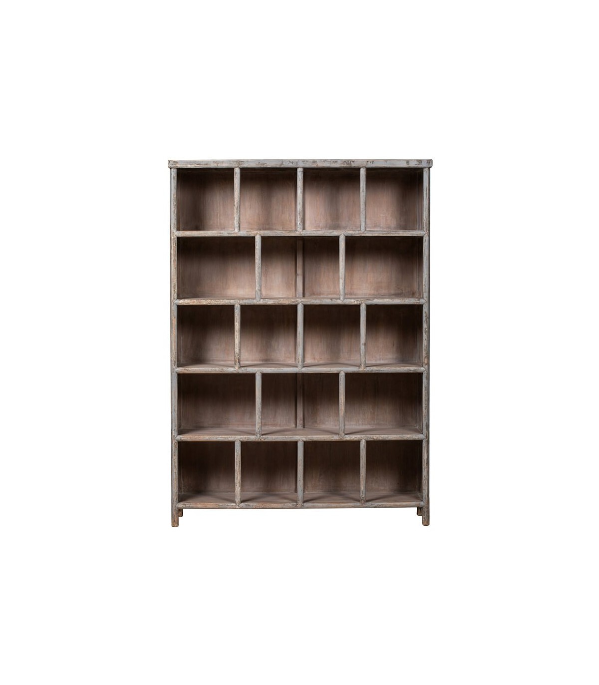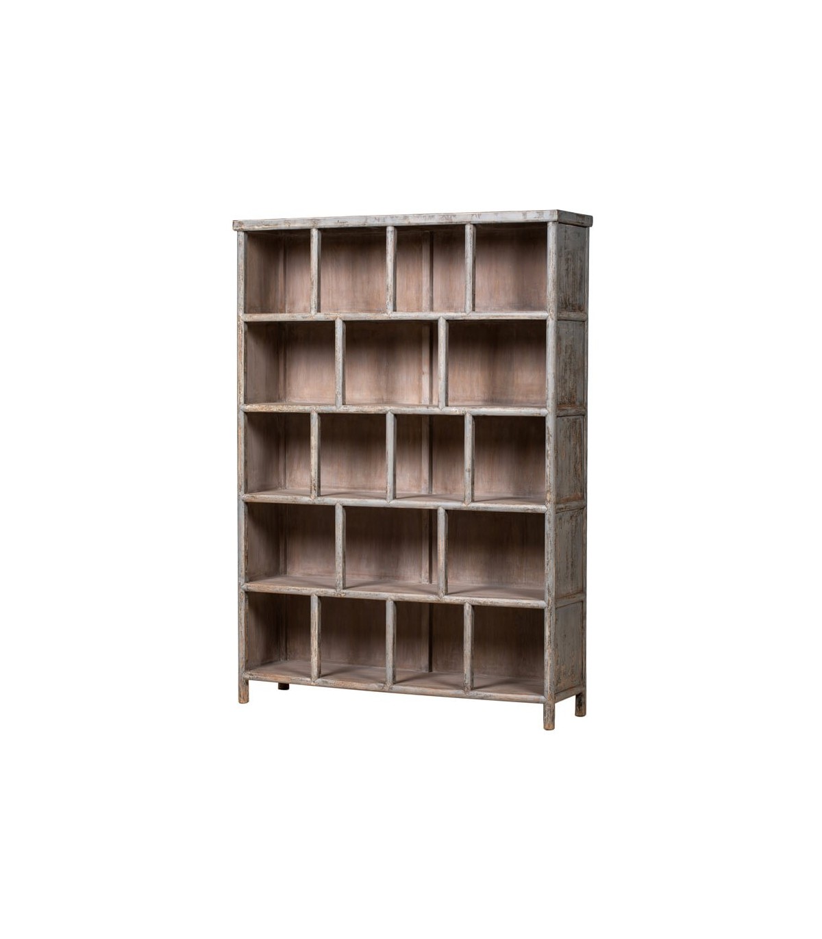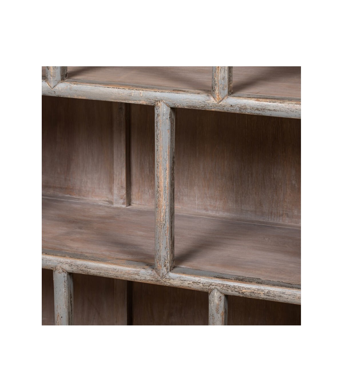 Espectacular librería, para grandes salones, realizada en madera maciza de pino decapada artesanalmente en color gris, sin duda el centro de atención en cualquier decoración.