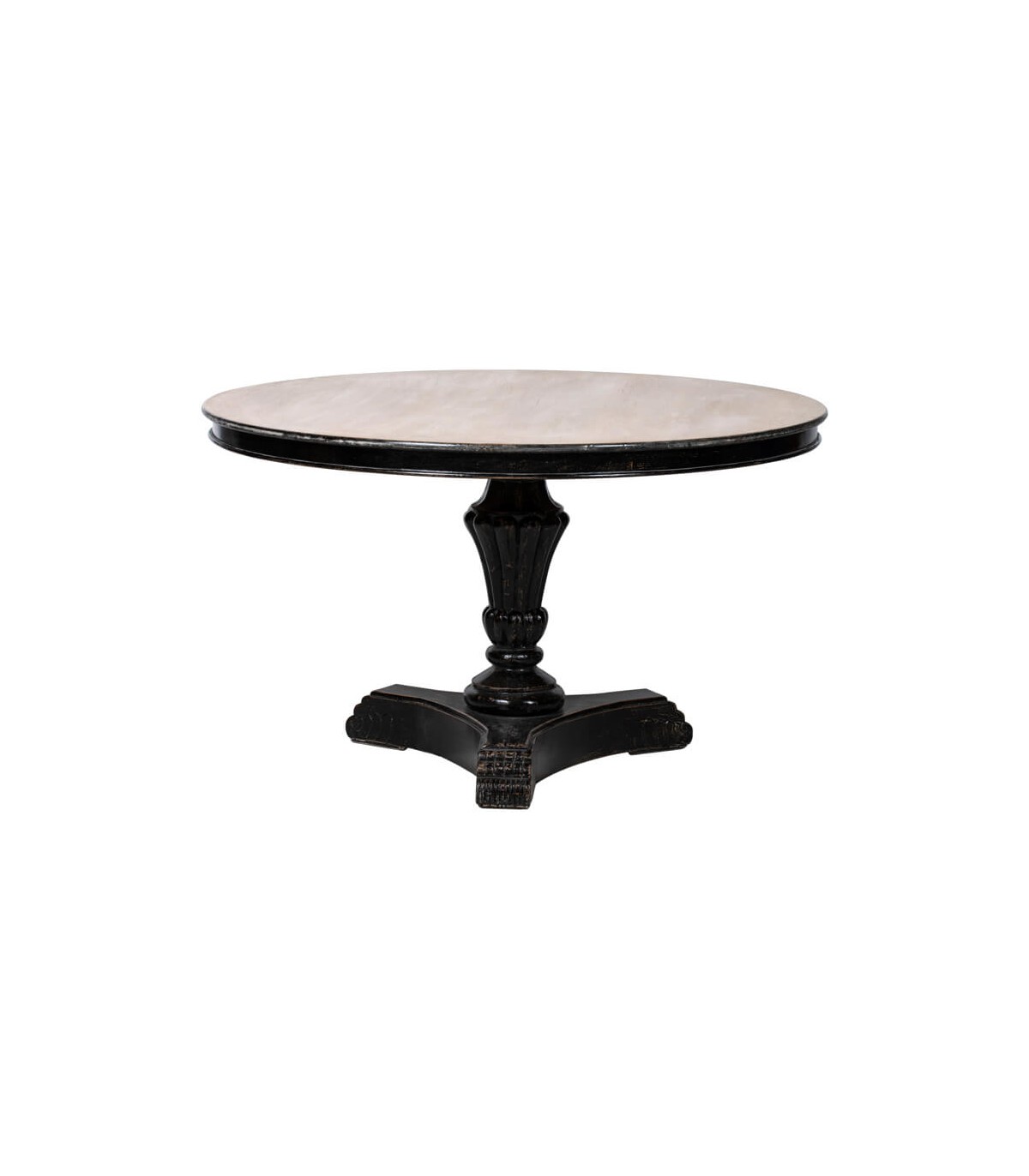 Con un diseño elegante y atemporal, esta mesa de comedor redonda destaca por su estructura robusta y su encanto artesanal. Tallada a mano en madera maciza de pino, combina una base negra con acabado rozado que aporta carácter, y una tapa natural que realza la belleza de la veta. Su pie central tallado con formas clásicas crea una silueta escultural que no pasa desapercibida.