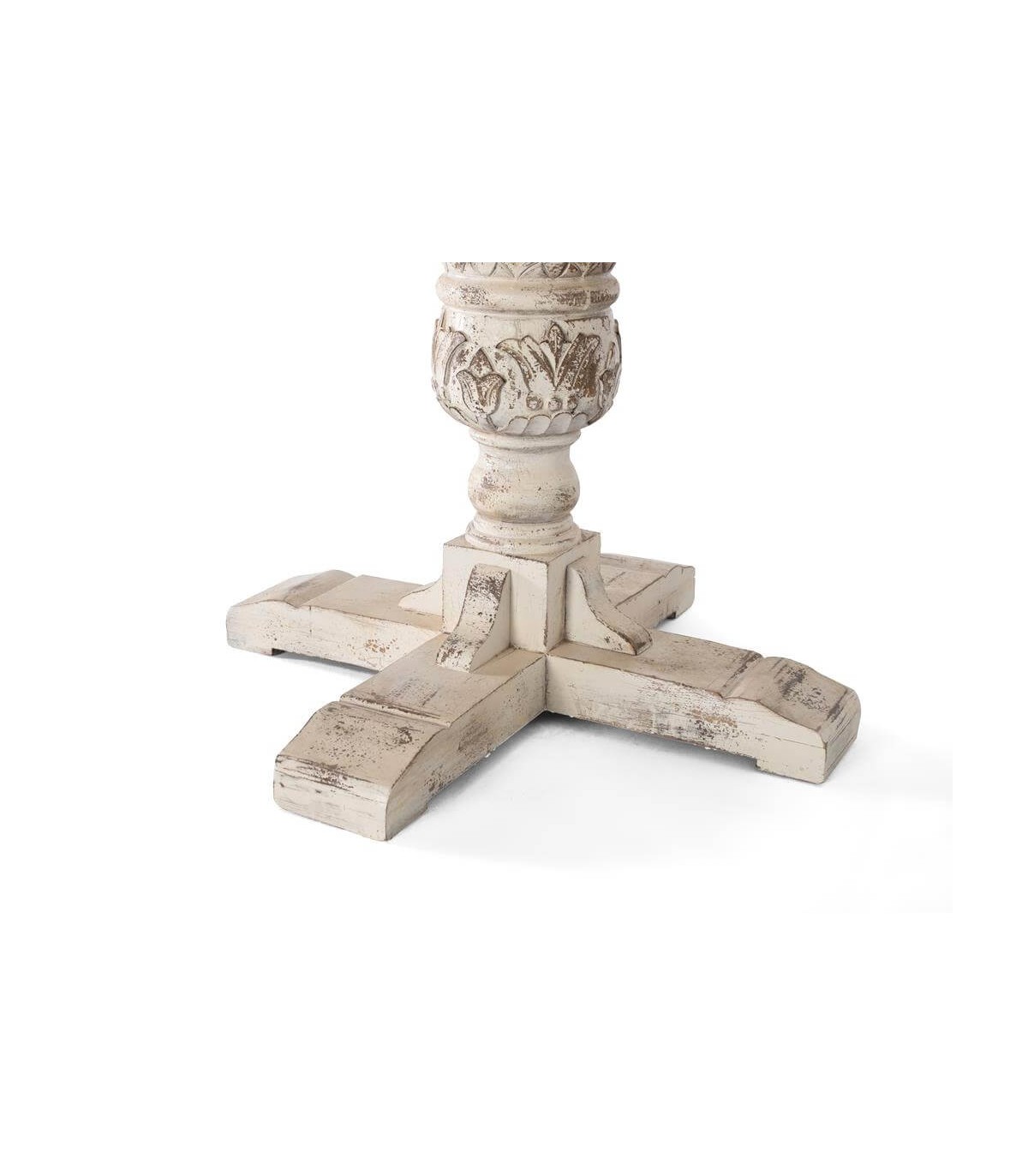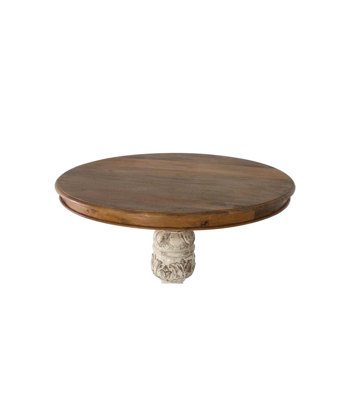 Mesa de comedor redonda, realizada artesanalmente en madera de mango, pie tallado acabado blanco rozado y tapa natural con un tono miel.
