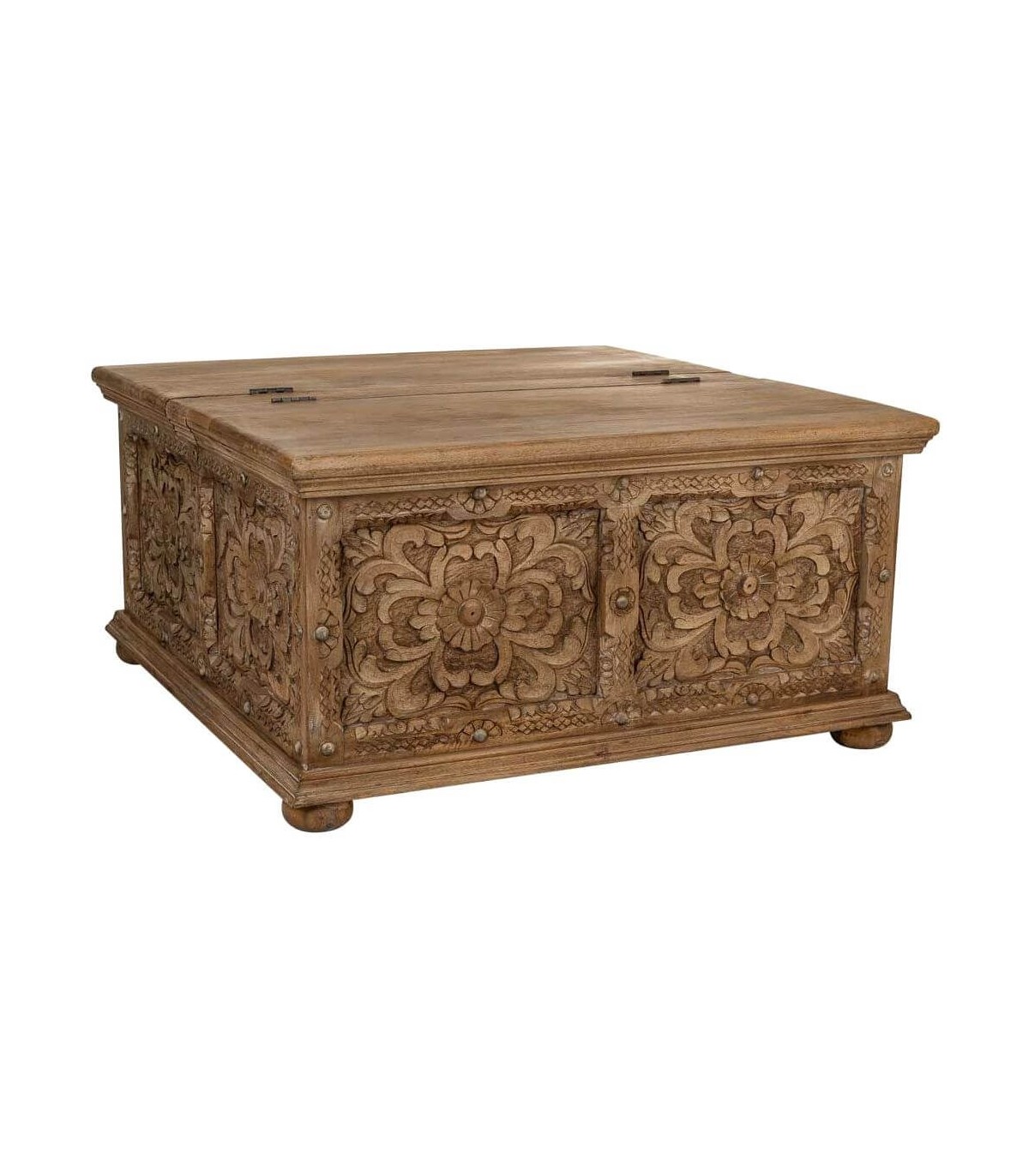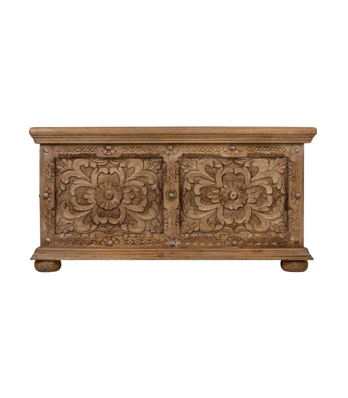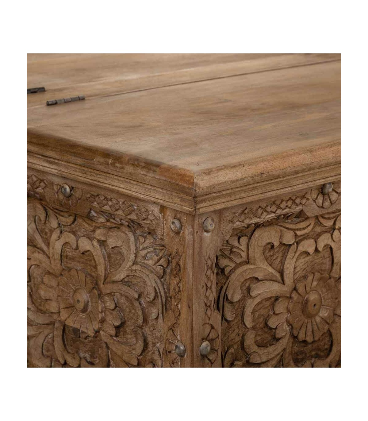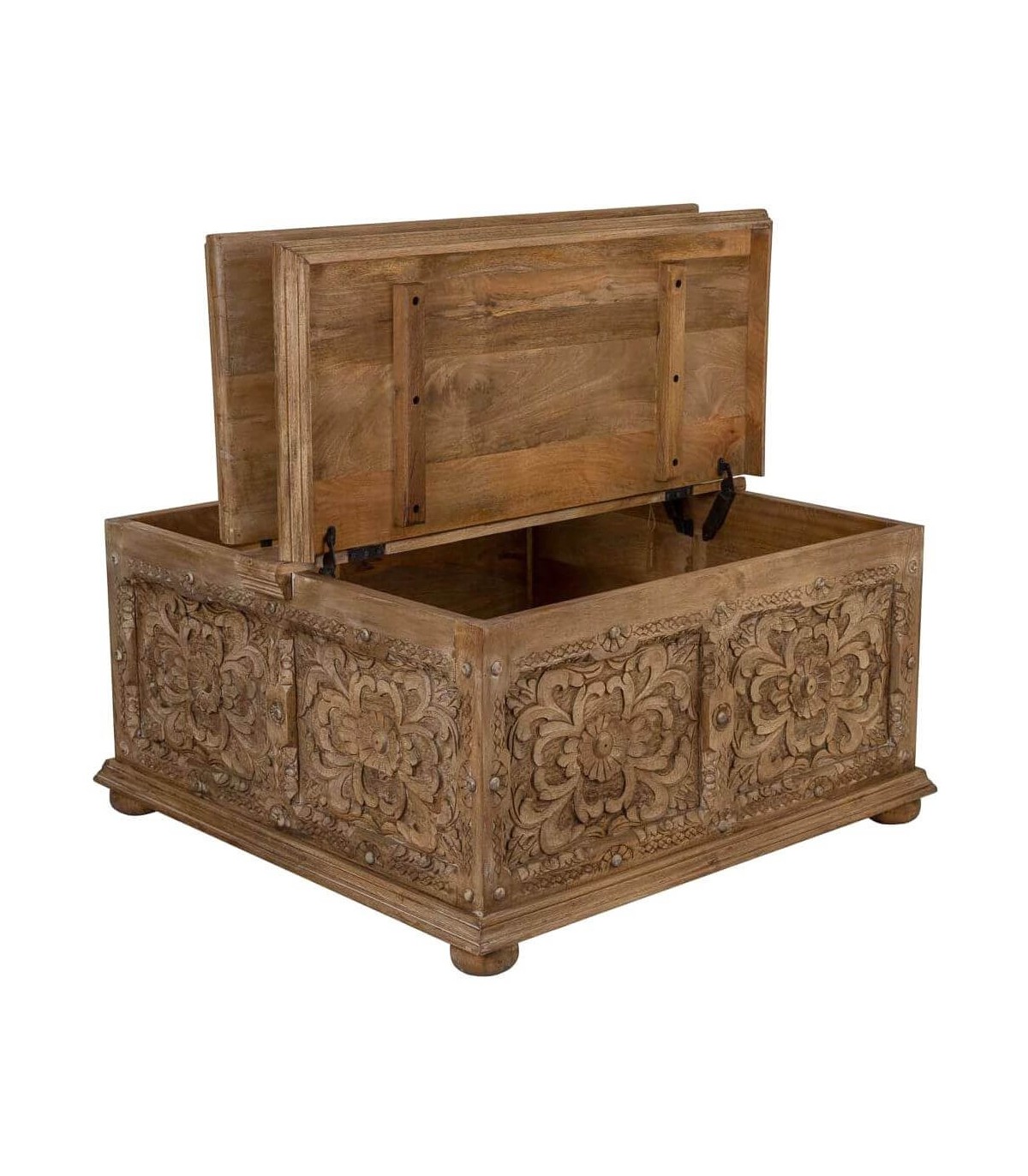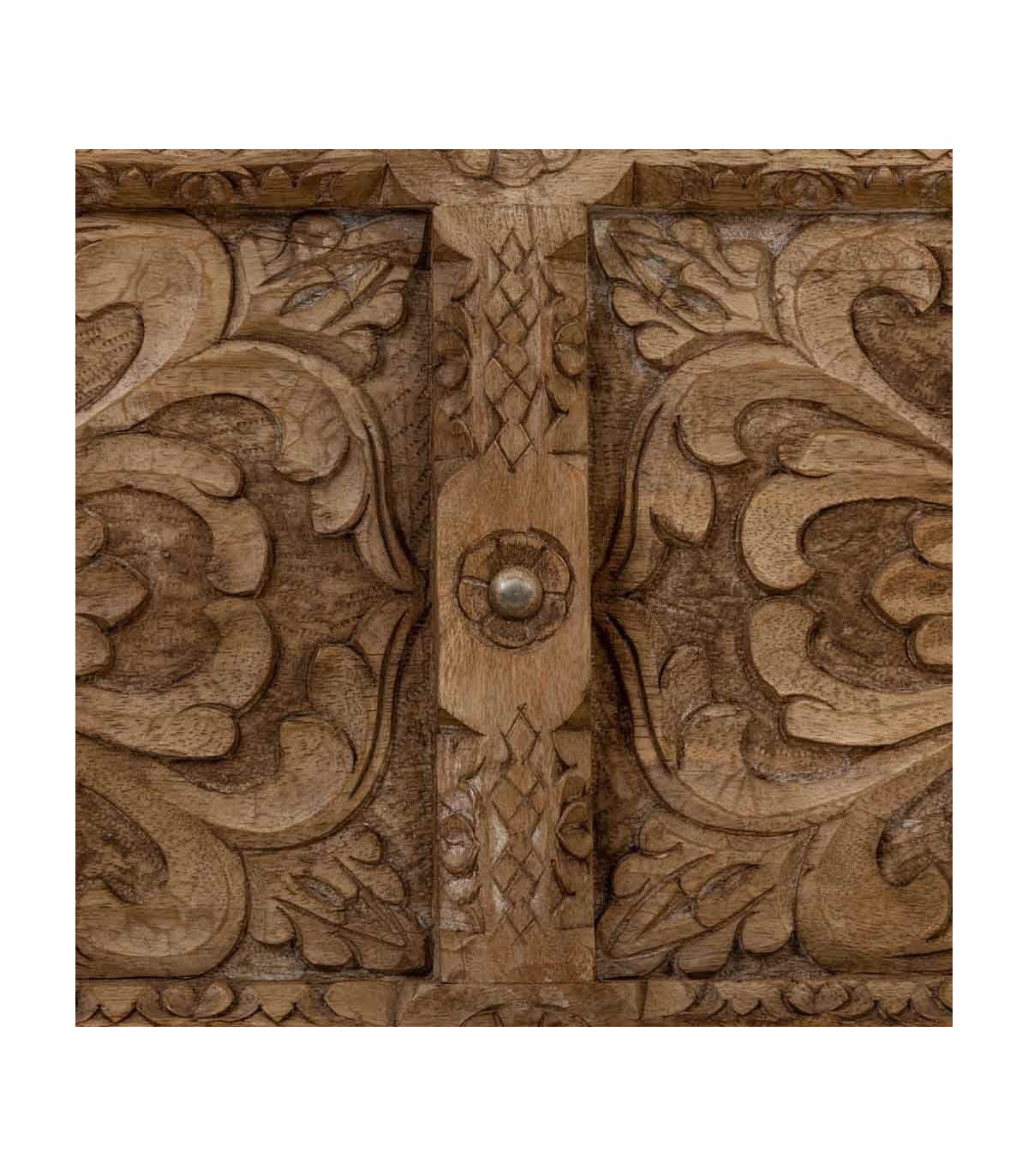 Mesita de centro tipo baúl de inspiración étnica aporta carácter y presencia al espacio gracias a su diseño artesanal y proporciones equilibradas. La madera maciza de mango transmite solidez y una sensación de mueble robusto trabajado con detalle. Los paneles tallados a mano crean una textura decorativa rica que define su identidad visual.