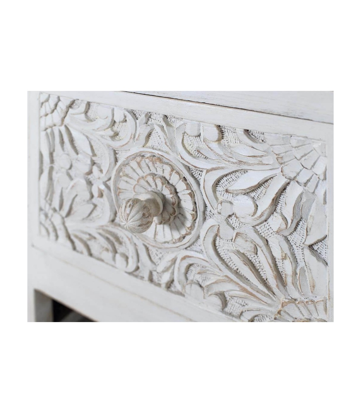 Mesita de noche estilo étnico, con 2 cajones, realizada en madera tallada acabado blanco rozado, uno de los cajones está meticulosamente tallado a mano, presentando un diseño intrincado que añade un toque de artesanía y carácter único a la mesita.