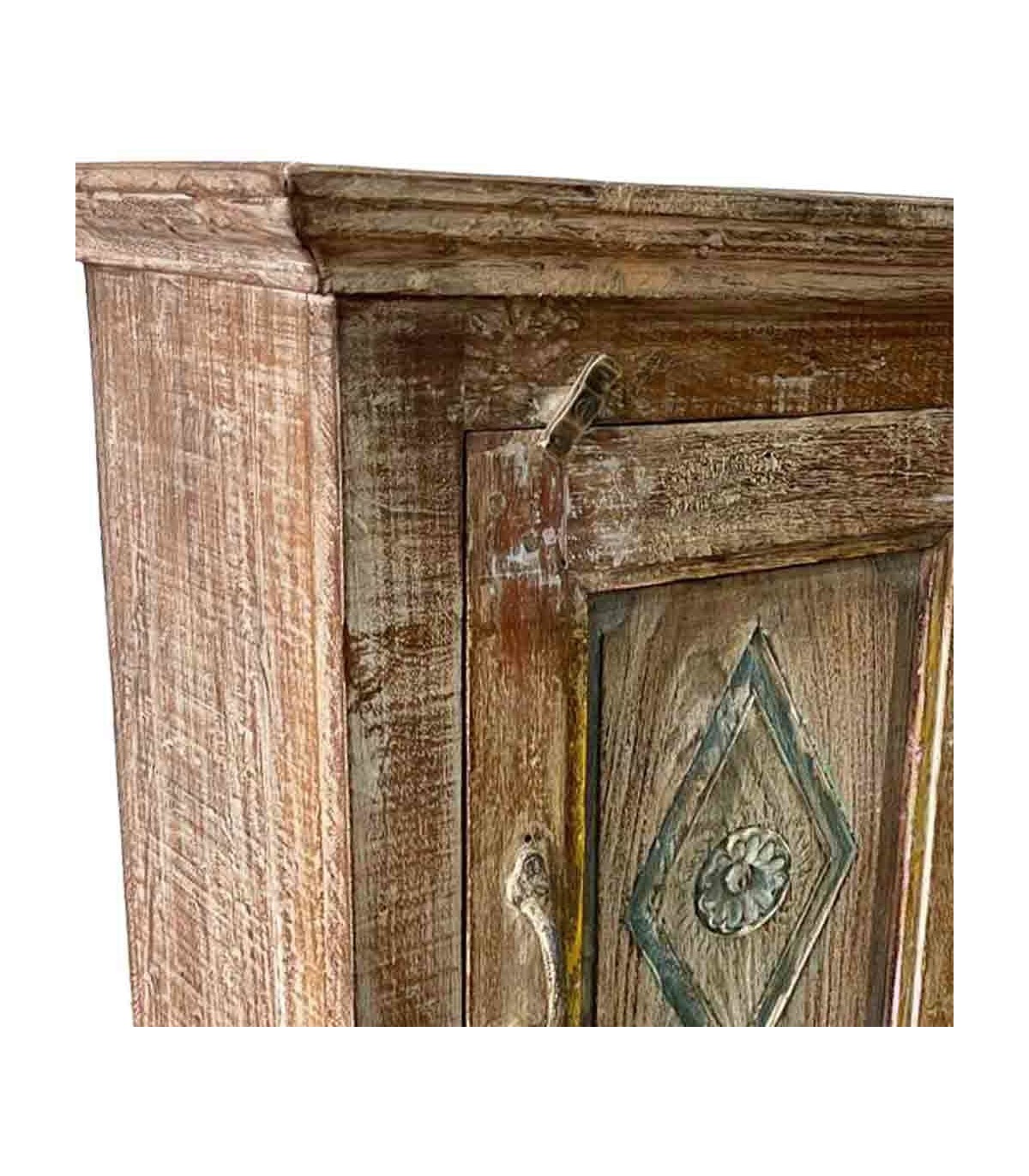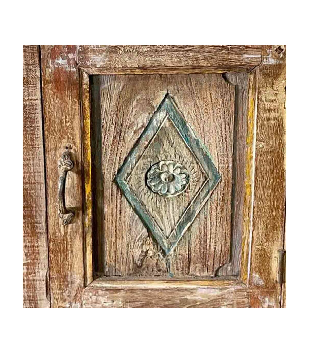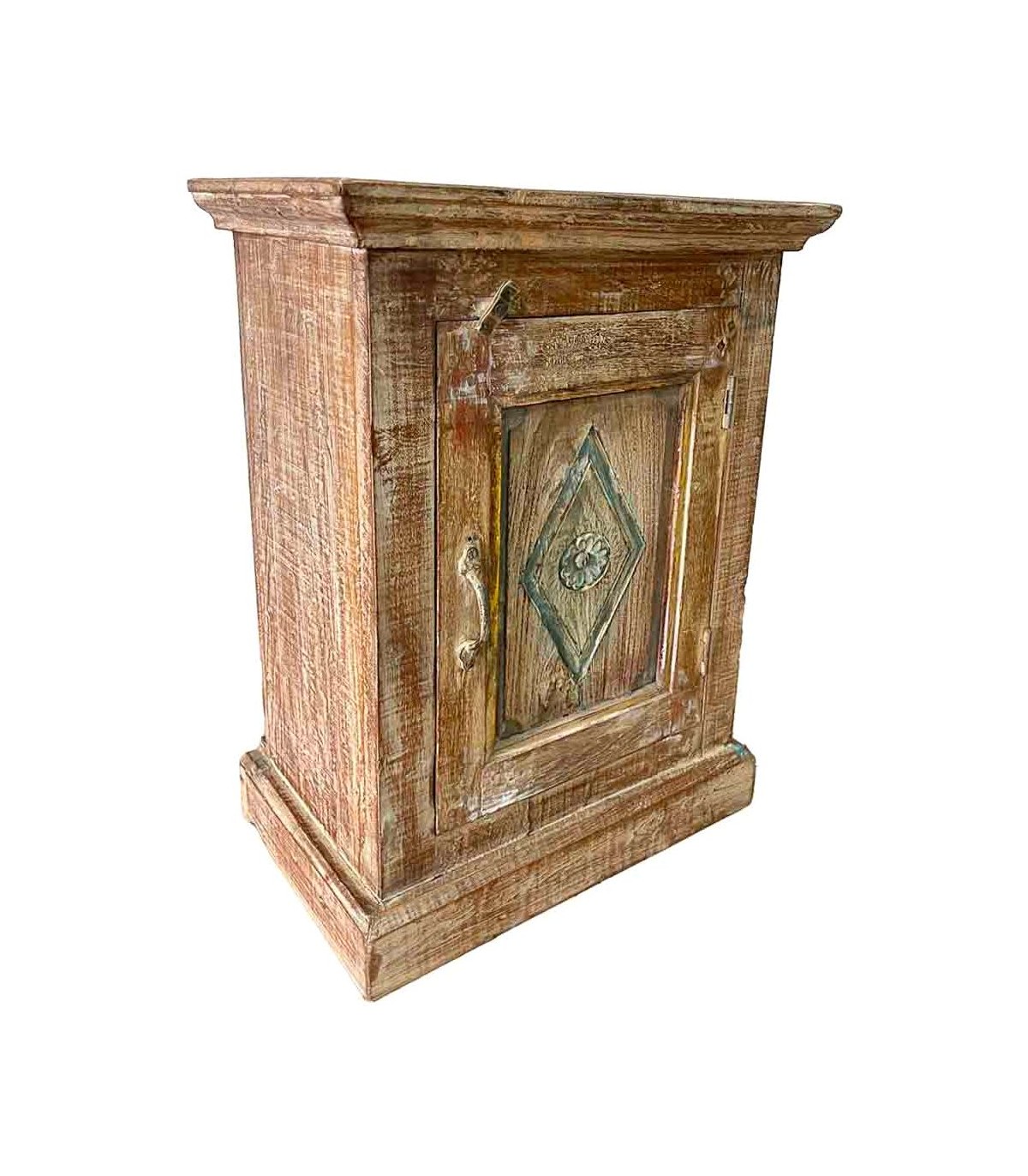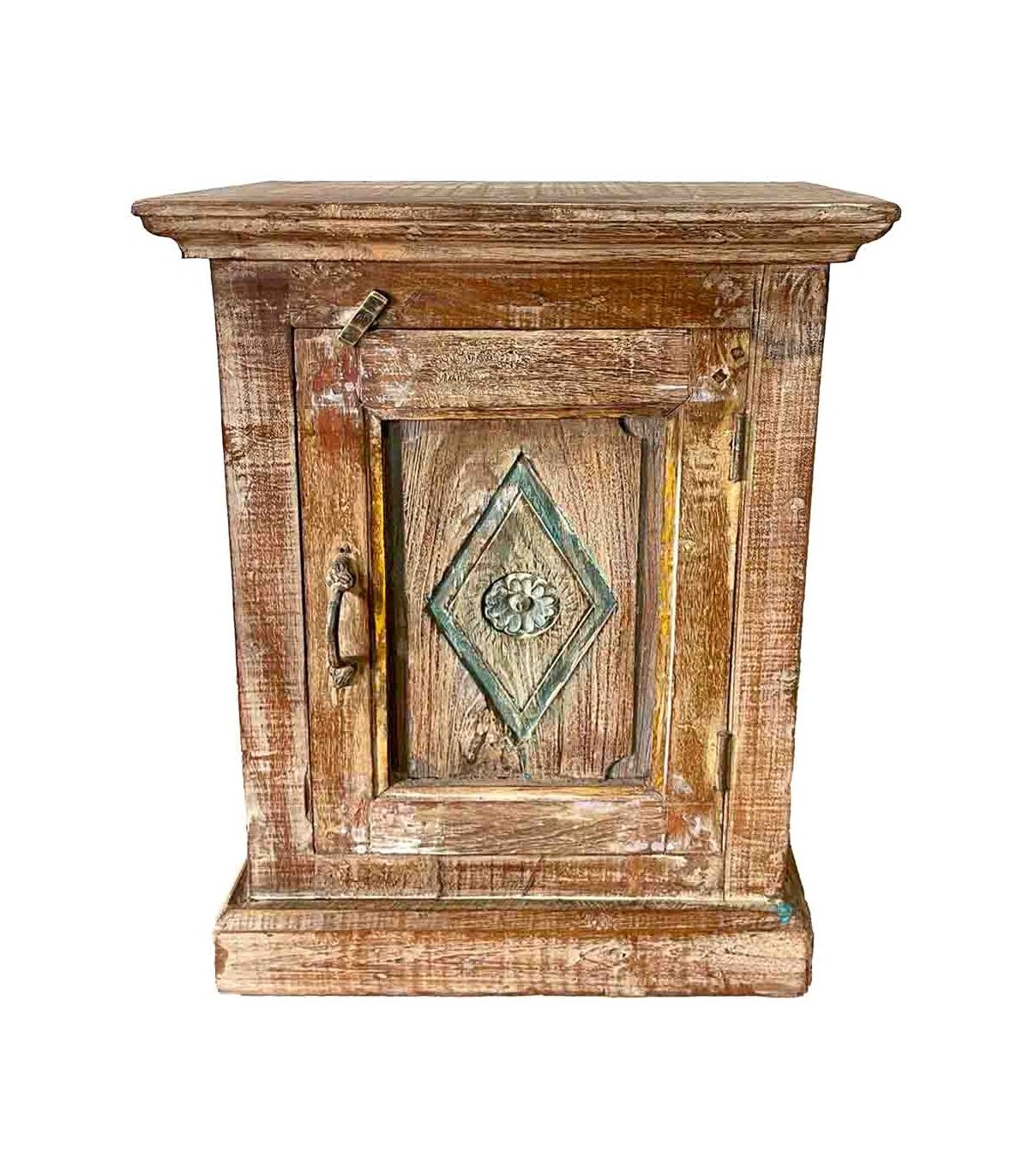 Mesita de Noche Antigua de Madera Maciza Tallada a Mano con Puerta – Acabado Natural con Matices en Verde y Amarillo – Pieza Única Artesanal