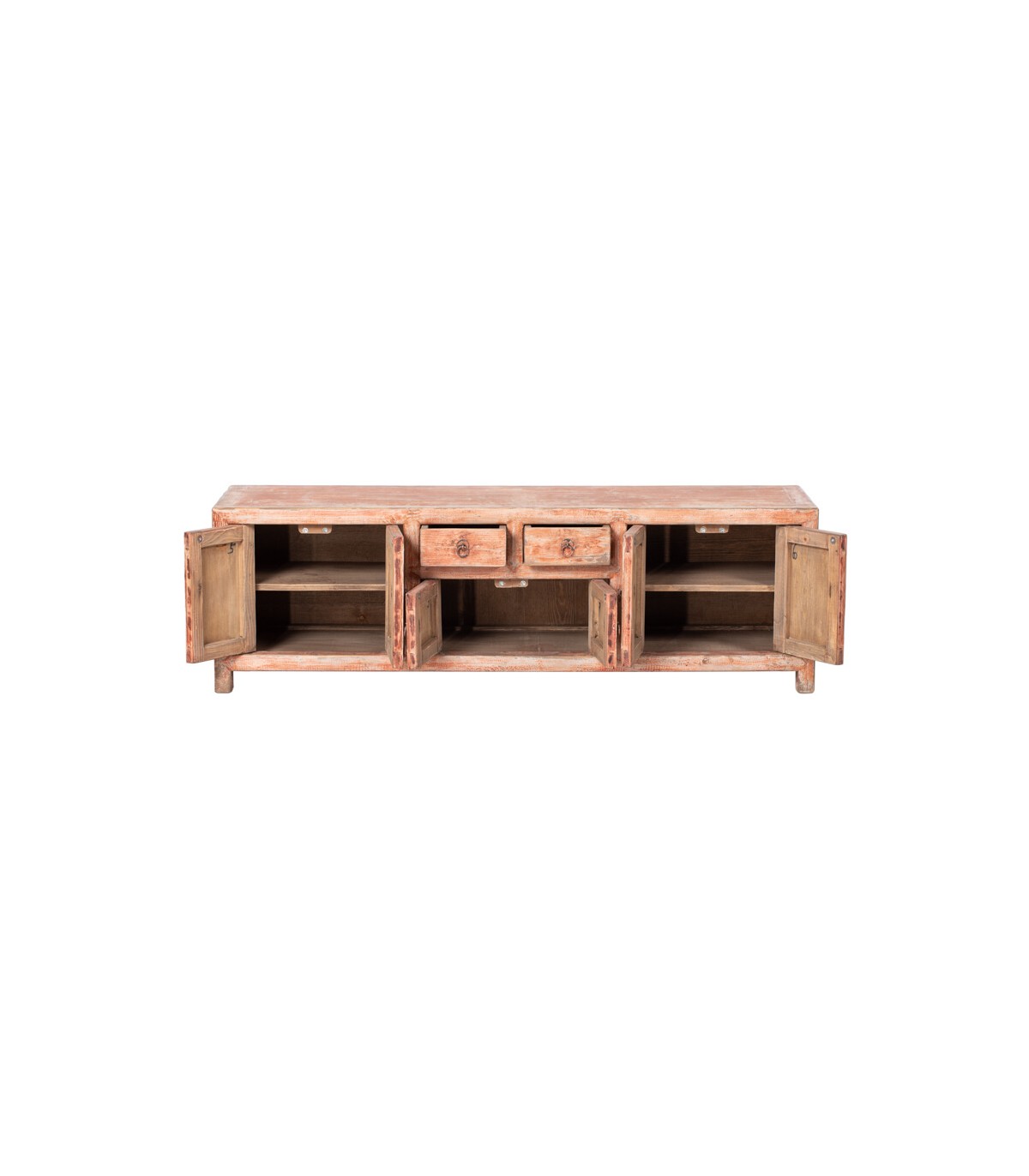 Mueble de TV de Estilo Oriental en Madera de Pino Natural Decapada en Color Teja con Tiradores de Bronce