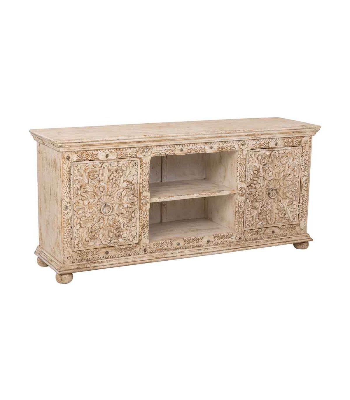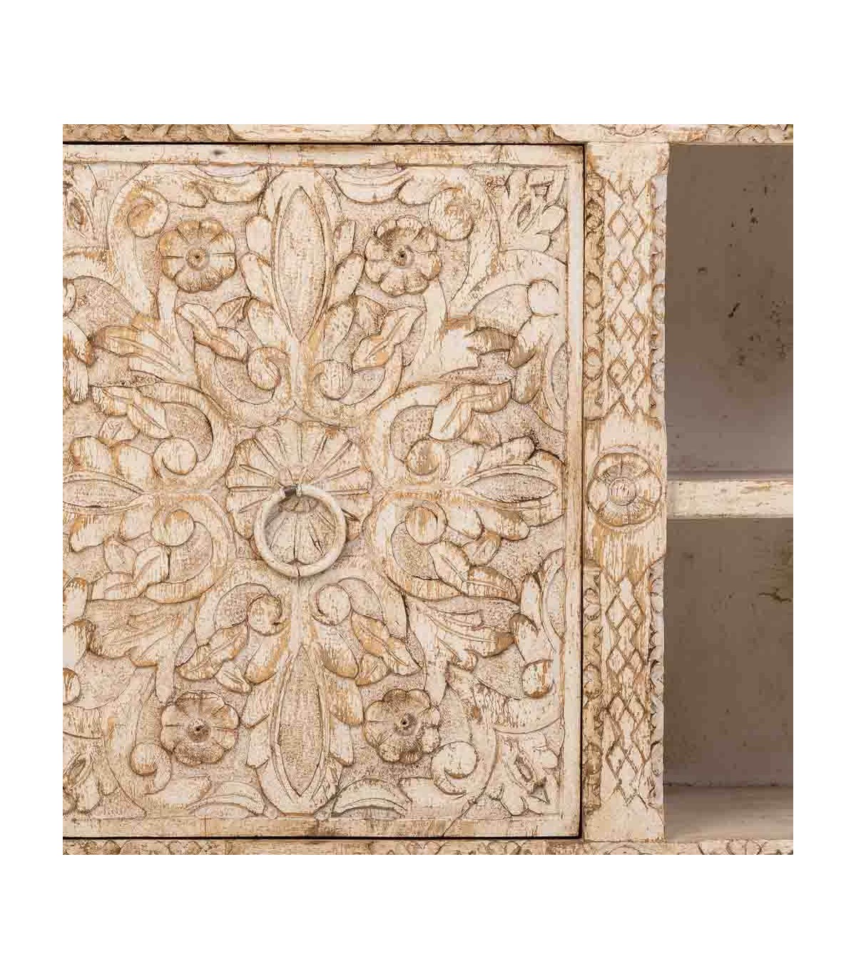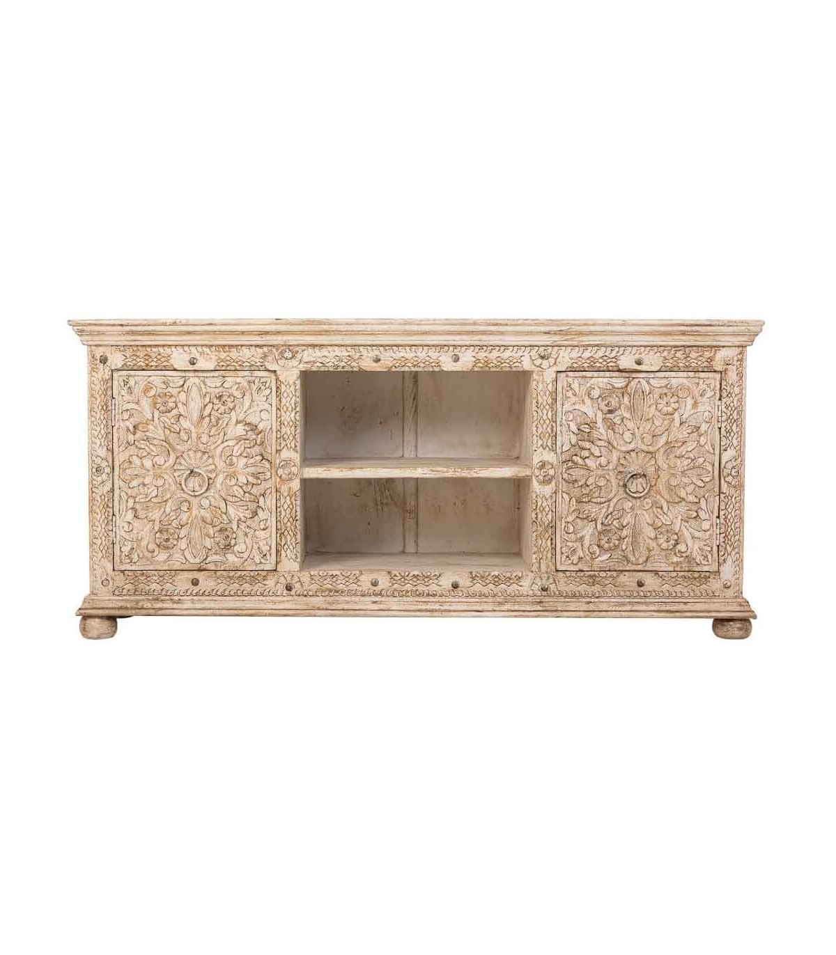 El acabado blanco roto patinado realza el relieve del tallado y aporta luminosidad al conjunto. Incorpora estantes centrales abiertos, ideales para dispositivos multimedia, y tiradores metálicos en tono natural que completan su estilo exótico con elegancia serena. Un mueble perfecto para ambientes boho, rústicos o eclécticos con alma artesanal.