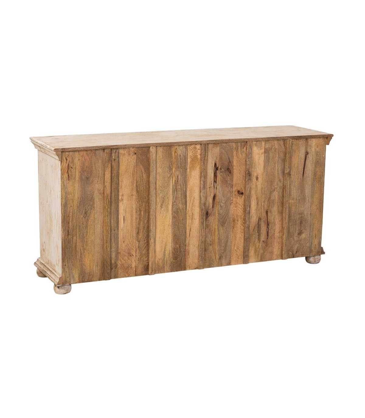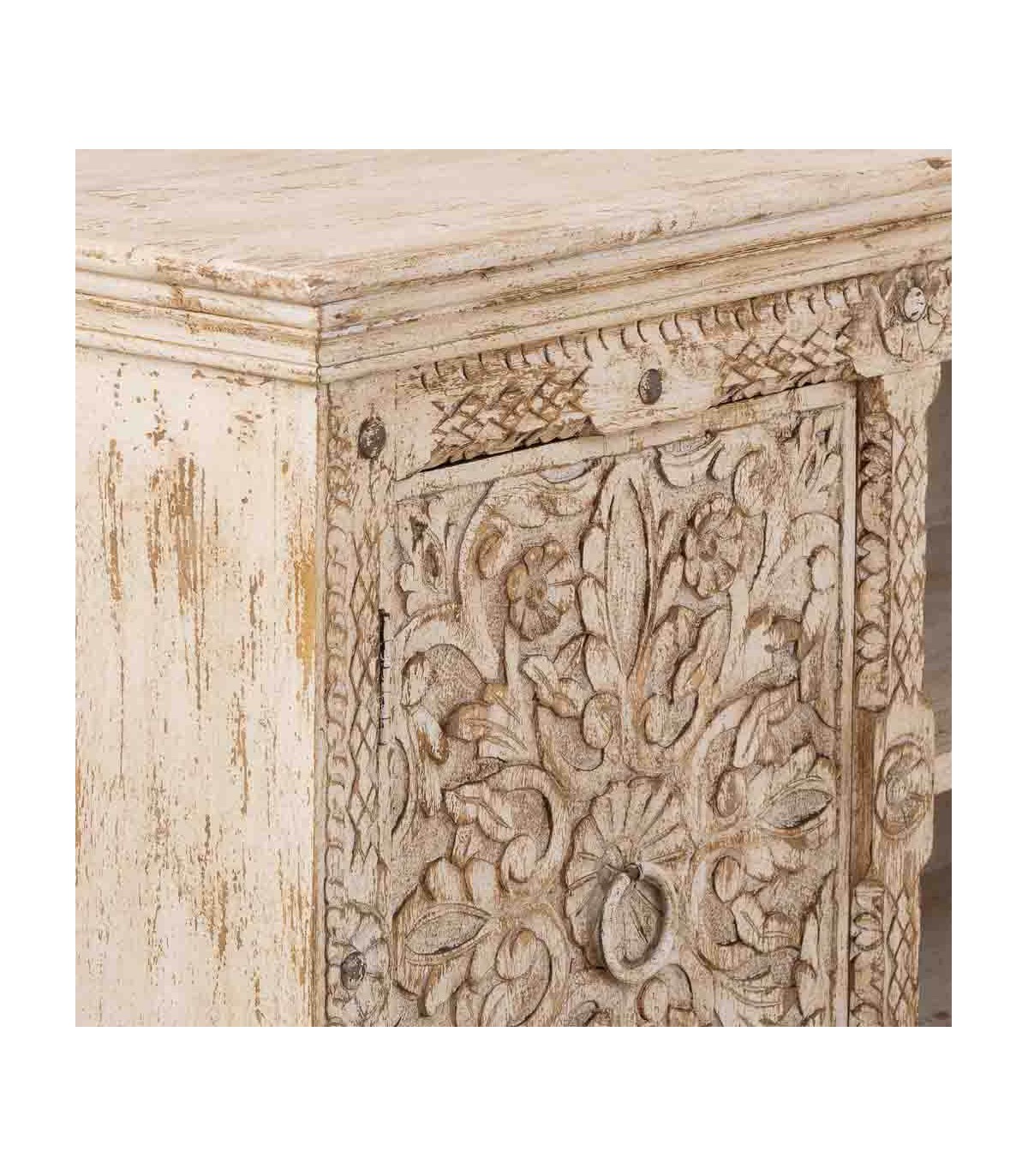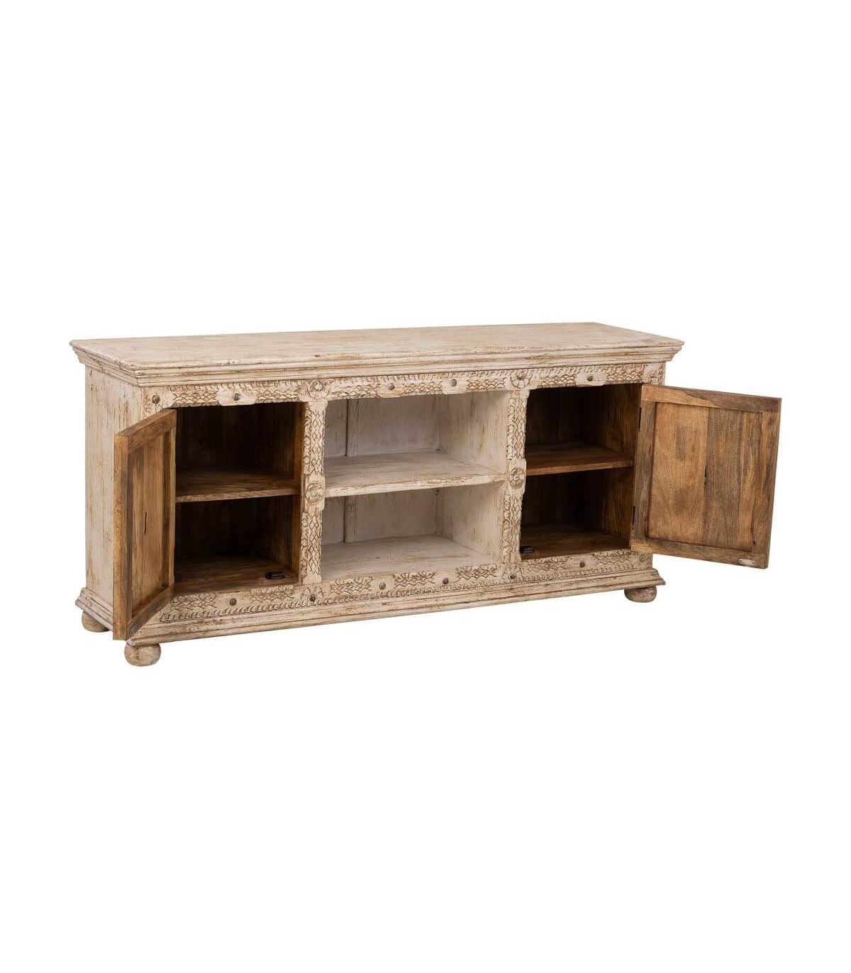 El acabado blanco roto patinado realza el relieve del tallado y aporta luminosidad al conjunto. Incorpora estantes centrales abiertos, ideales para dispositivos multimedia, y tiradores metálicos en tono natural que completan su estilo exótico con elegancia serena. Un mueble perfecto para ambientes boho, rústicos o eclécticos con alma artesanal.