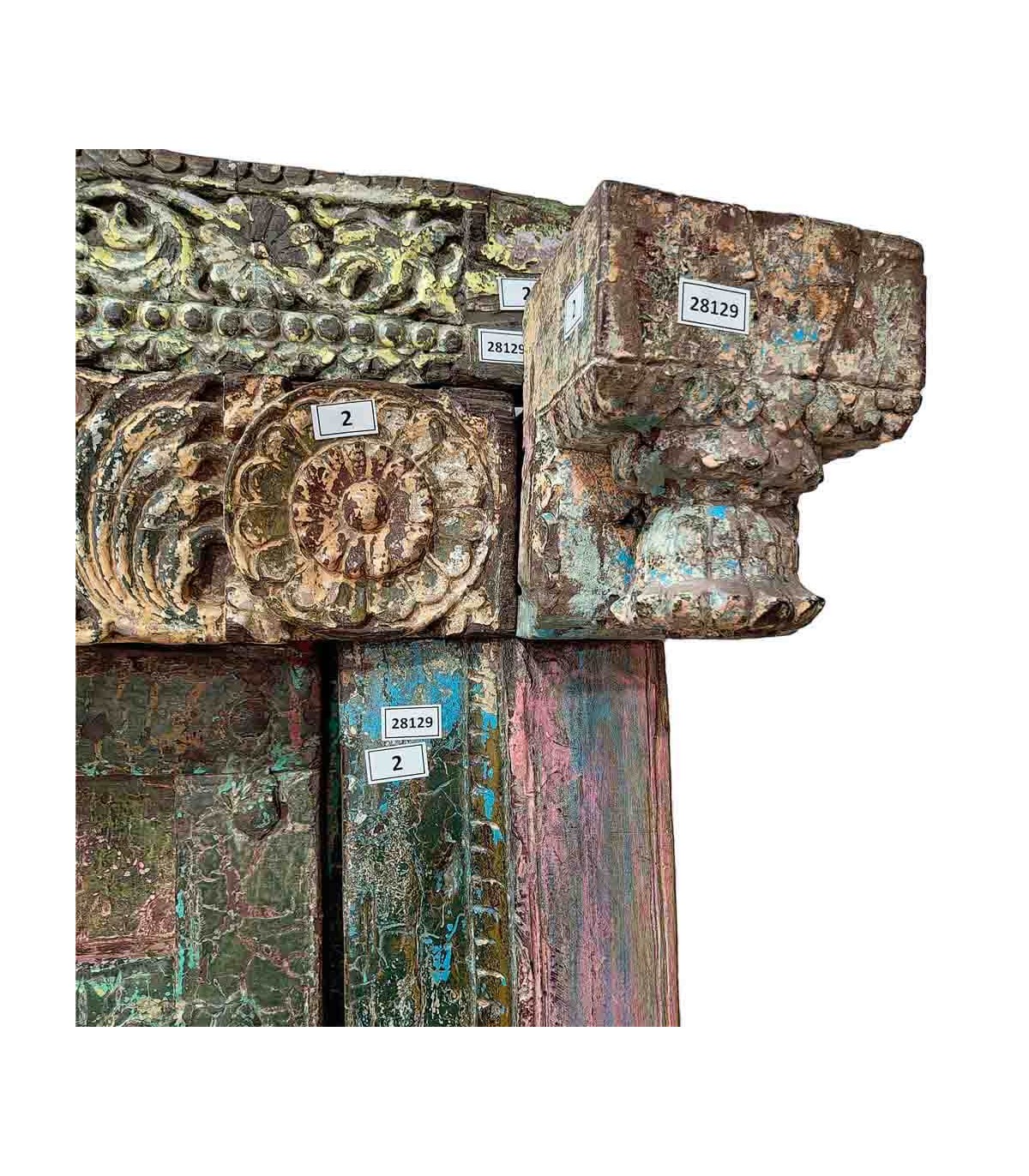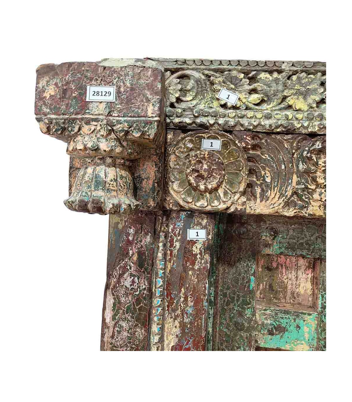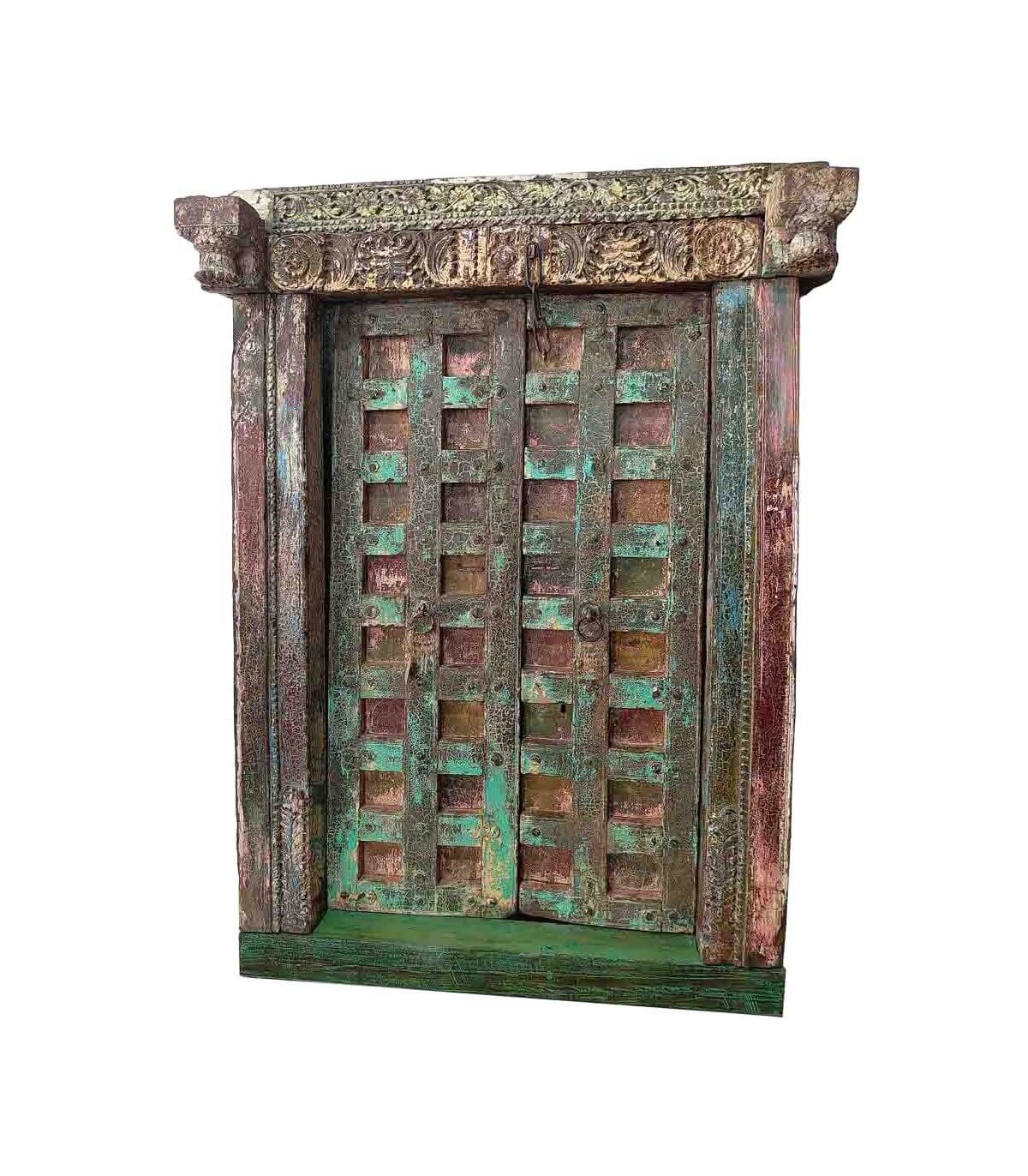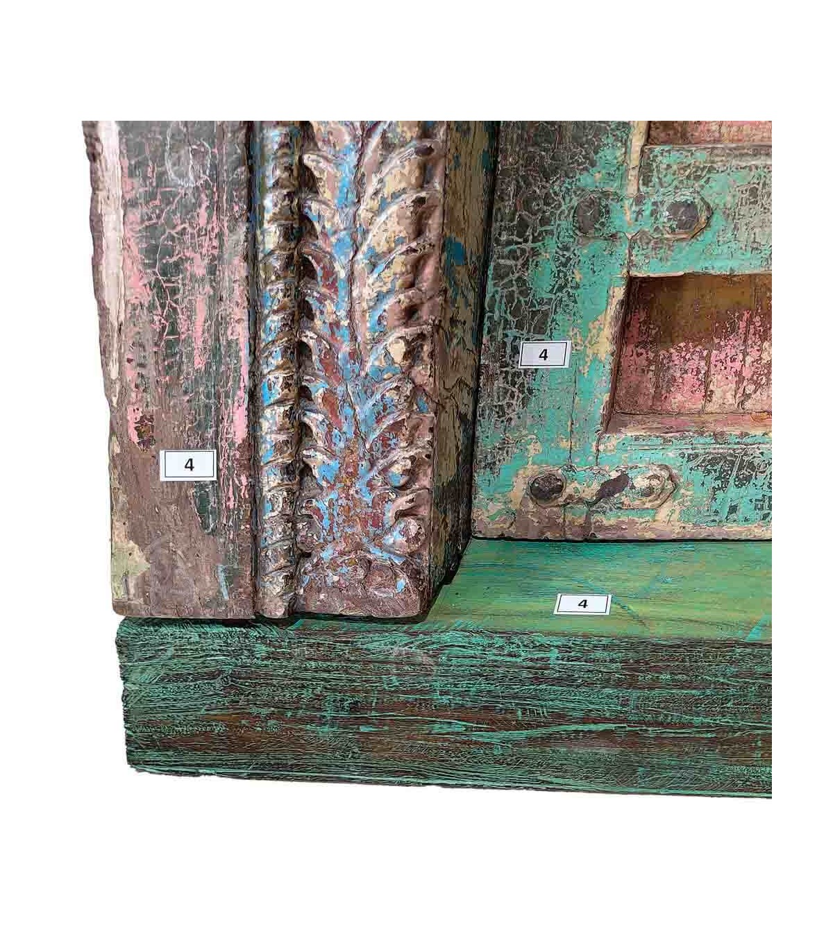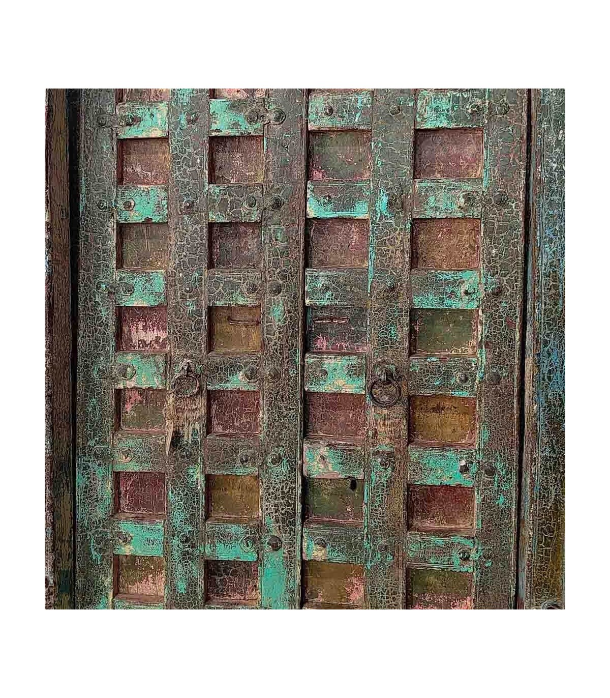 Impresionante puerta antigua de madera maciza tallada a mano, con un acabado decapado en tonos verdes y multicolor. Su meticuloso trabajo artesanal y detalles en metal forjado aportan un carácter único, ideal para decorar interiores o exteriores con un aire exótico y atemporal. Cada pieza es exclusiva, con variaciones en tonalidad, forma e imperfecciones naturales que realzan su autenticidad. Perfecta para proyectos de decoración con encanto vintage y rústico.