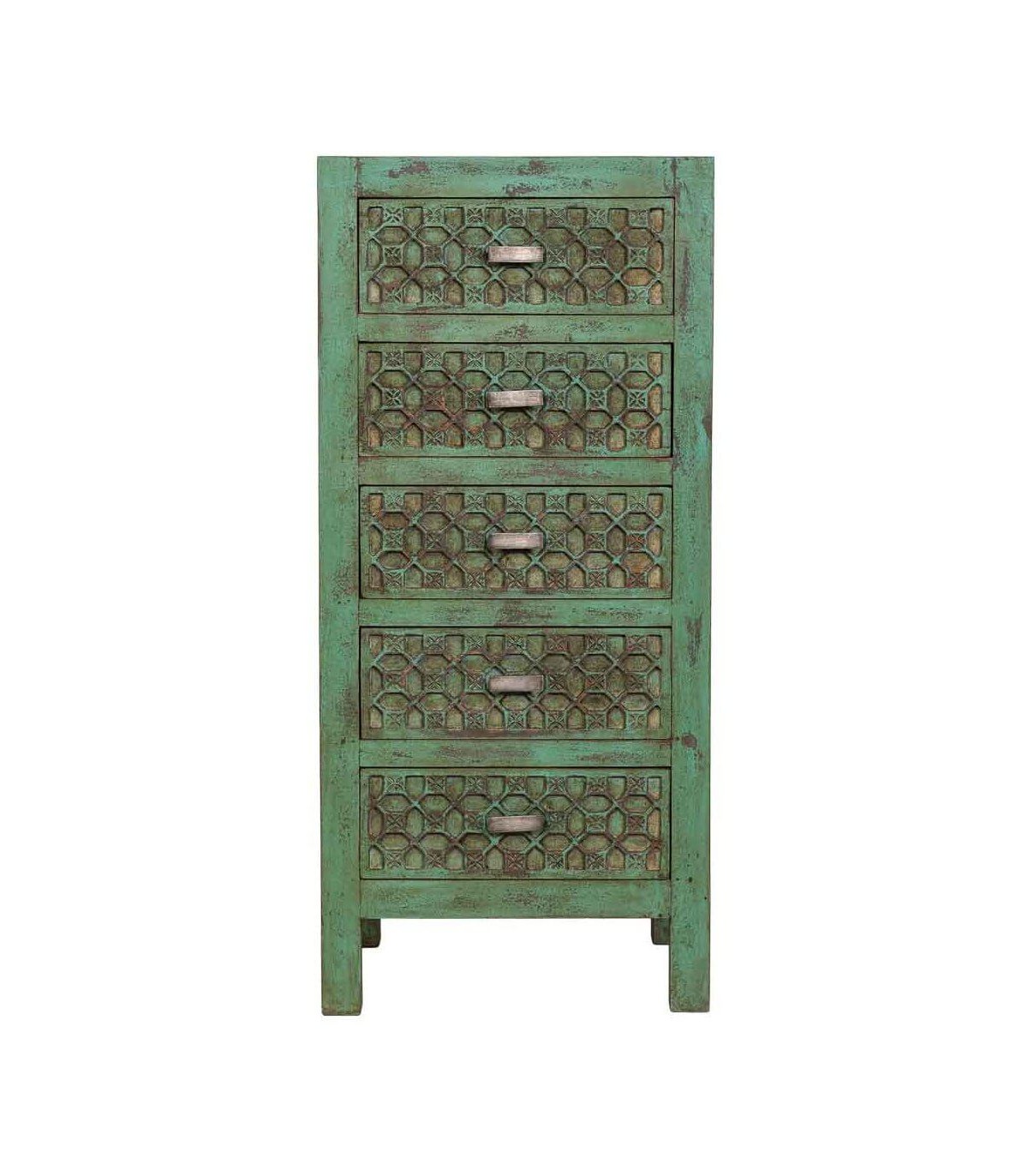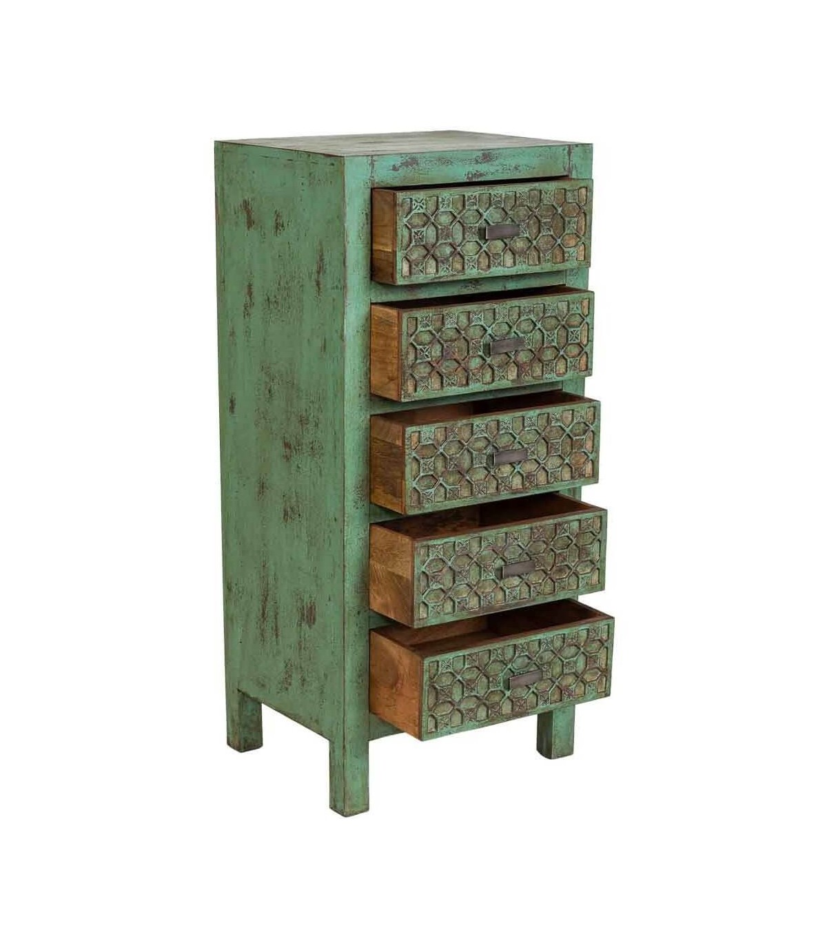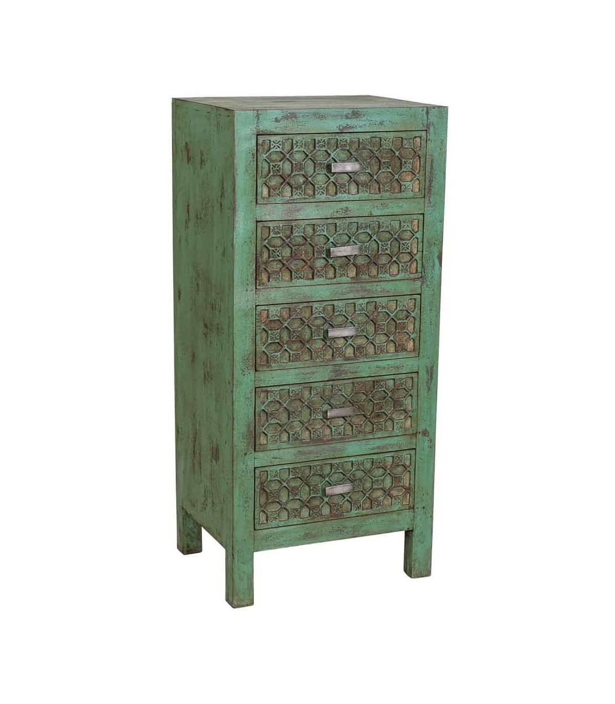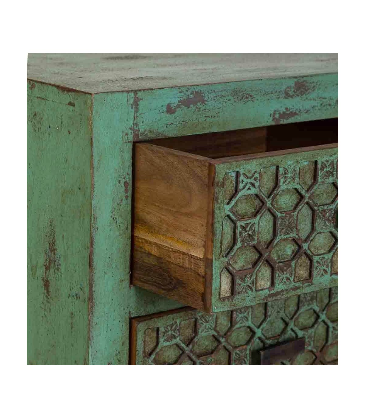 Los cinco cajones muestran un relieve geométrico elaborado a mano que añade fuerza decorativa sin resultar pesado, creando un equilibrio entre autenticidad y elegancia. Pieza que destaca por su diseño artesanal y personalidad rotunda, perfecta para sumar calidez y estilo a cualquier espacio.