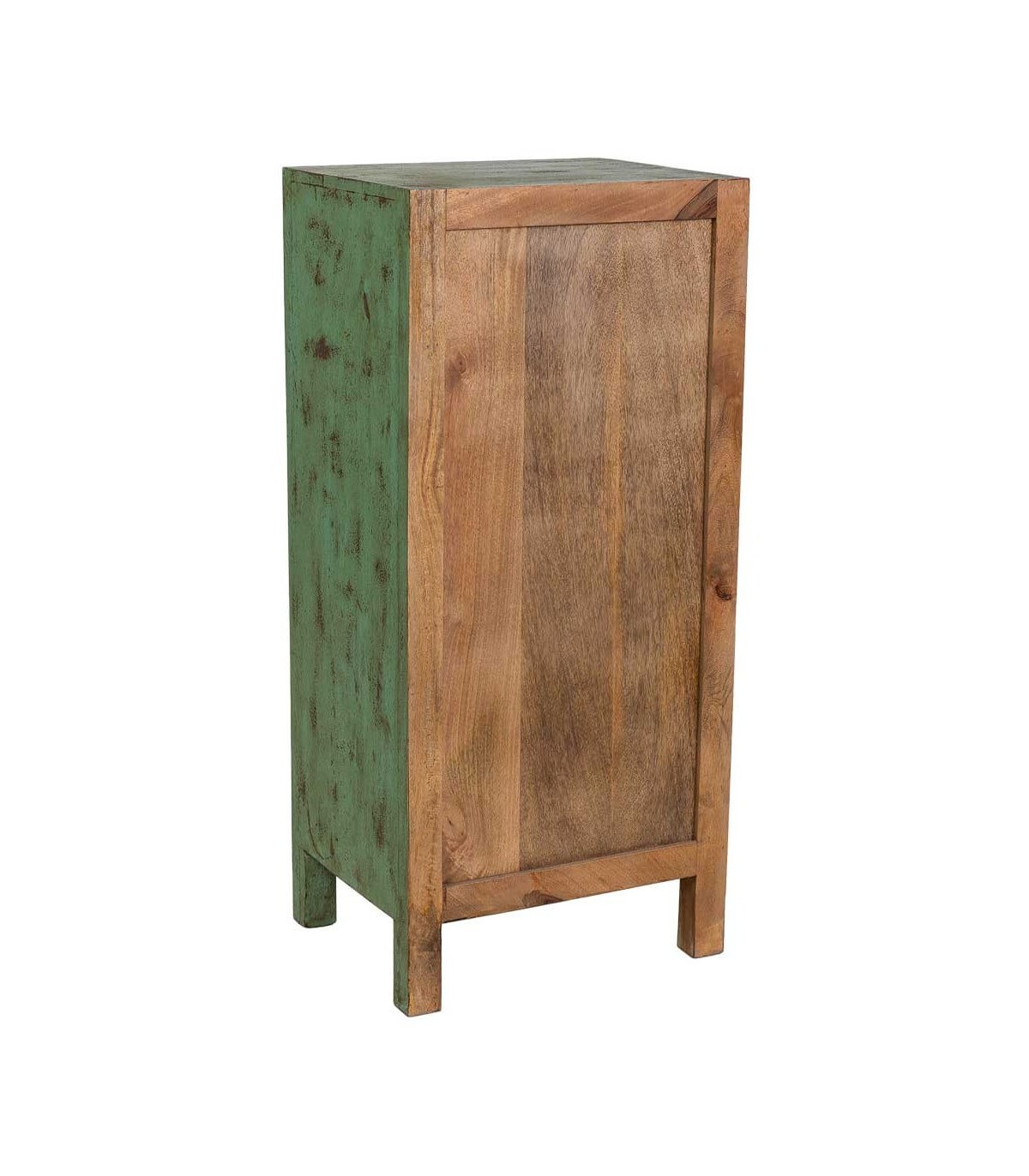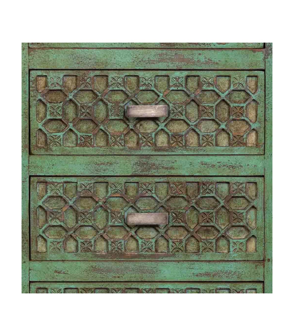 Sinfonier de madera maciza tallada que aporta una presencia intensa y llena de carácter en ambientes étnicos con personalidad propia. El acabado en verde decapado oscuro revela un trabajo artesanal rico en matices que deja ver la textura de la madera y aporta una profundidad visual especial.