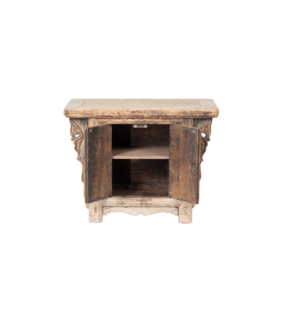 Acabado, madera natural tallada y decorada desgastada, tiradores bronce a juego. Fabricación artesanal. entendemos las variaciones de tonalidad, tamaño y forma o ciertas imperfecciones (grietas, nudos, marcas) como un valor añadido que la convierten en pieza única.