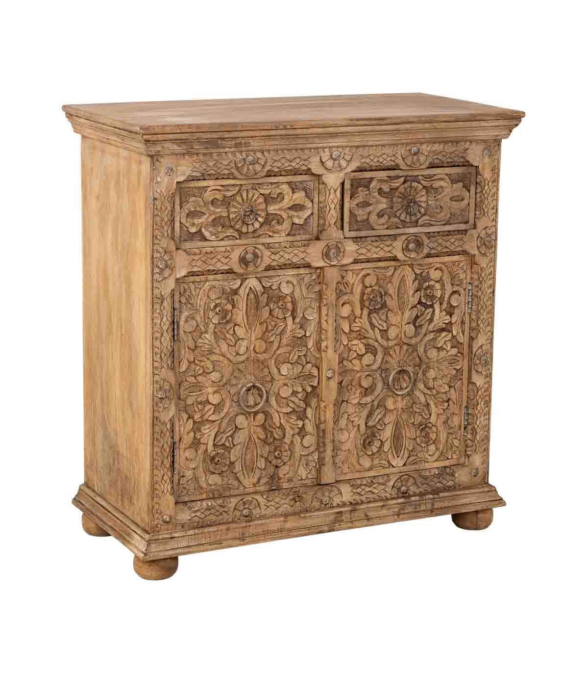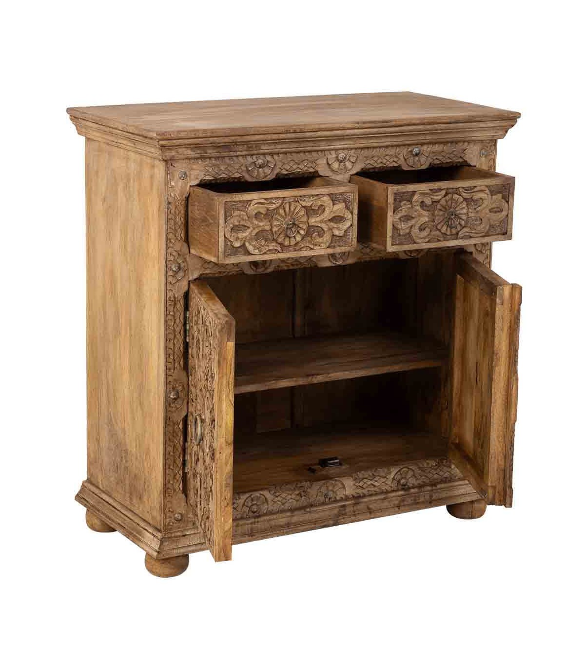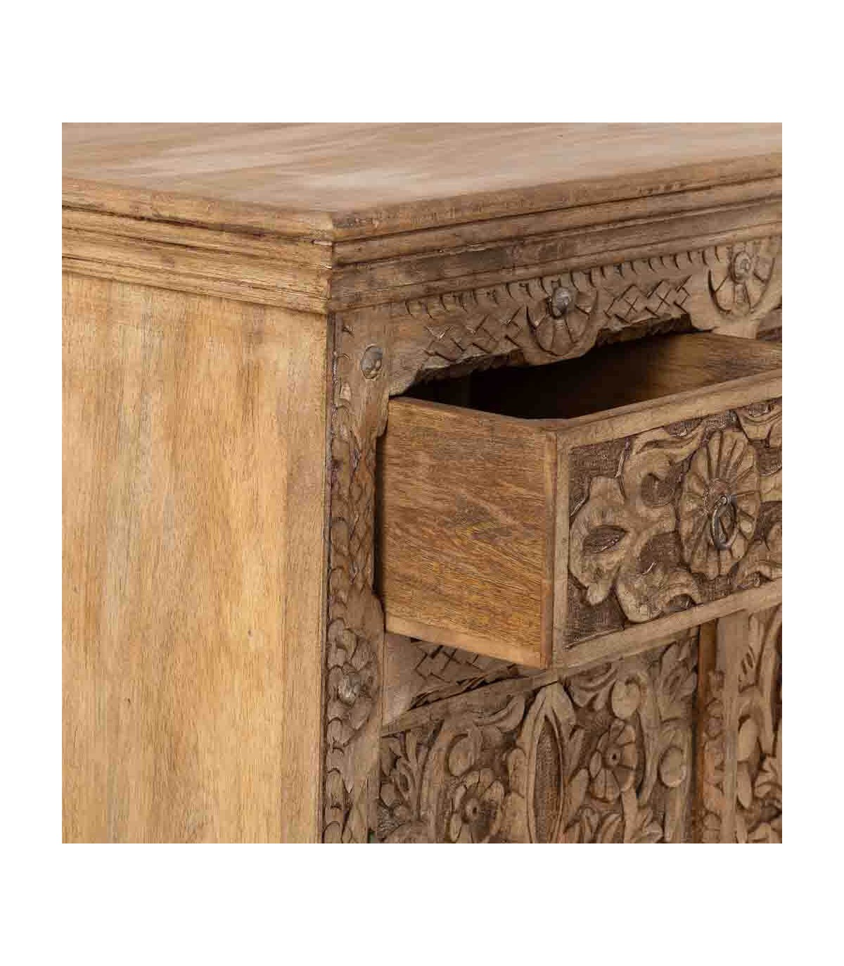 Este taquillón de madera maciza de mango es una pieza singular que combina fuerza, textura y detalle artesanal. El delicado tallado floral de inspiración étnica cubre el frente y le aporta carácter propio. Cuenta con dos puertas, dos cajones superiores con aplicaciones metálicas y una balda interior funcional.