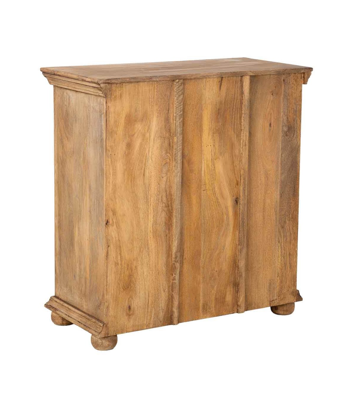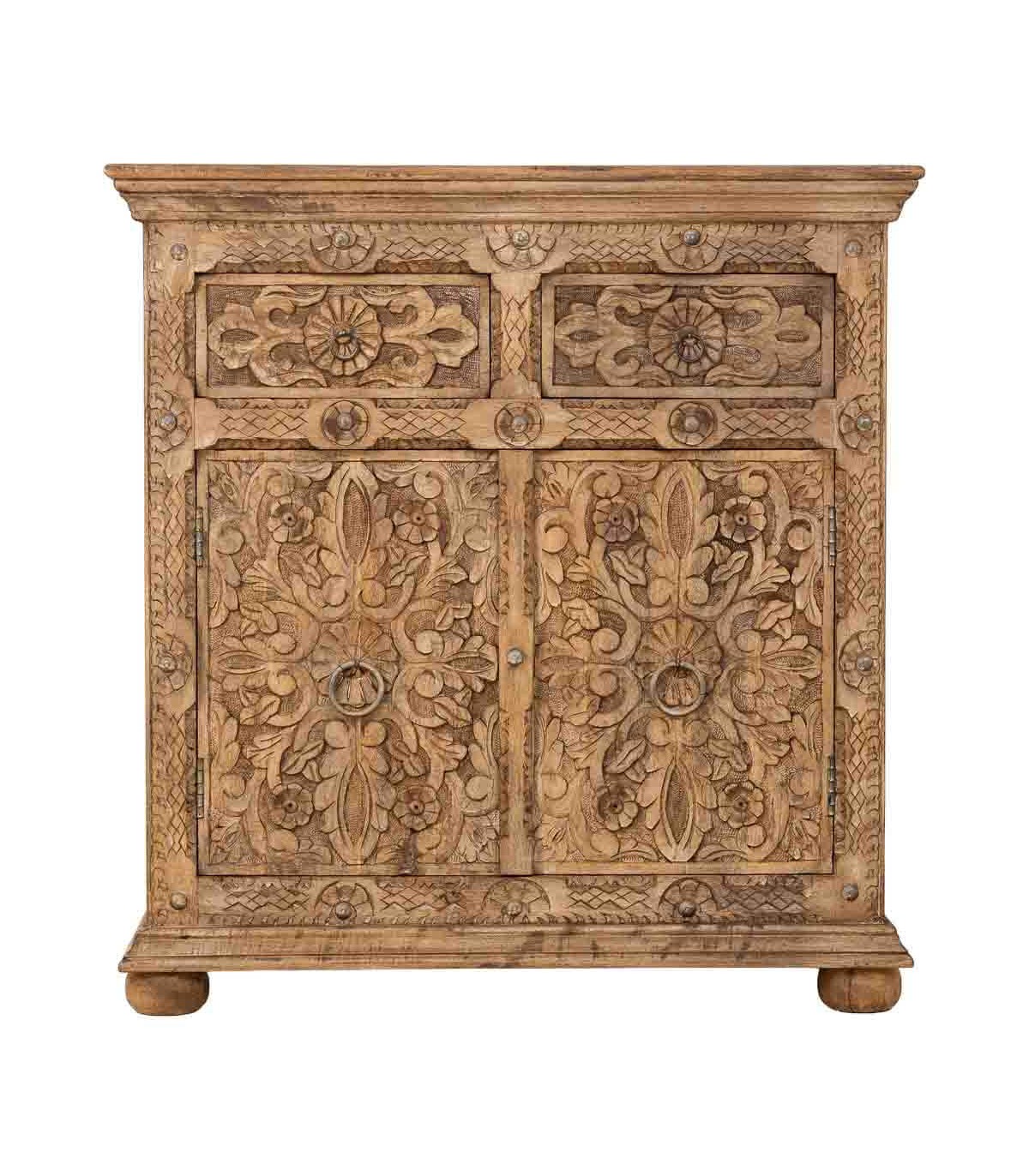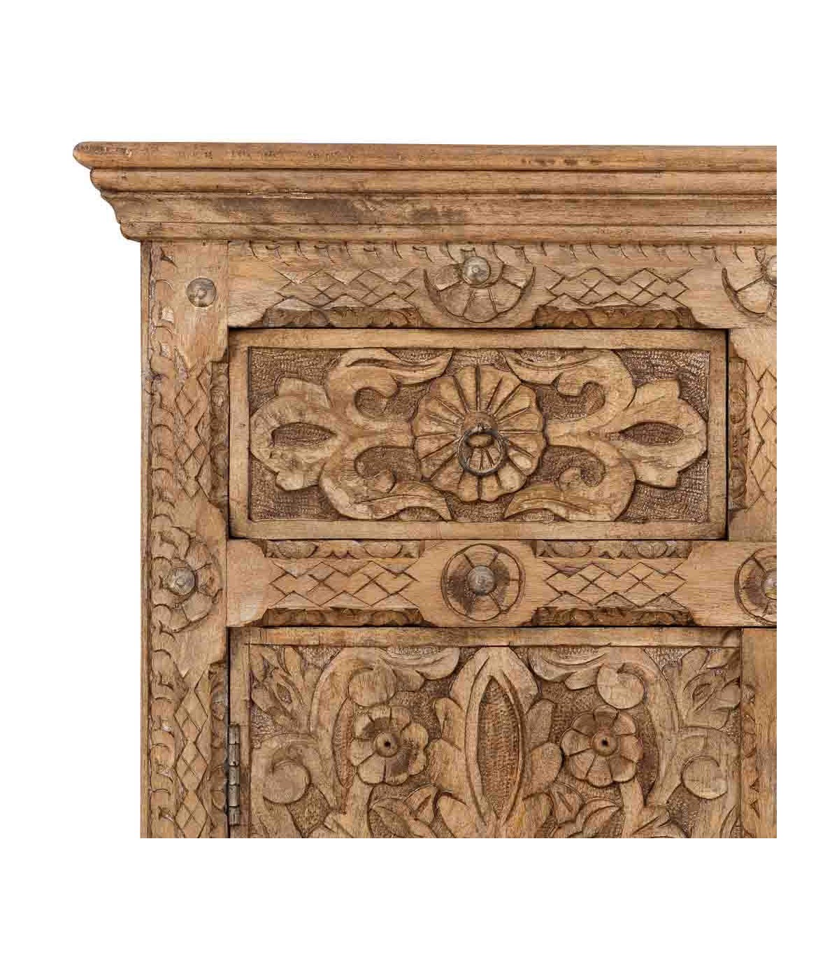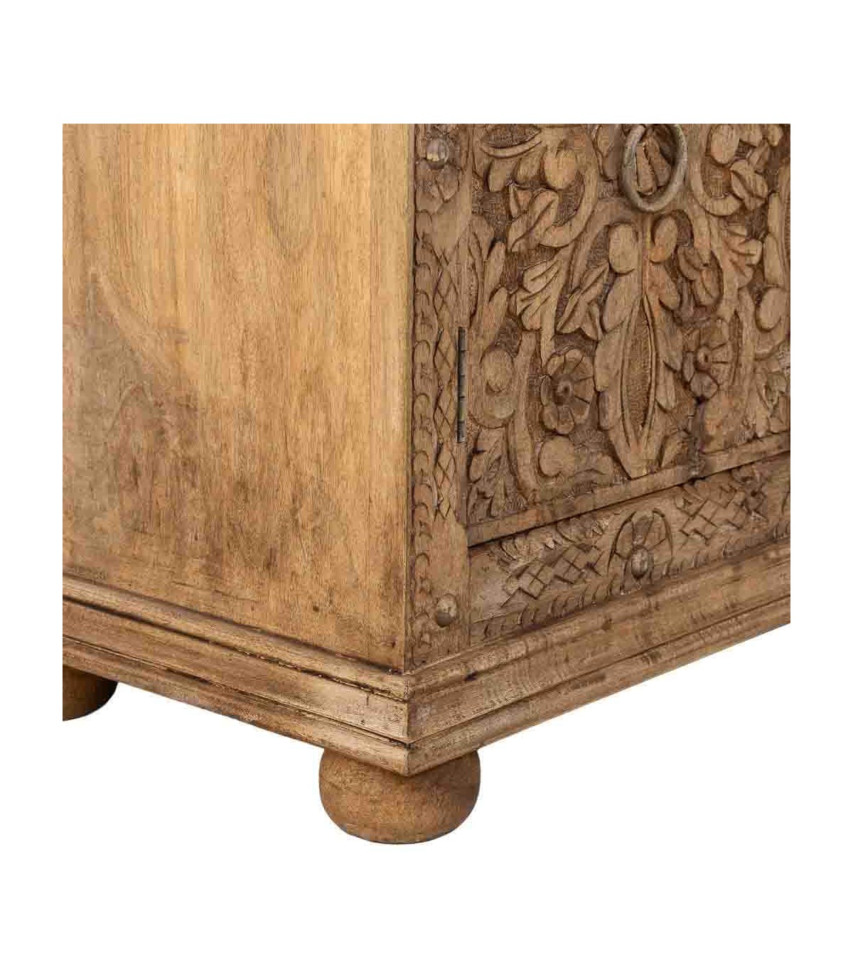 Este taquillón de madera maciza de mango es una pieza singular que combina fuerza, textura y detalle artesanal. El delicado tallado floral de inspiración étnica cubre el frente y le aporta carácter propio. Cuenta con dos puertas, dos cajones superiores con aplicaciones metálicas y una balda interior funcional.