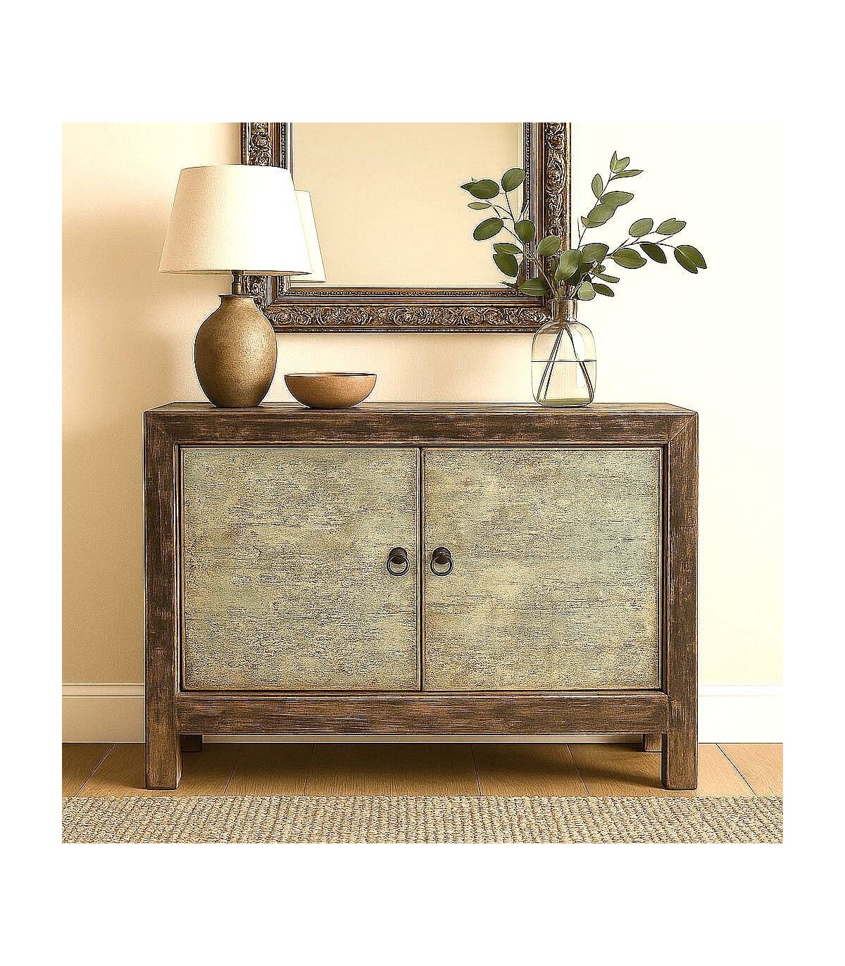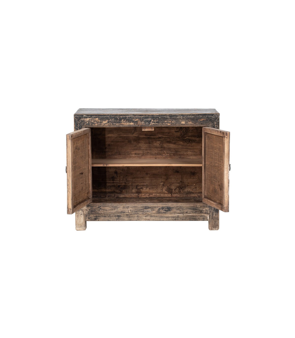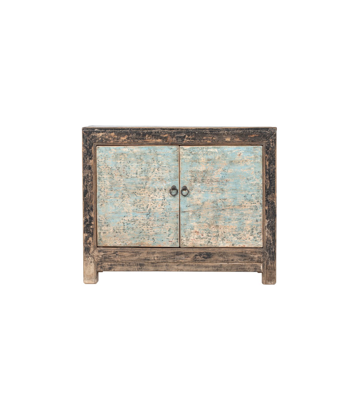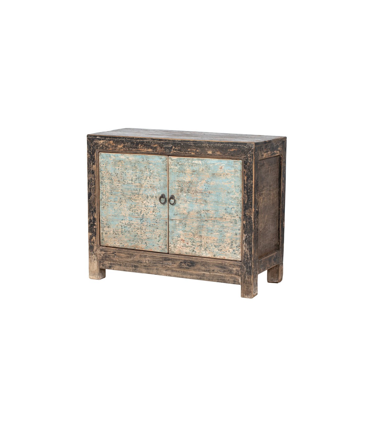 Taquillón de madera maciza con dos puertas decoradas en un evocador acabado decapado en negro y turquesa, que realza su aire antiguo y artesanal. La estructura sobria y los tiradores de metal negro evocan la estética de los muebles orientales tradicionales, con una pátina de uso que aporta autenticidad.