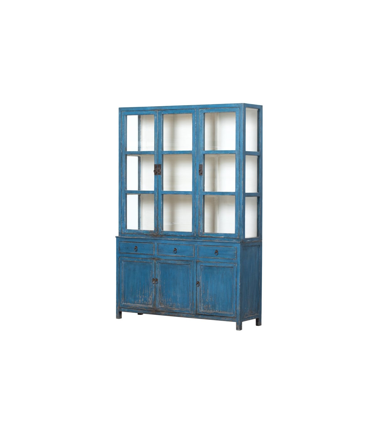 Vitrina Oriental de Madera Maciza Azul Decapada con Puertas de Cristal – Elegancia Artesanal para tu Hogar