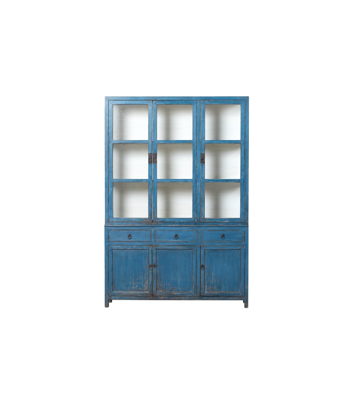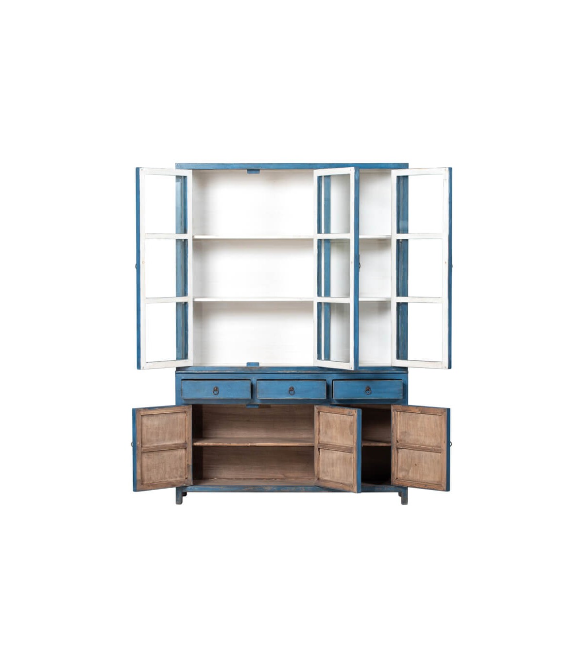Descubre la esencia del estilo oriental con nuestra vitrina grande de madera maciza de pino decapada en un elegante tono azul, combinada con detalles en blanco que aportan luminosidad y frescura a cualquier estancia. Este mueble, fabricado de manera artesanal, cuenta con tres puertas de cristal que permiten exhibir tus objetos decorativos favoritos, mientras que sus tres cajones y tres puertas de madera ofrecen un amplio espacio de almacenamiento.