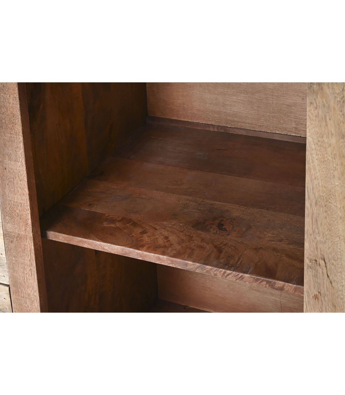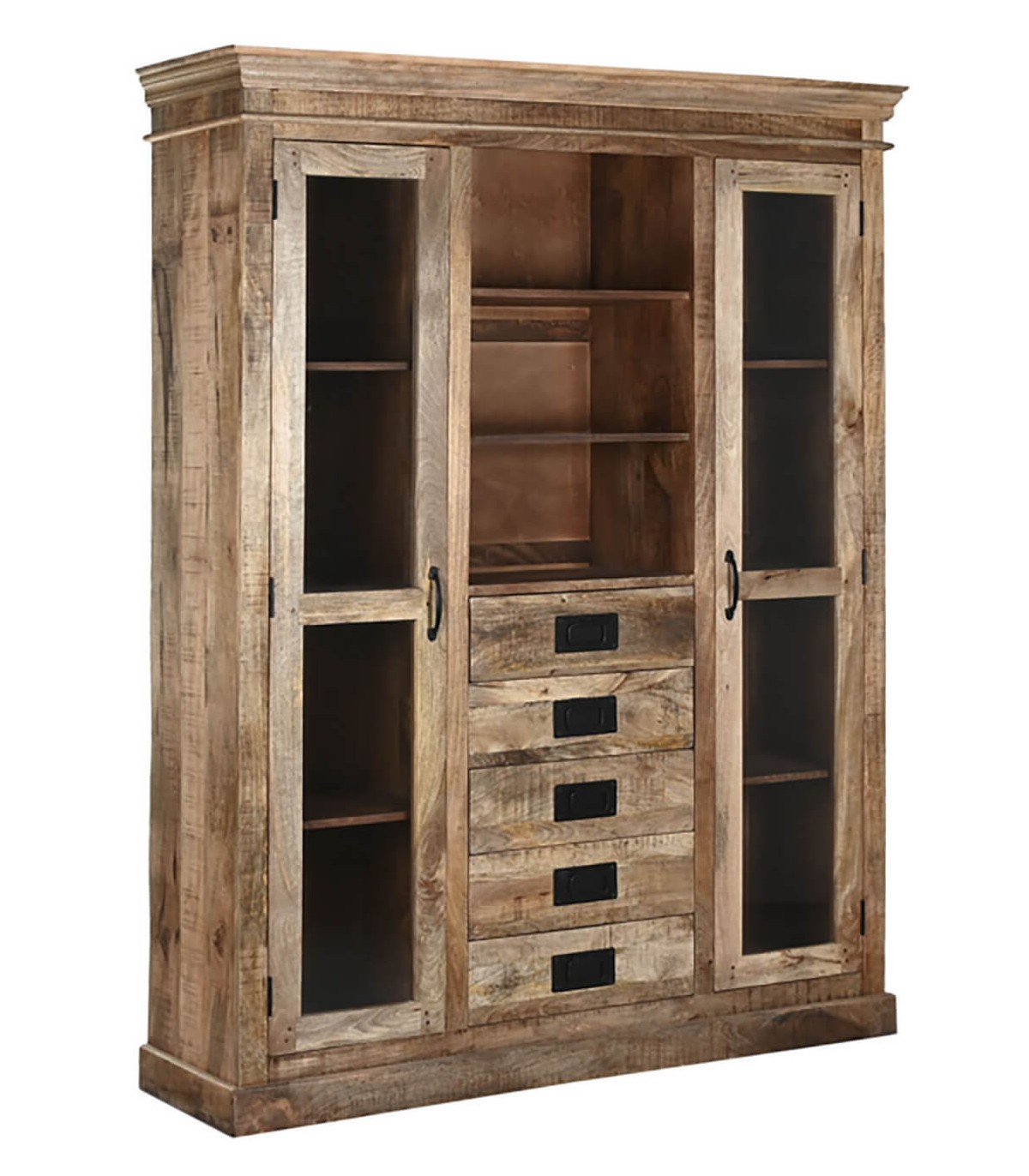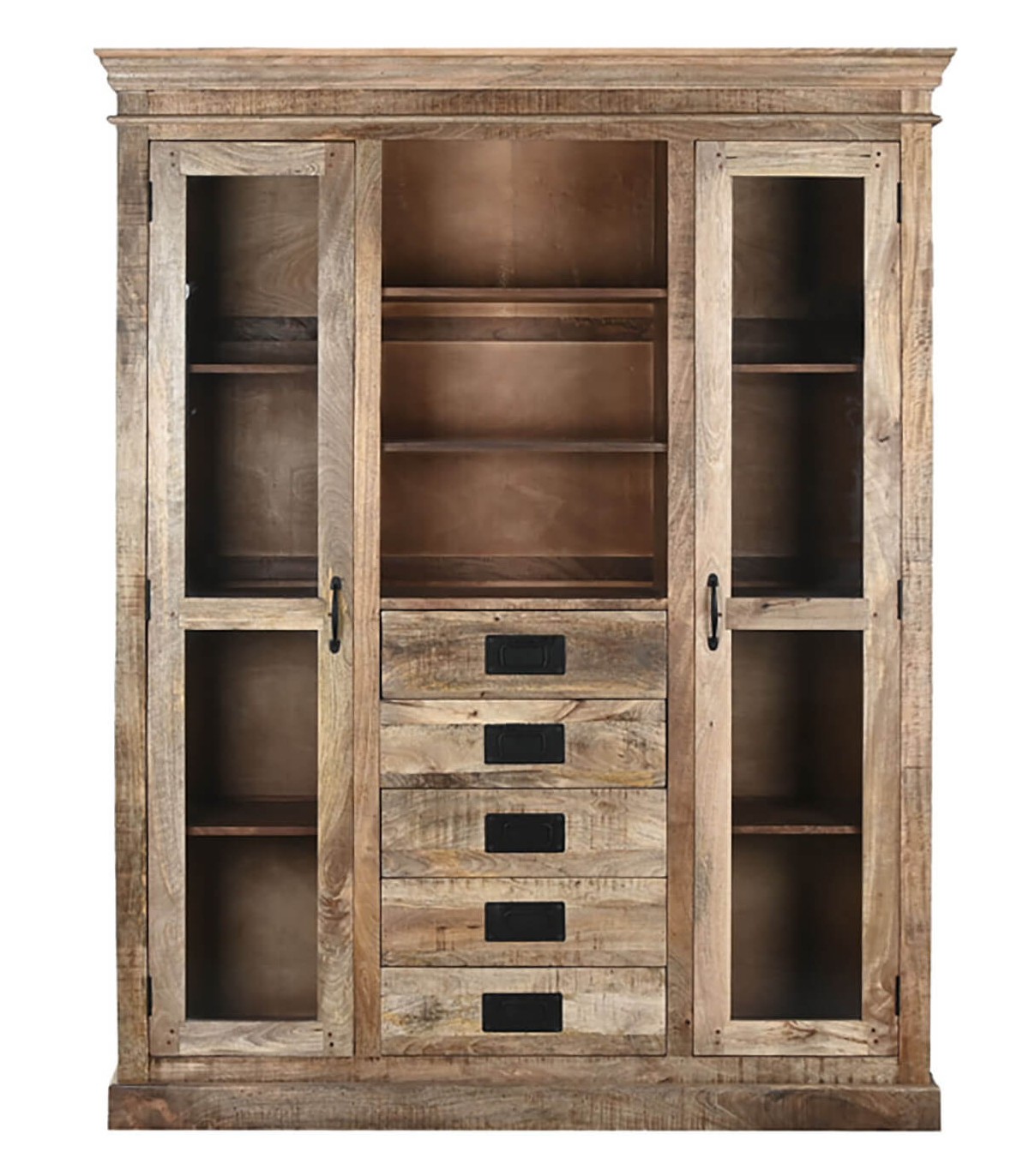 Aporta carácter y funcionalidad a tu hogar con esta imponente vitrina grande de inspiración colonial. Fabricada en sólida madera maciza de mango, combina dos puertas de cristal, cuatro amplios cajones y estantes abiertos para una organización versátil y elegante.
