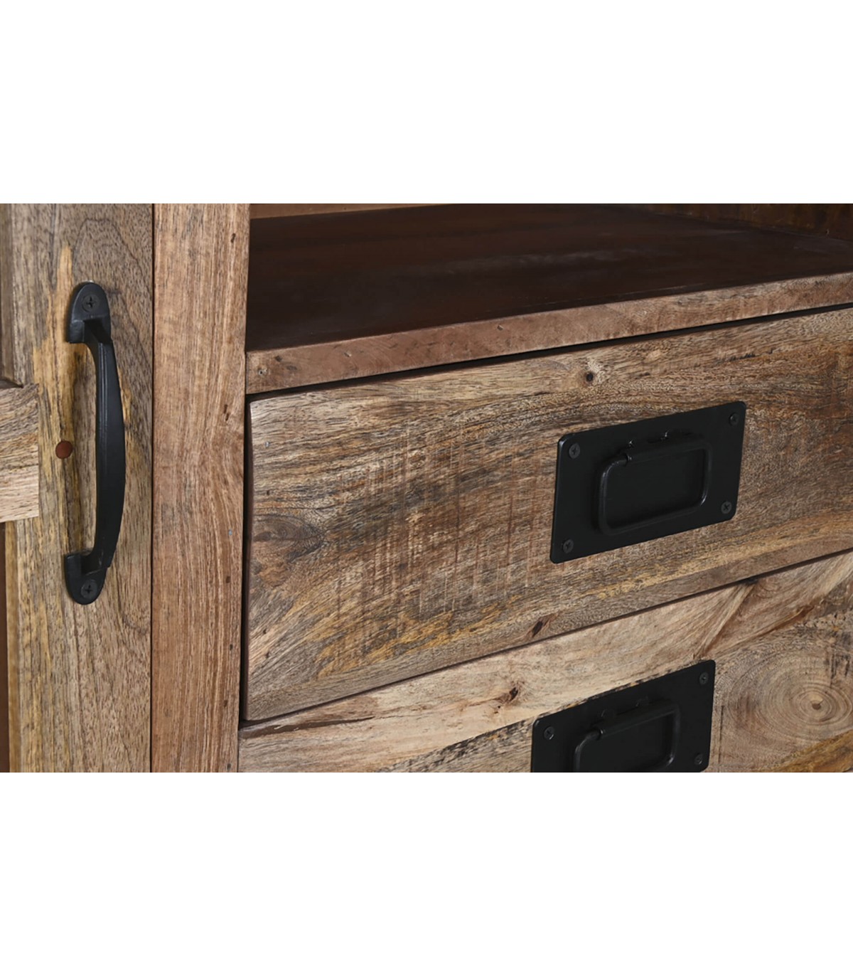 Los tiradores y detalles en metal negro refuerzan su estética robusta y atemporal, perfecta para ambientes coloniales, industriales o rústicos que buscan piezas auténticas de gran presencia.