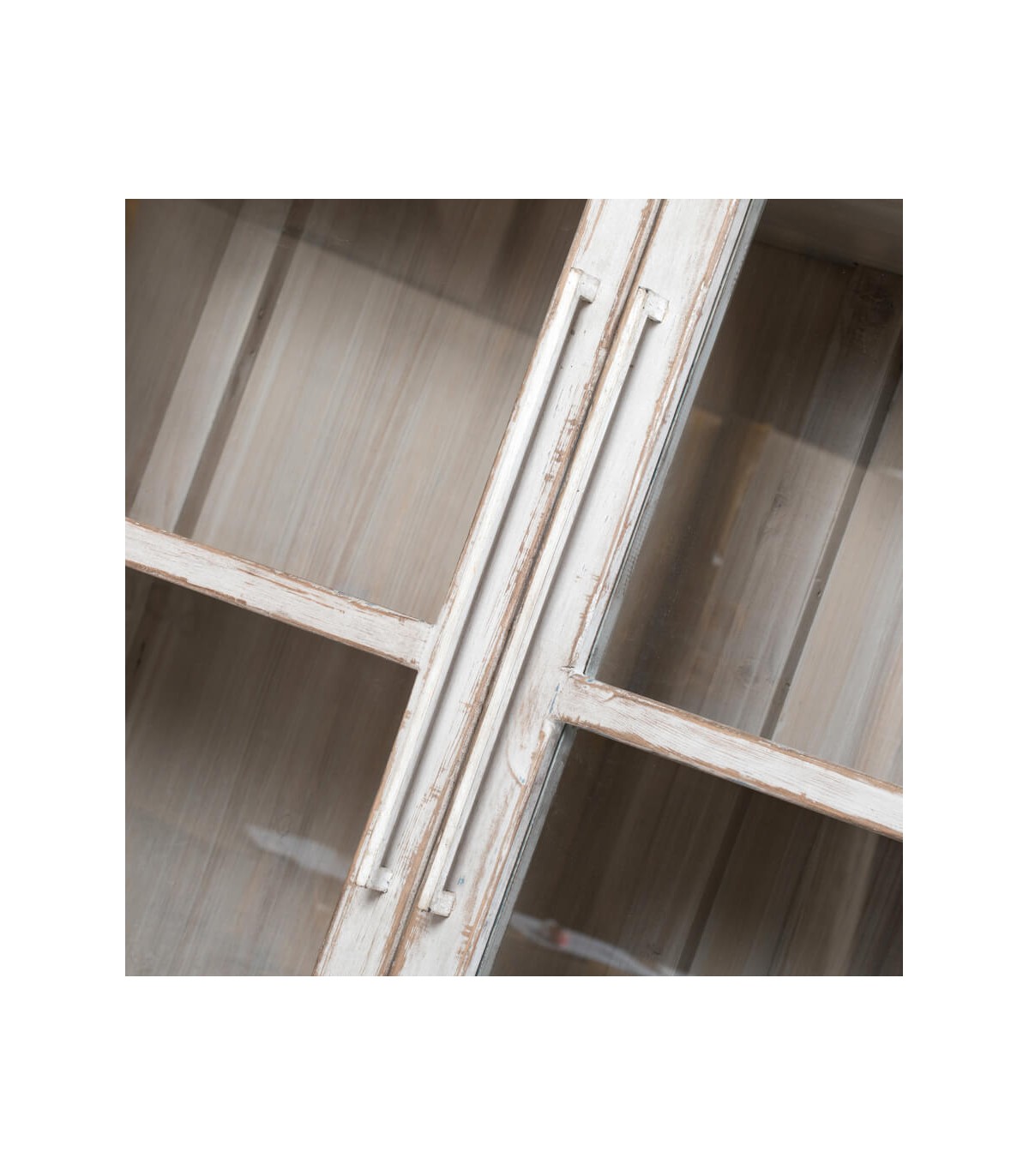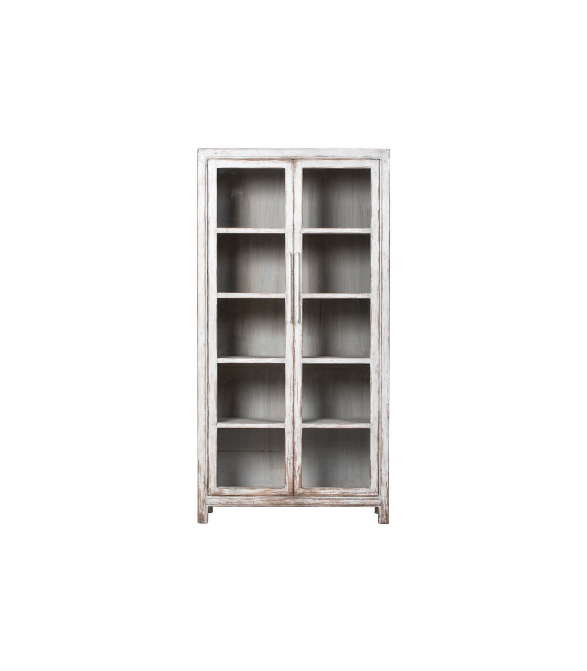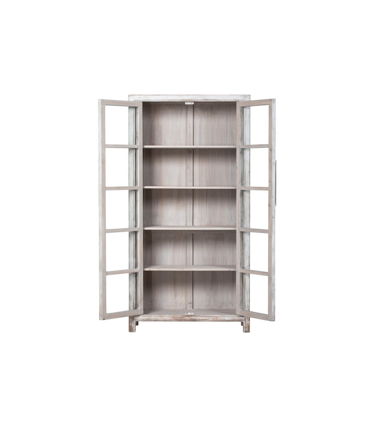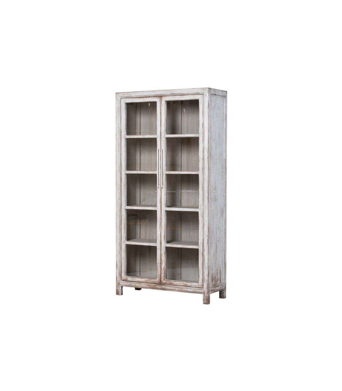 Aporta un toque elegante y funcional a tu hogar con esta vitrina grande de madera maciza, un diseño de estilo oriental artesanal con 2 puertas de cristal que combina belleza y practicidad. Su acabado blanco rozado realza la textura natural de la madera, aportando un aire sofisticado y atemporal, mientras que sus puertas acristaladas permiten exhibir tu vajilla, libros o piezas decorativas con un encanto especial.