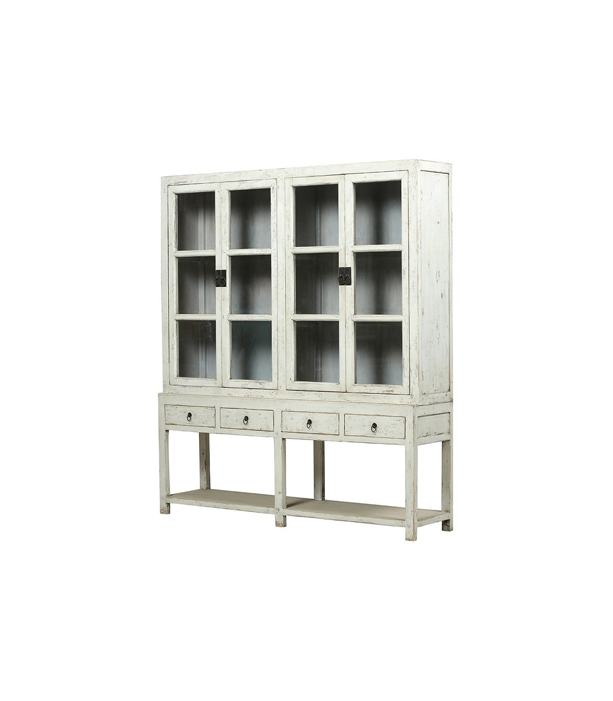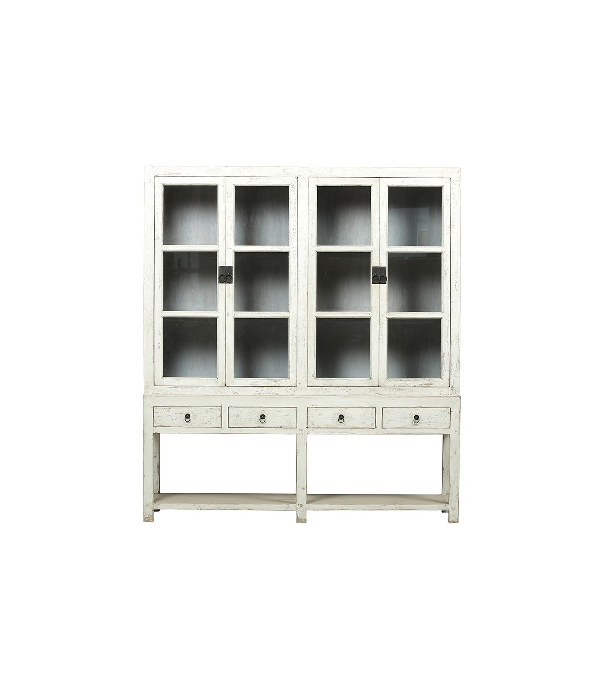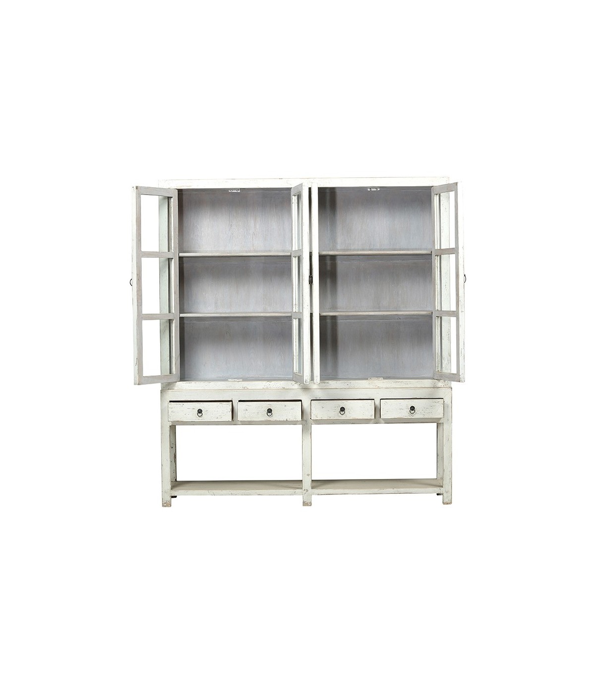 Sumérgete en la elegancia serena de esta vitrina oriental de líneas limpias, elaborada en madera maciza de pino con un encantador acabado blanco decapado. Sus cuatro puertas acristaladas con cuarterones permiten exponer tu vajilla o decoración favorita, mientras que los tiradores metálicos de aro evocan el diseño tradicional asiático. La estructura incorpora también cuatro cajones con pomos metálicos que aportan funcionalidad y equilibrio visual. Su base abierta con estante inferior añade ligereza al conjunto y espacio extra para almacenaje o exposición.