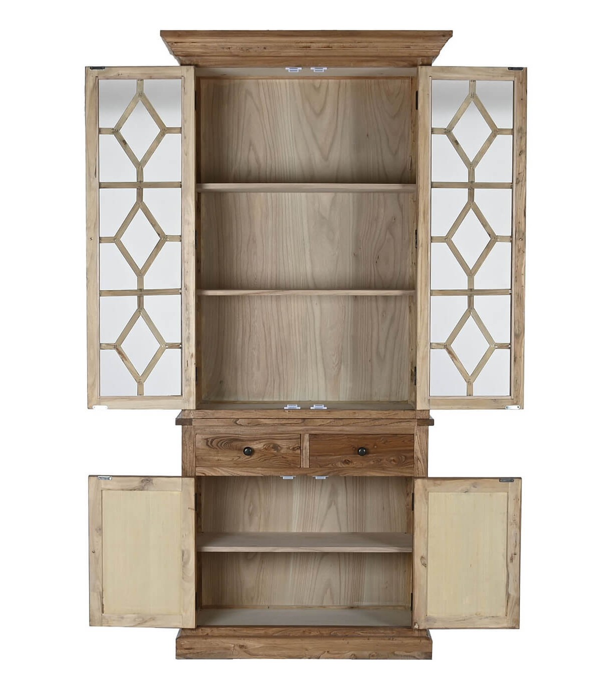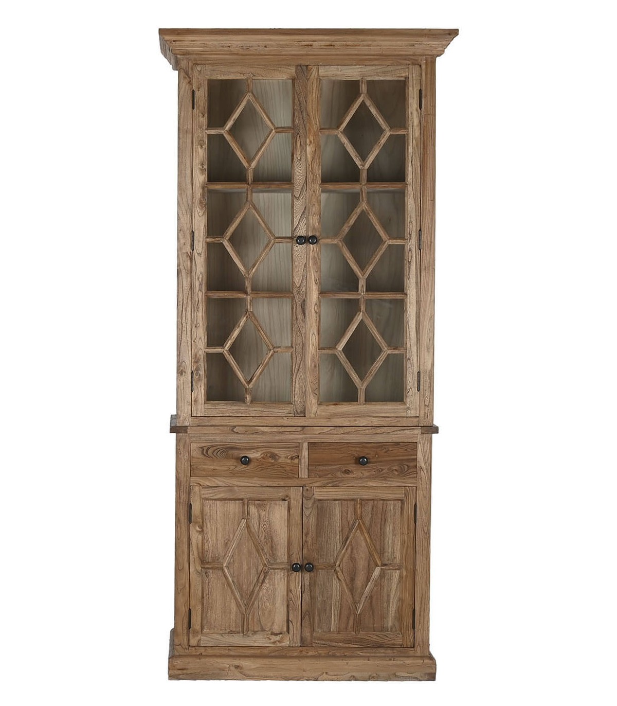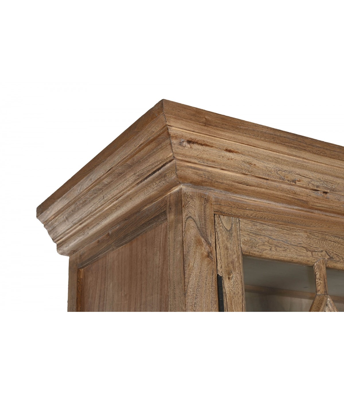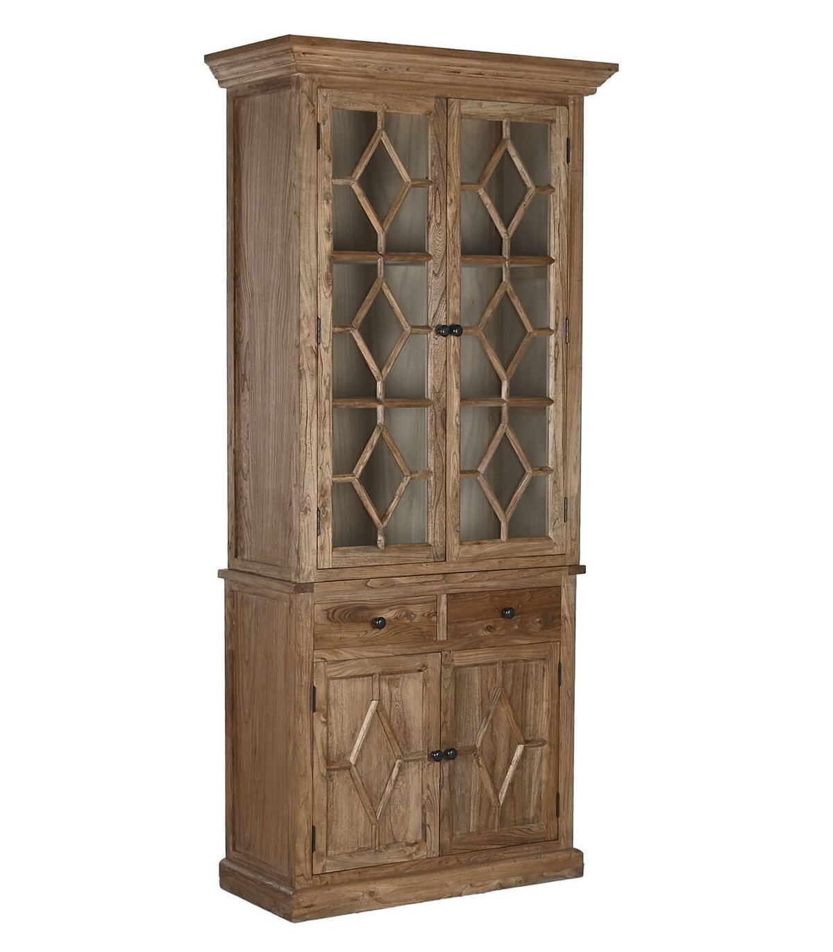 Vitrina realizada en madera de olmo reciclada acabada natural patinada, de gran capacidad, con sus 2 puertas de madera sus 2 cajones y 2 puertas de cristal, sin duda el centro de atención en cualquier decoración.