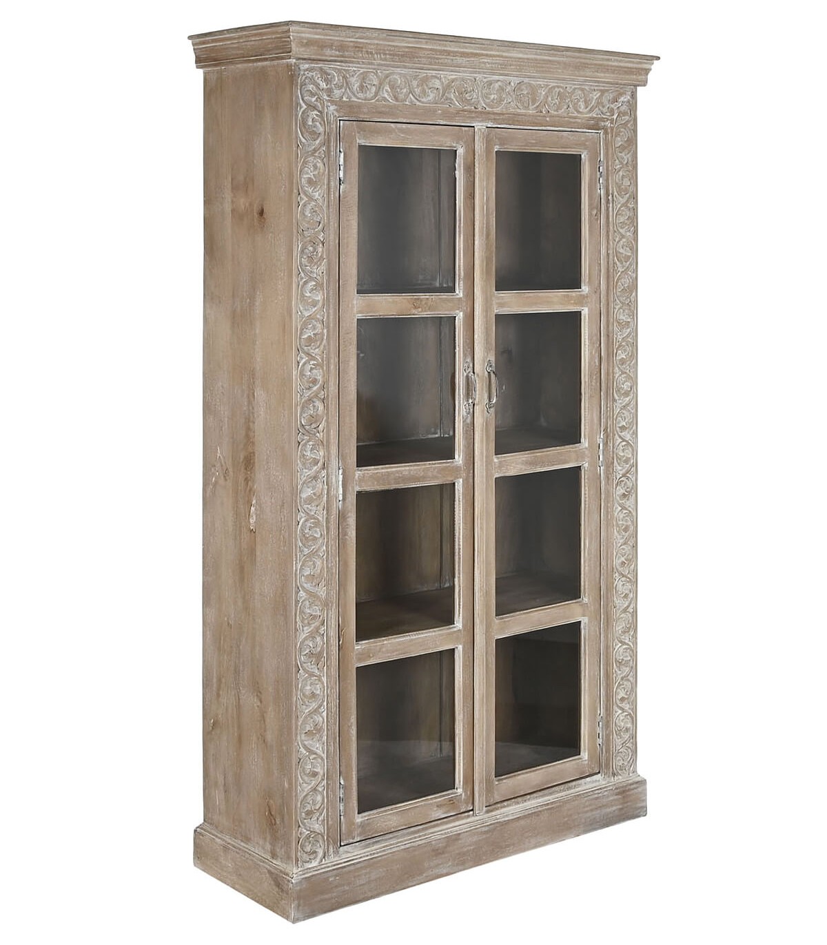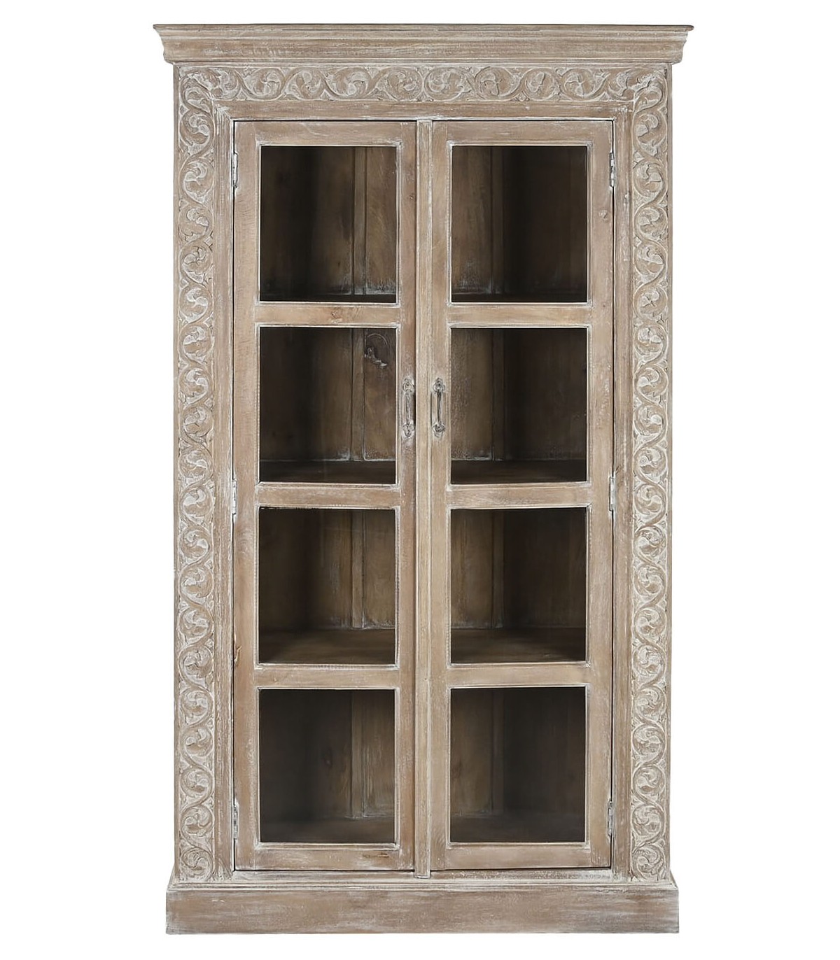 Dale un toque elegante y exclusivo a tu hogar con esta impresionante vitrina artesanal, fabricada en madera maciza de mango con un exquisito trabajo de talla a mano. Sus detalles tallados, realzados con un acabado blanqueado, aportan un aire sofisticado y vintage, ideal para crear ambientes boho chic, rústicos o de estilo étnico.