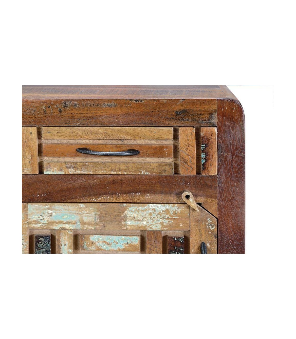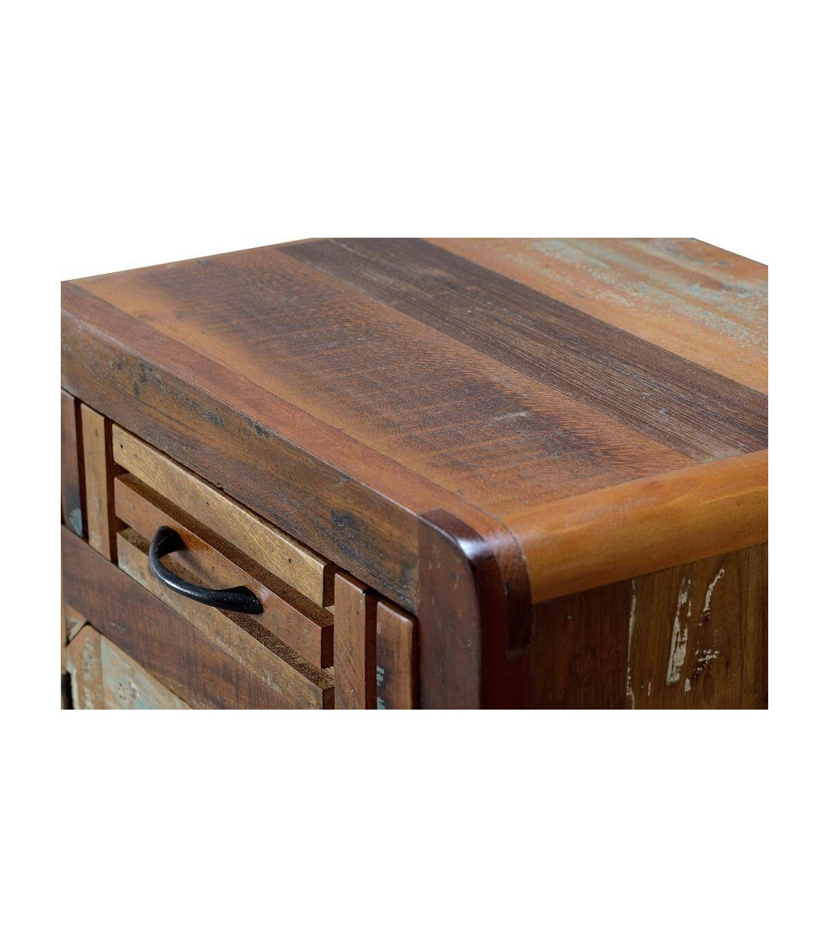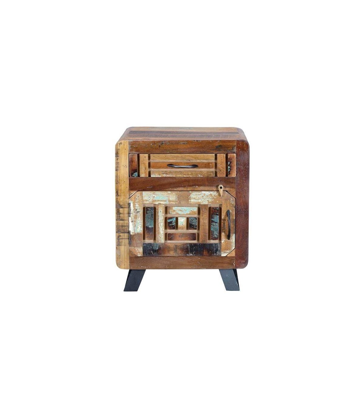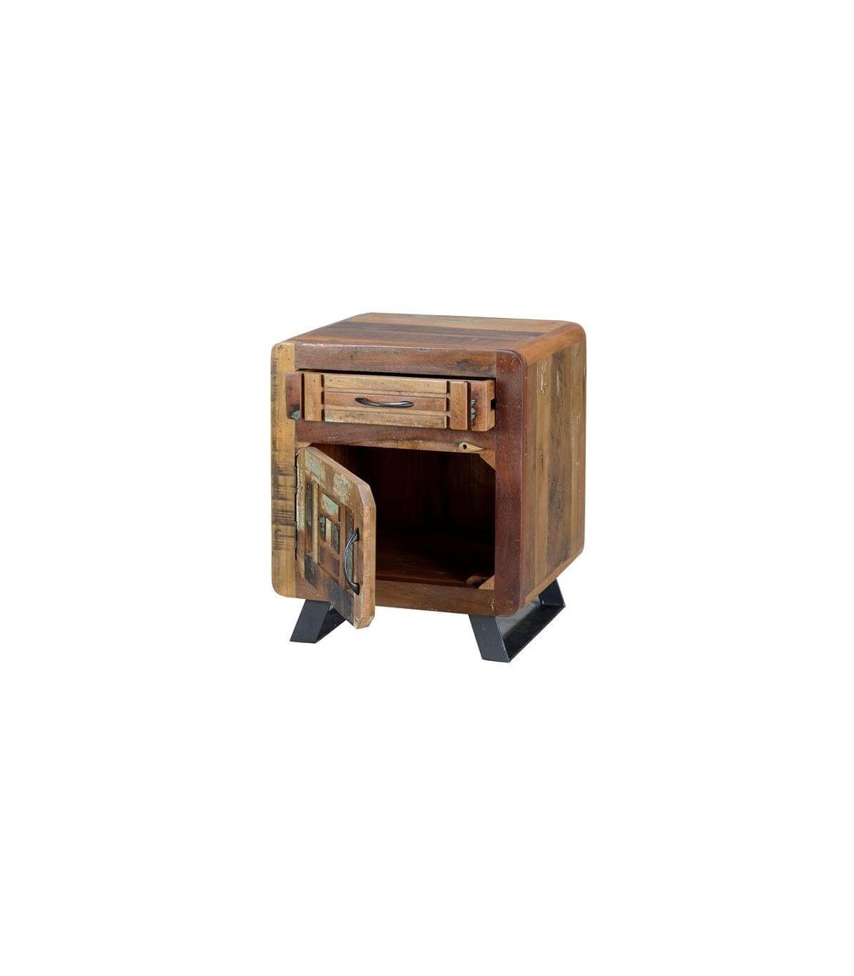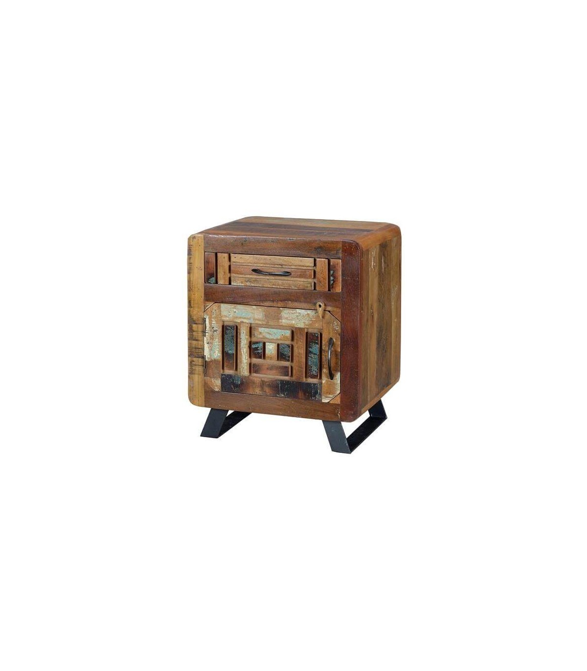 Mesita de noche de nuestra colección de muebles Terra, una colección realizada en madera maciza reciclada 100% tratada, con la peculiaridad de el decapado en multicolor que le da un aspecto fresco y mediterraneo y la aplicación del metal negro que le da un aire industrial vintage, sin duda un muble que será el centro de atención en tu decoración.