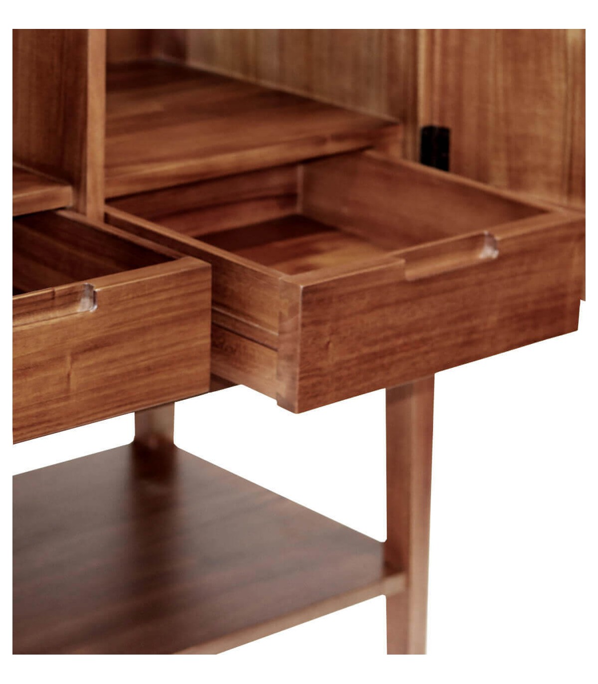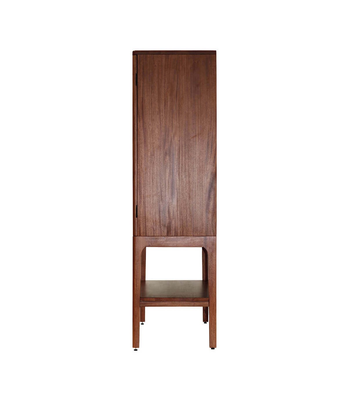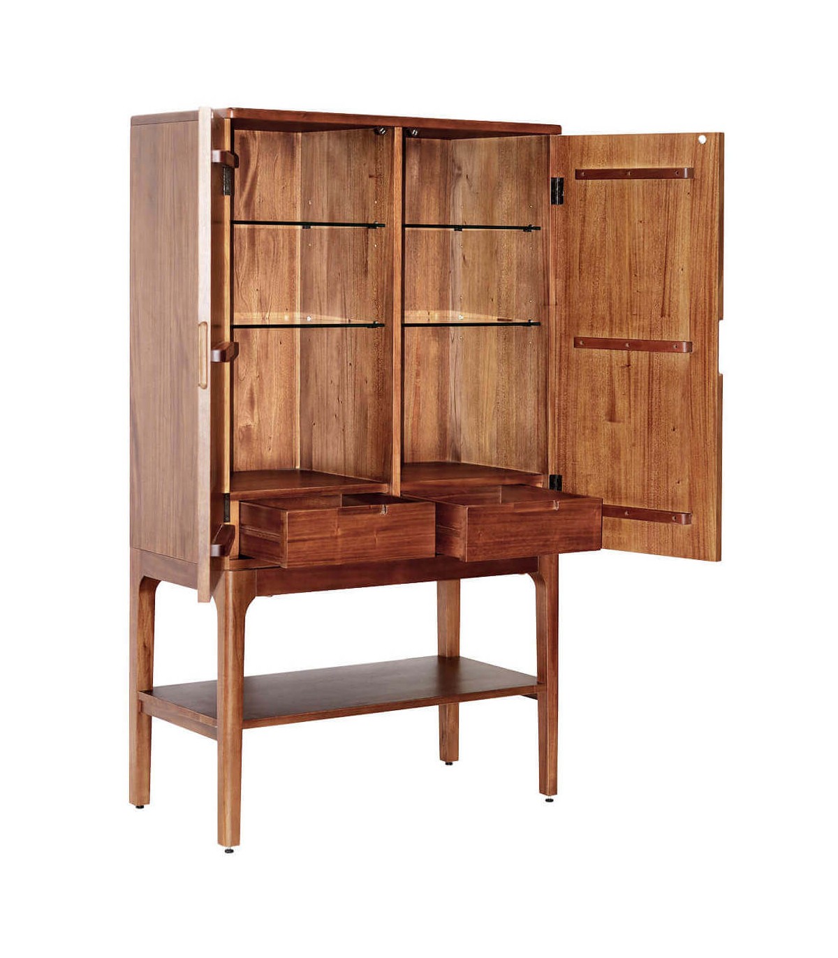 Descubre la elegancia atemporal de la colección Oporto con este mueble de líneas depuradas y estética colonial. Fabricado en madera maciza de caoba, este armario alacena cuenta con dos puertas, estantes interiores de cristal y dos cajones perfectos para mantener el orden con estilo. La balda inferior aporta ligereza visual y funcionalidad.