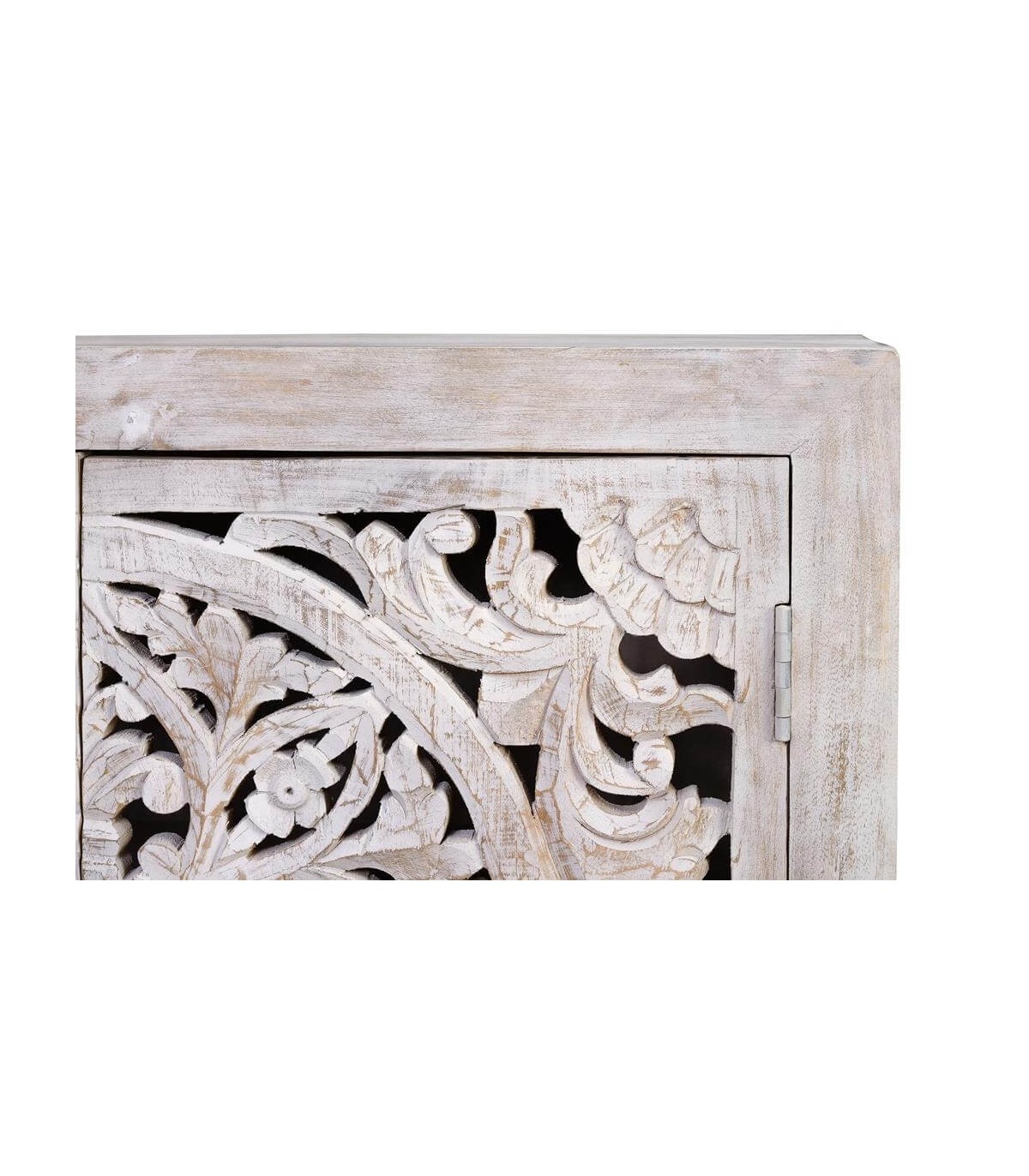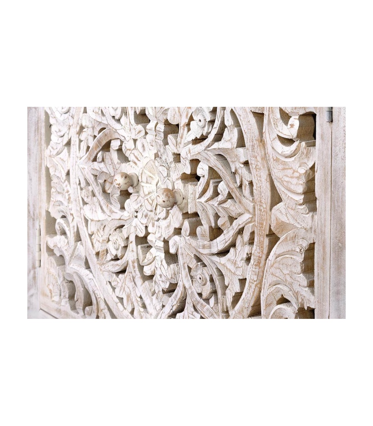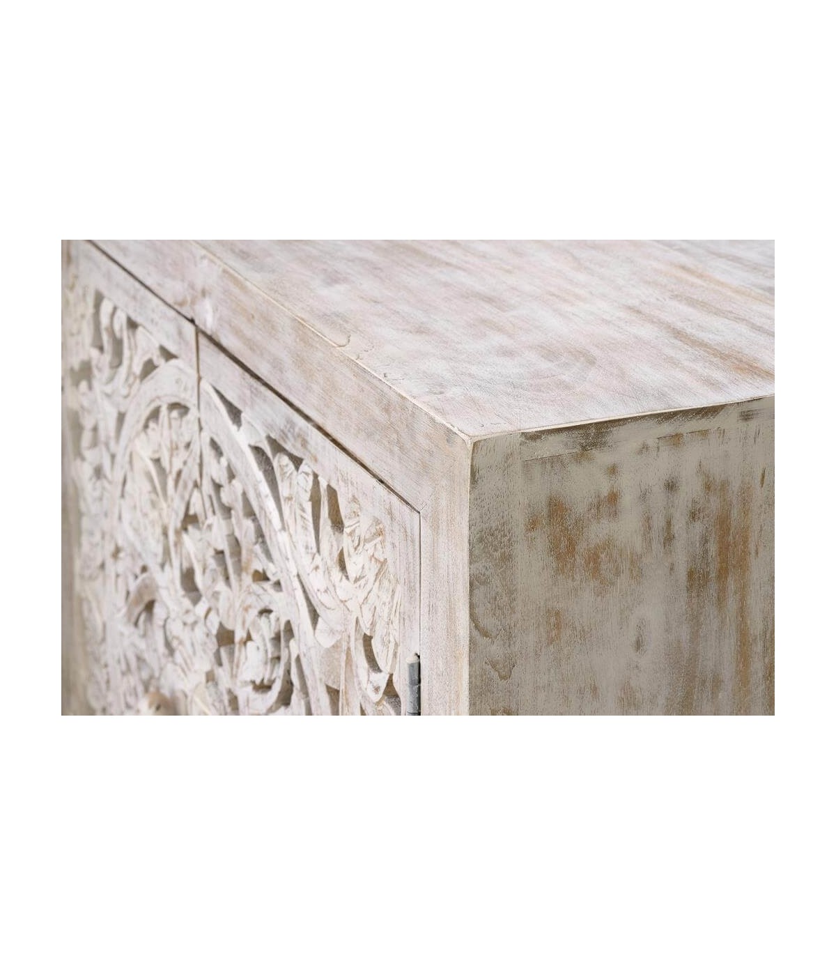 Este taquillón de dos puertas fusiona el encanto del arte tallado a mano con una estética sobria y natural. La madera maciza de mango se presenta con acabado blanqueado y matices decapados que acentúan los relieves florales tallados, creando un efecto visual cargado de carácter.