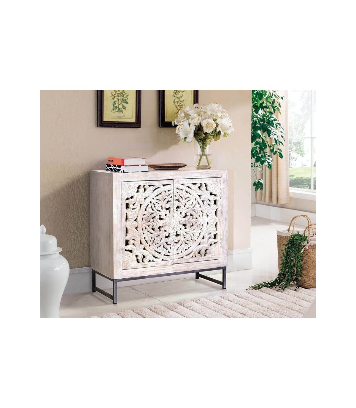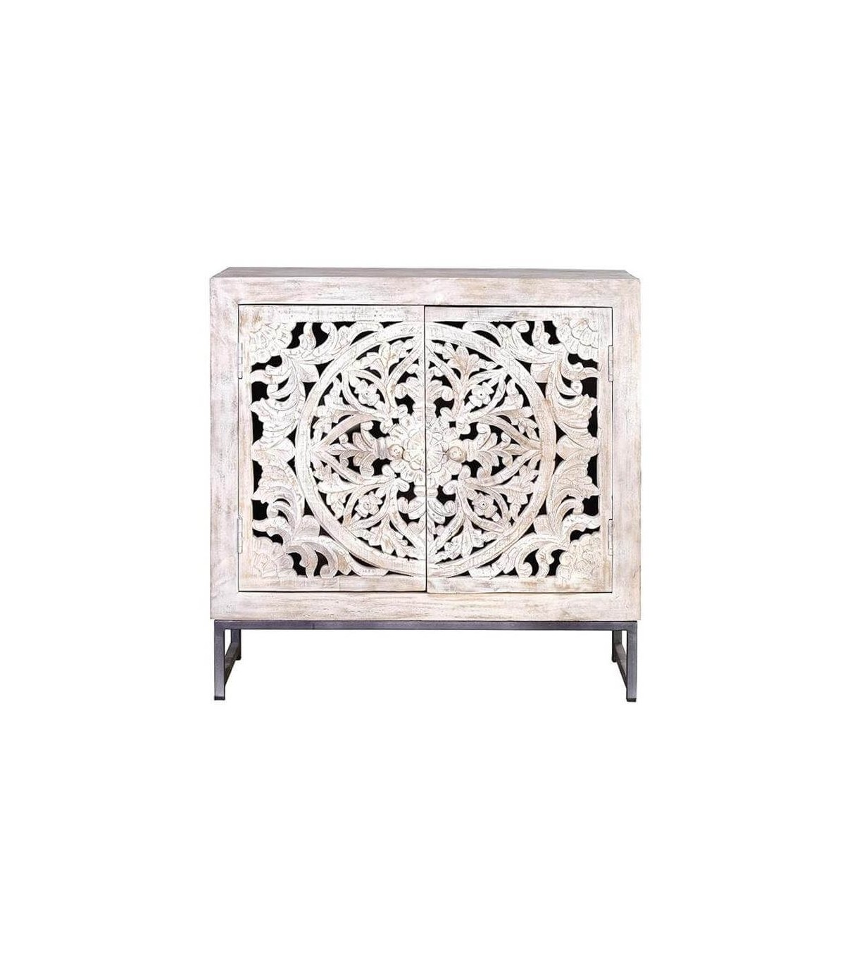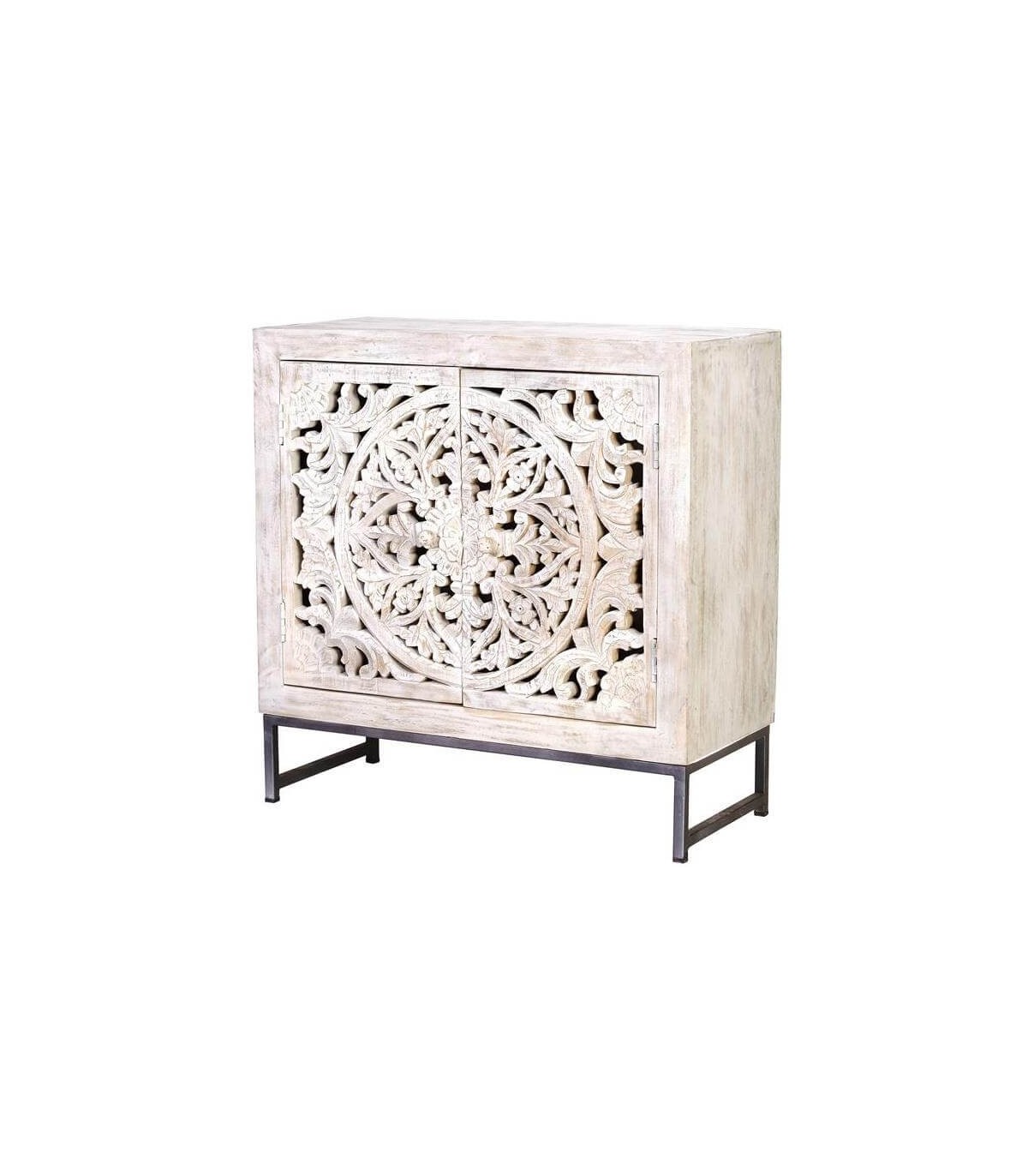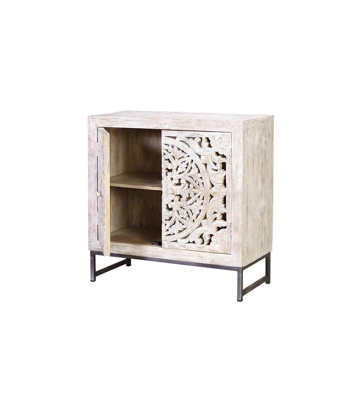 Este taquillón de dos puertas fusiona el encanto del arte tallado a mano con una estética sobria y natural. La madera maciza de mango se presenta con acabado blanqueado y matices decapados que acentúan los relieves florales tallados, creando un efecto visual cargado de carácter.