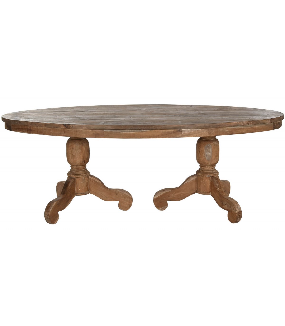 Mesa de comedor ovalada grande realizada en madera de teca con 2 pies tallados a mano al mas puro estilo colonial, una mesa para comer en familia y que pega con casi cualquier tipo de decoración.