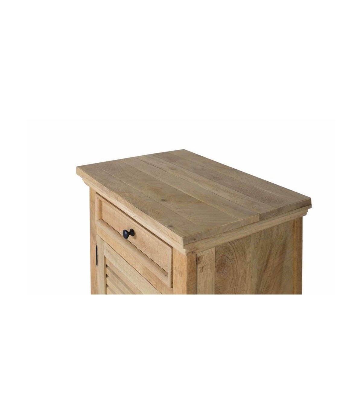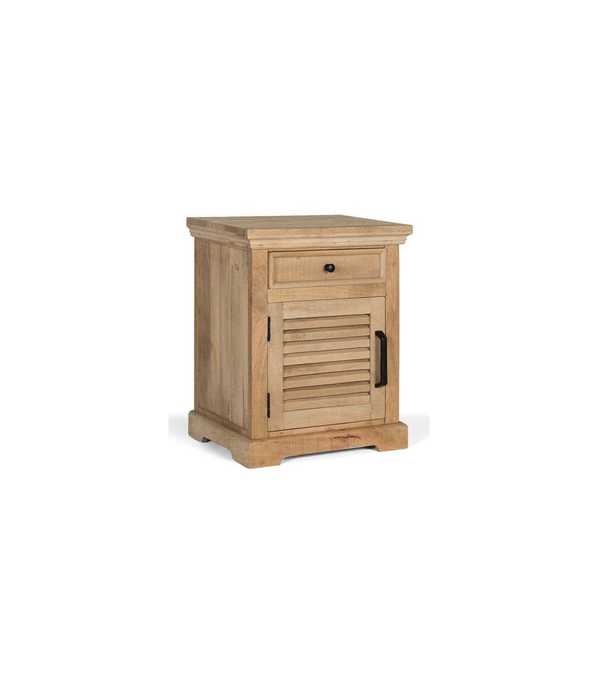 Mesita de noche de nuestra colección de muebles Basana, con 1 cajón y 1 puerta, una colección muy fresca y actual, realizada artesanalmente en madera maciza de mango acabado natural con los tiradores en hierro color negro, de inspiración colonial aporta naturalidad y luminosidad a tu decoración.