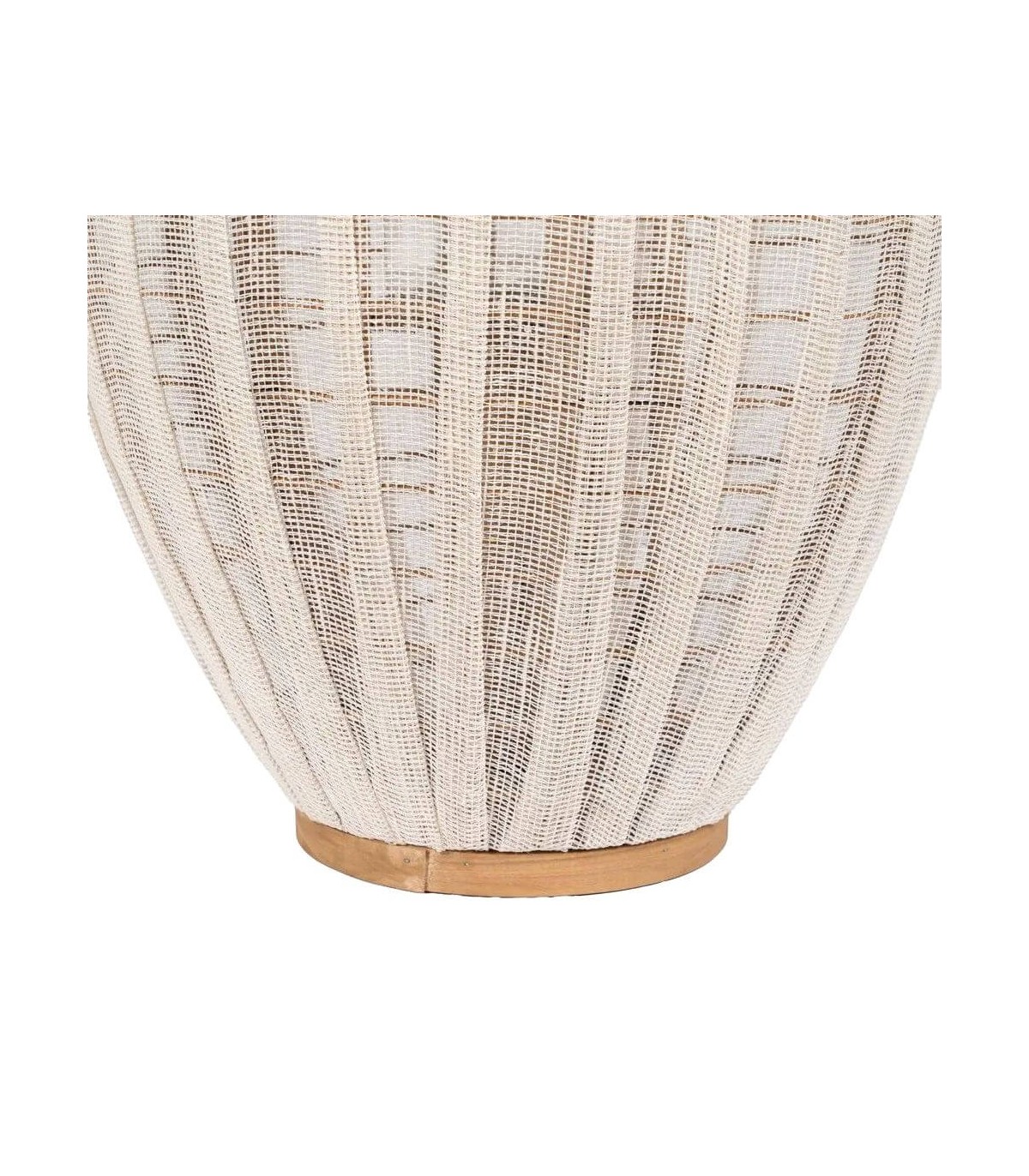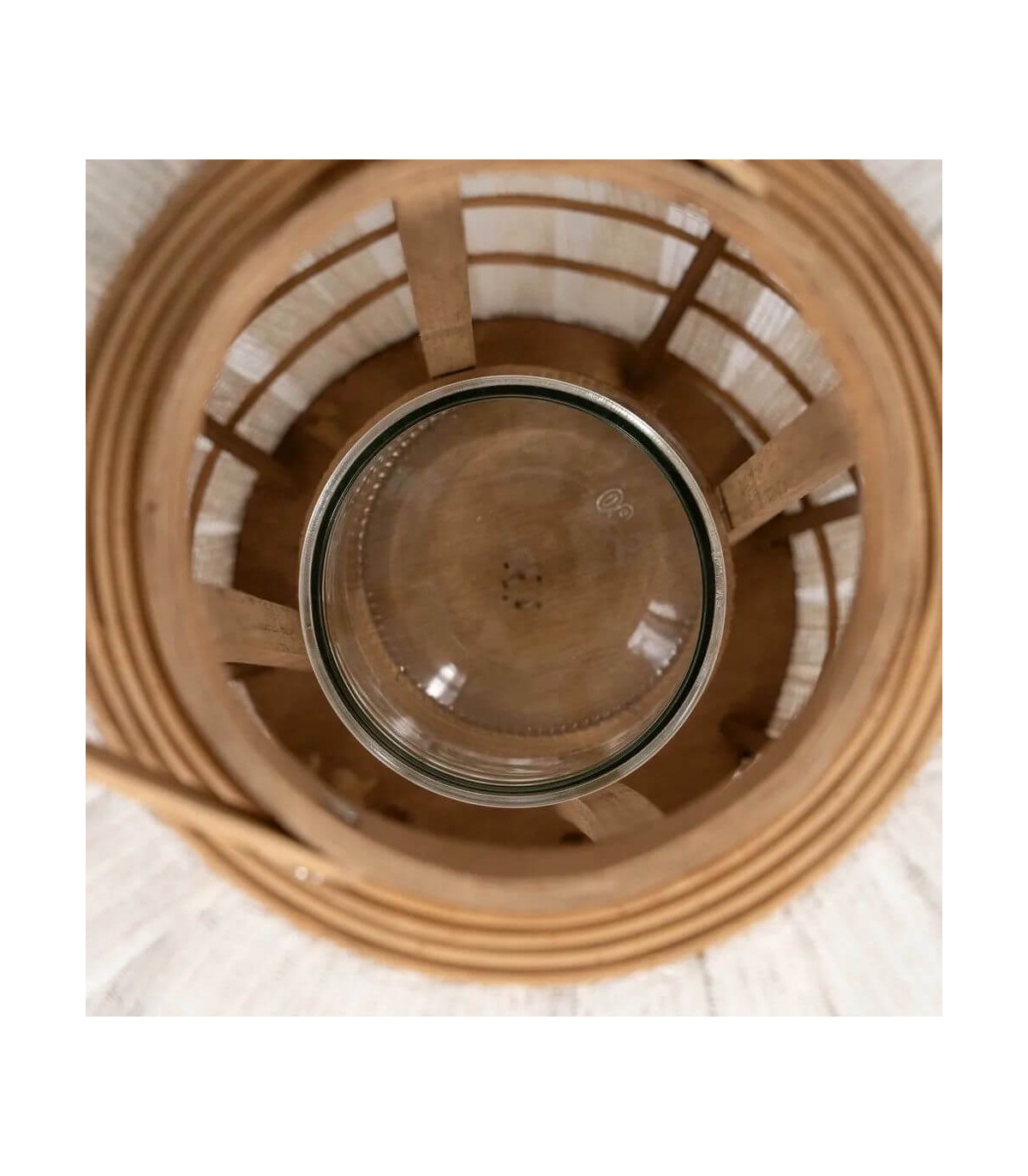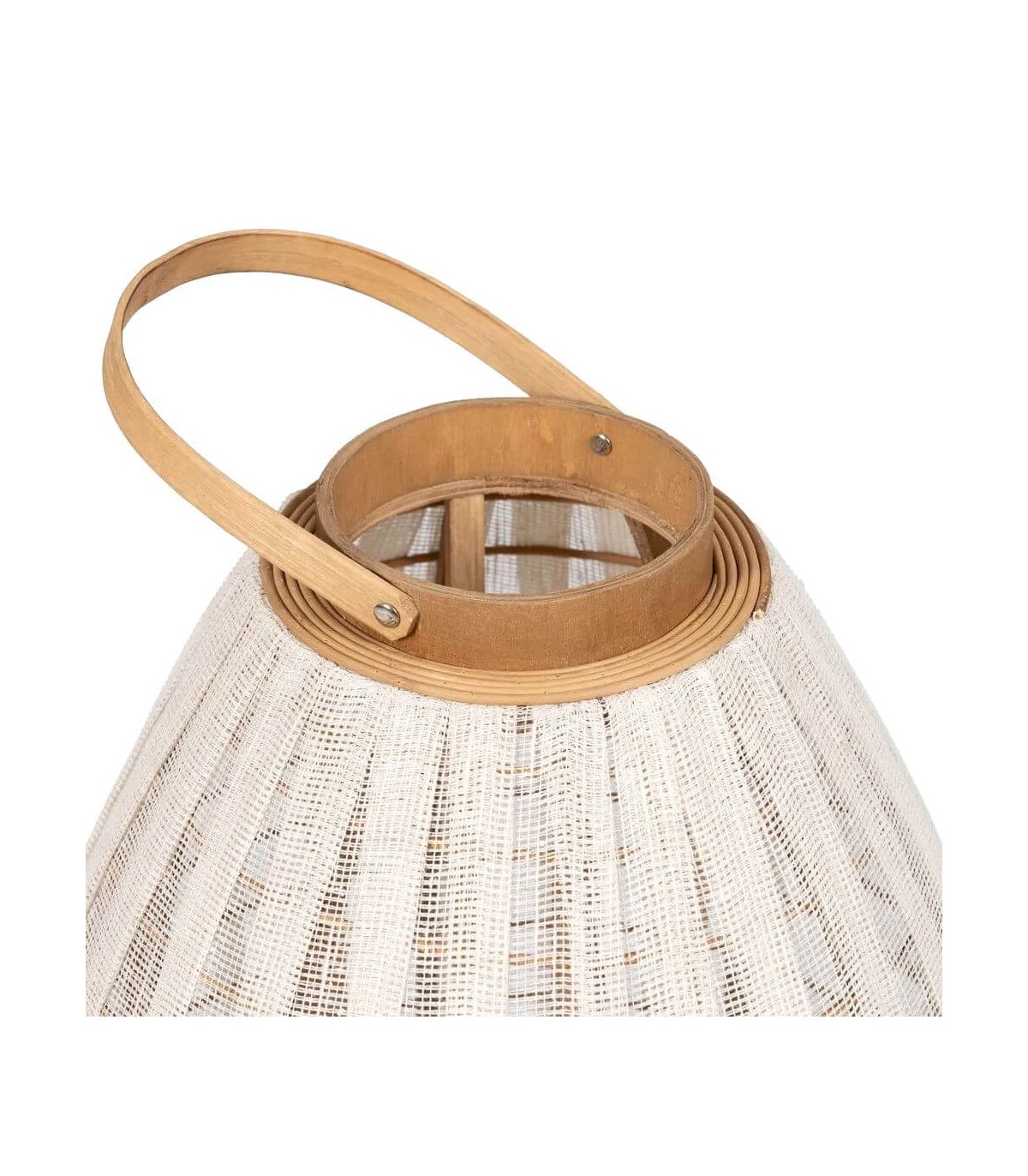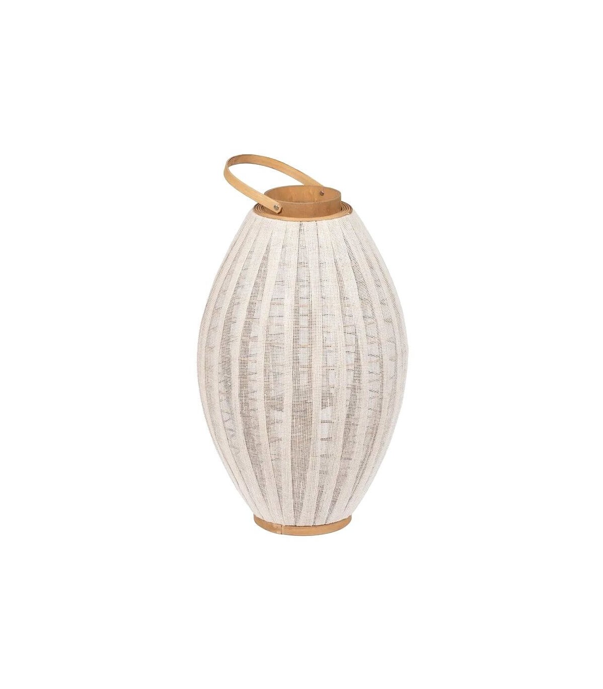 Este elegante portavelas combina materiales naturales y forma orgánica para crear una pieza decorativa que destaca por su belleza y autenticidad. Su cuerpo ovalado de bambú envuelto en lino crudo deja entrever un cilindro interior de cristal, perfecto para proteger la vela del viento y aportar un toque cálido al ambiente. Ideal para decorar exteriores cubiertos, terrazas o salones con estilo colonial, rústico o exótico.