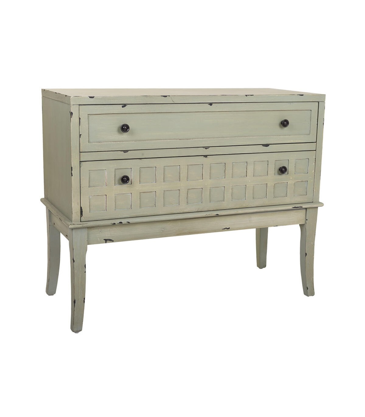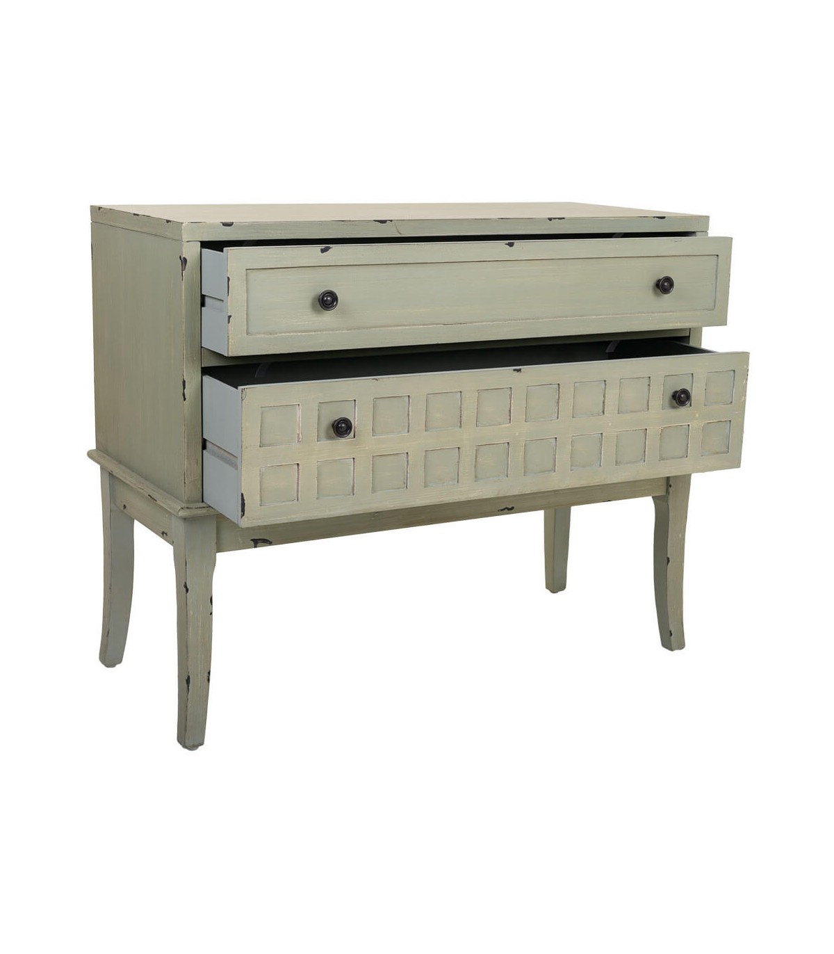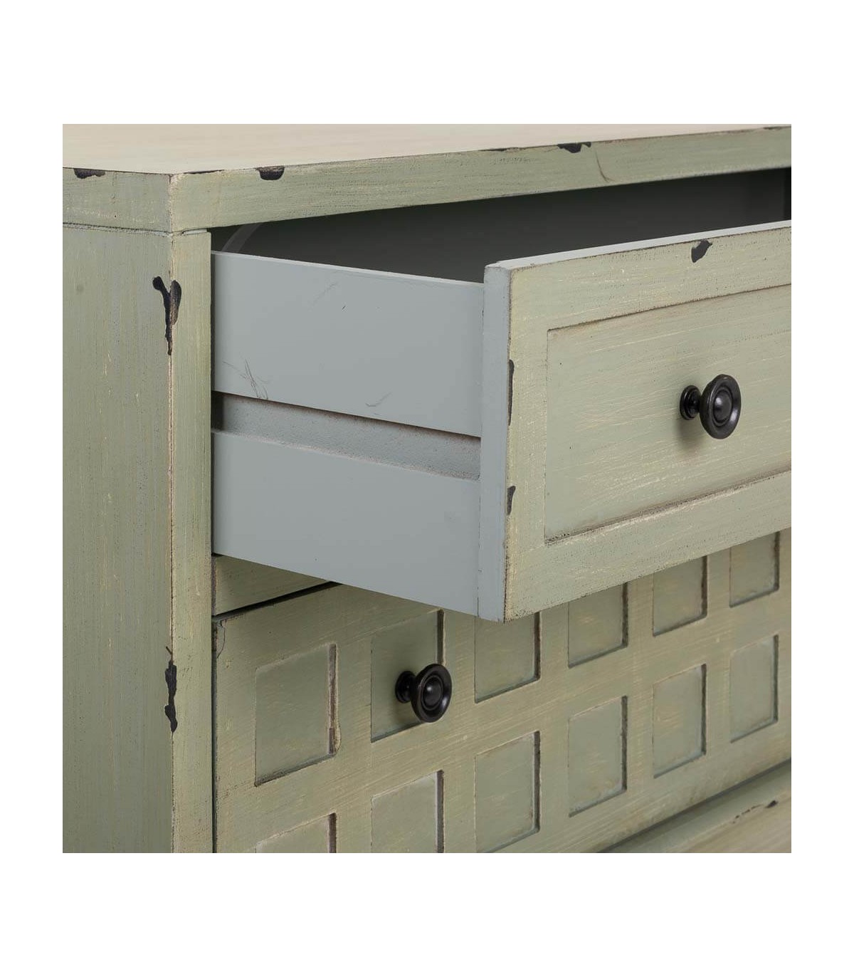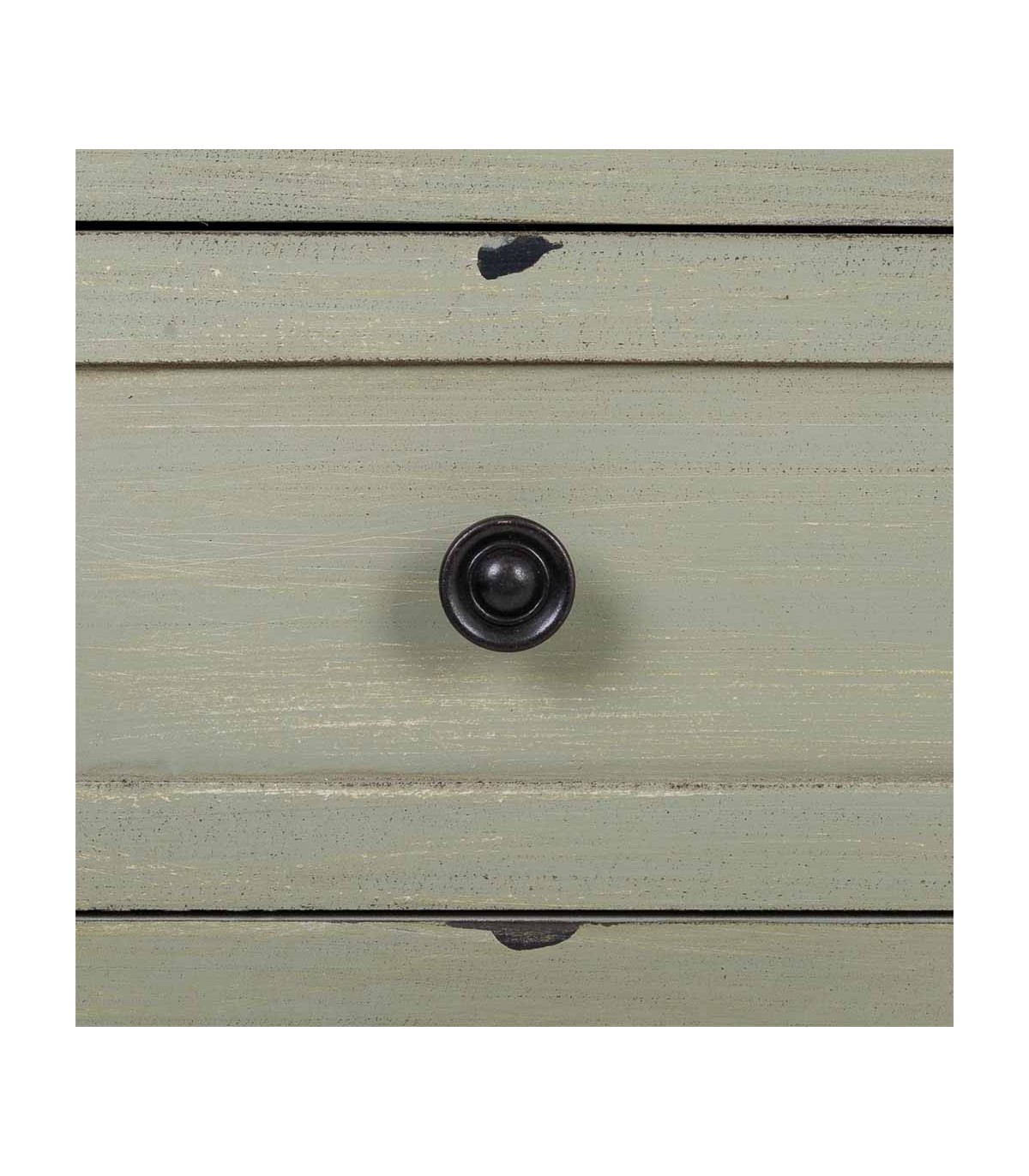 🎨 Acabado: Lacado en verde musgo con efecto envejecido. Tiradores en metal negro. Fabricación artesanal. entendemos las variaciones de tonalidad, tamaño y forma o ciertas imperfecciones (grietas, nudos, marcas) como un valor añadido que la convierten en pieza única.