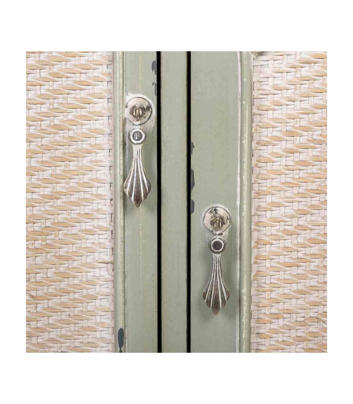 Acabado, artesanal, madera con detalles tallados a mano lacada en verde vintage, ratán natural, tiradores bronce.