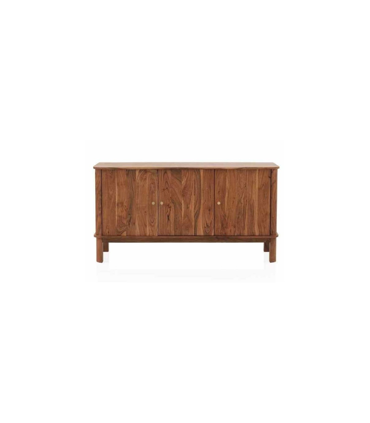 Aparador con 3 puertas realizado en madera de acacia natural, con los tiradores en metal dorado. La madera de acacia, con sus tonalidades naturales y su distintivo grano, aporta un encanto cálido y auténtico a la cómoda, añade un elemento de estilo y elegancia a cualquier espacio.