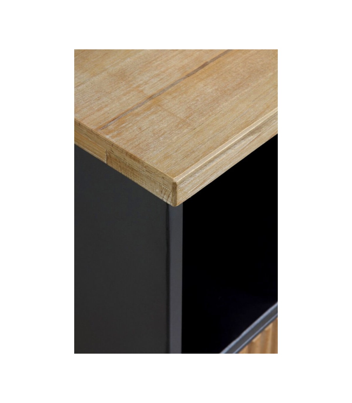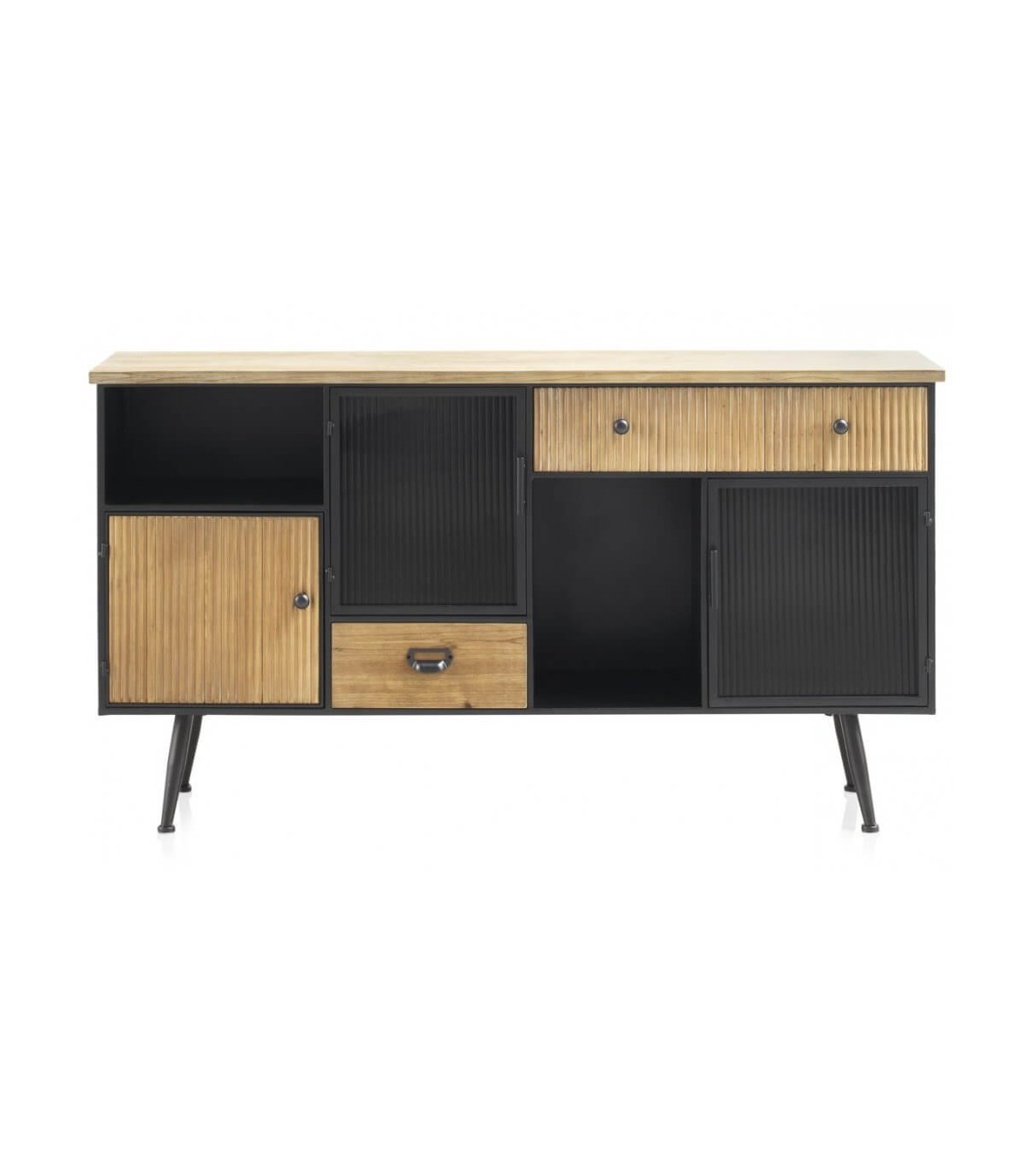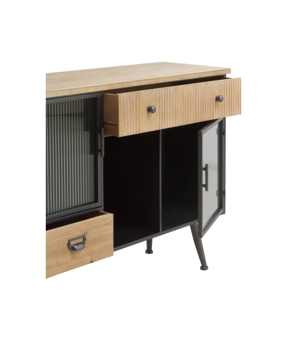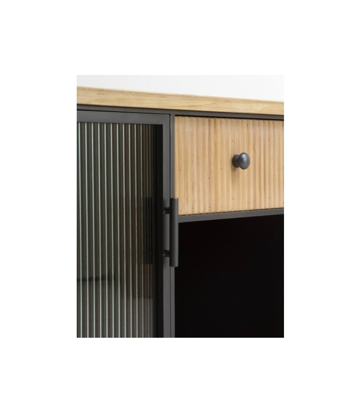 Aparador de estilo industrial realizado en madera de abeto natural, hierro en color negro y dos puertas en cristal ondulado translúcido, un original perfecto para decoraciones de estilo industrial o vintage.