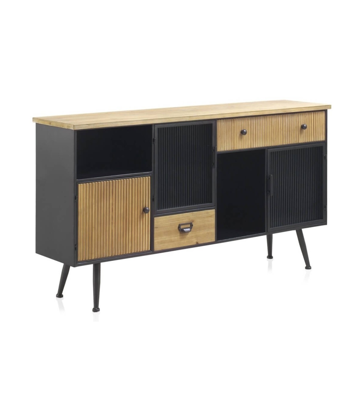 Aparador, 2 puertas de cristal, 1 puerta de madera , 2 cajones, estilo industrial.