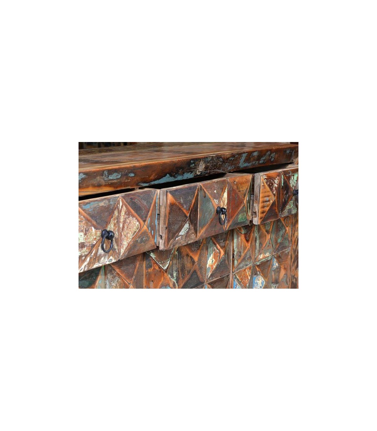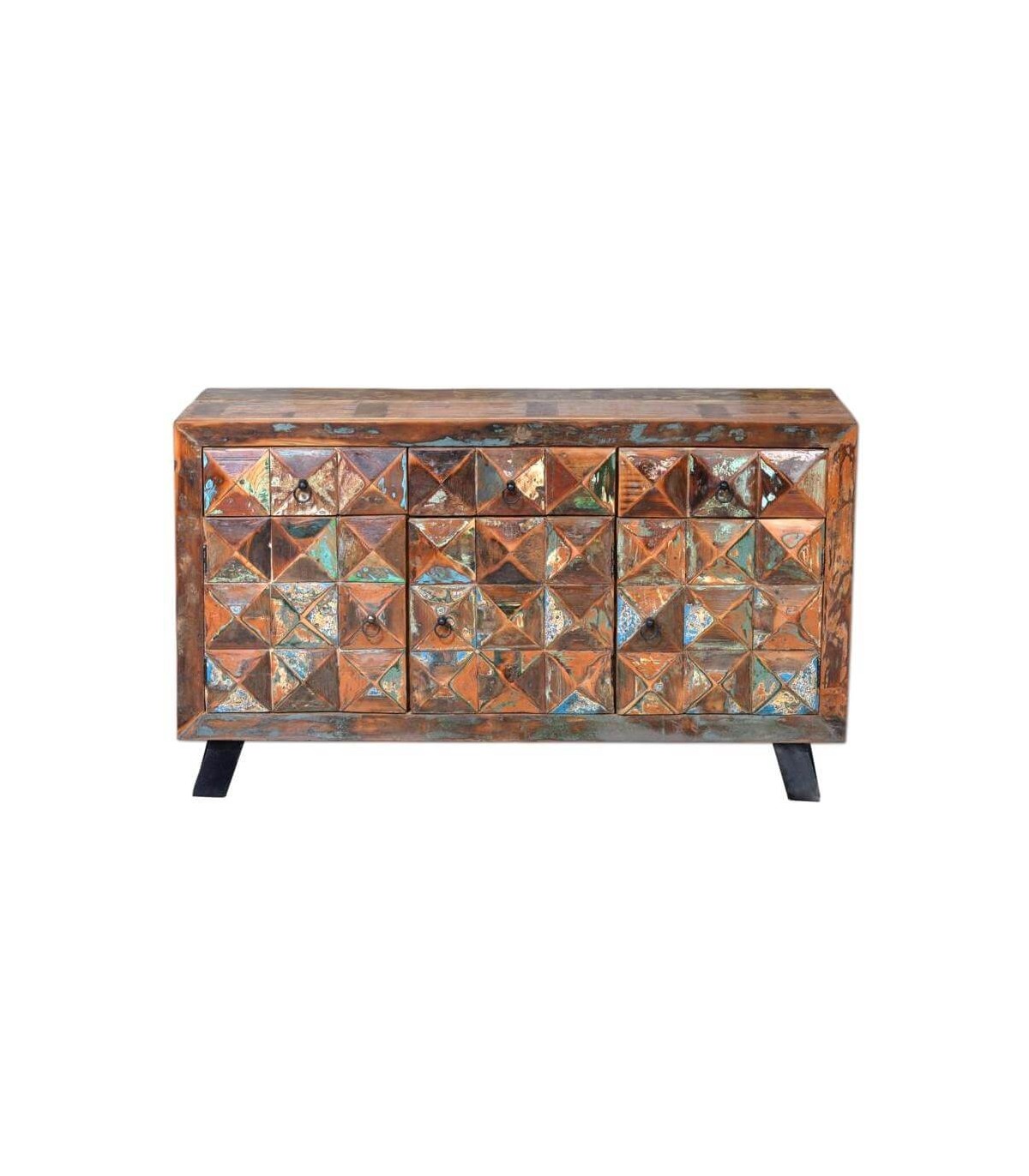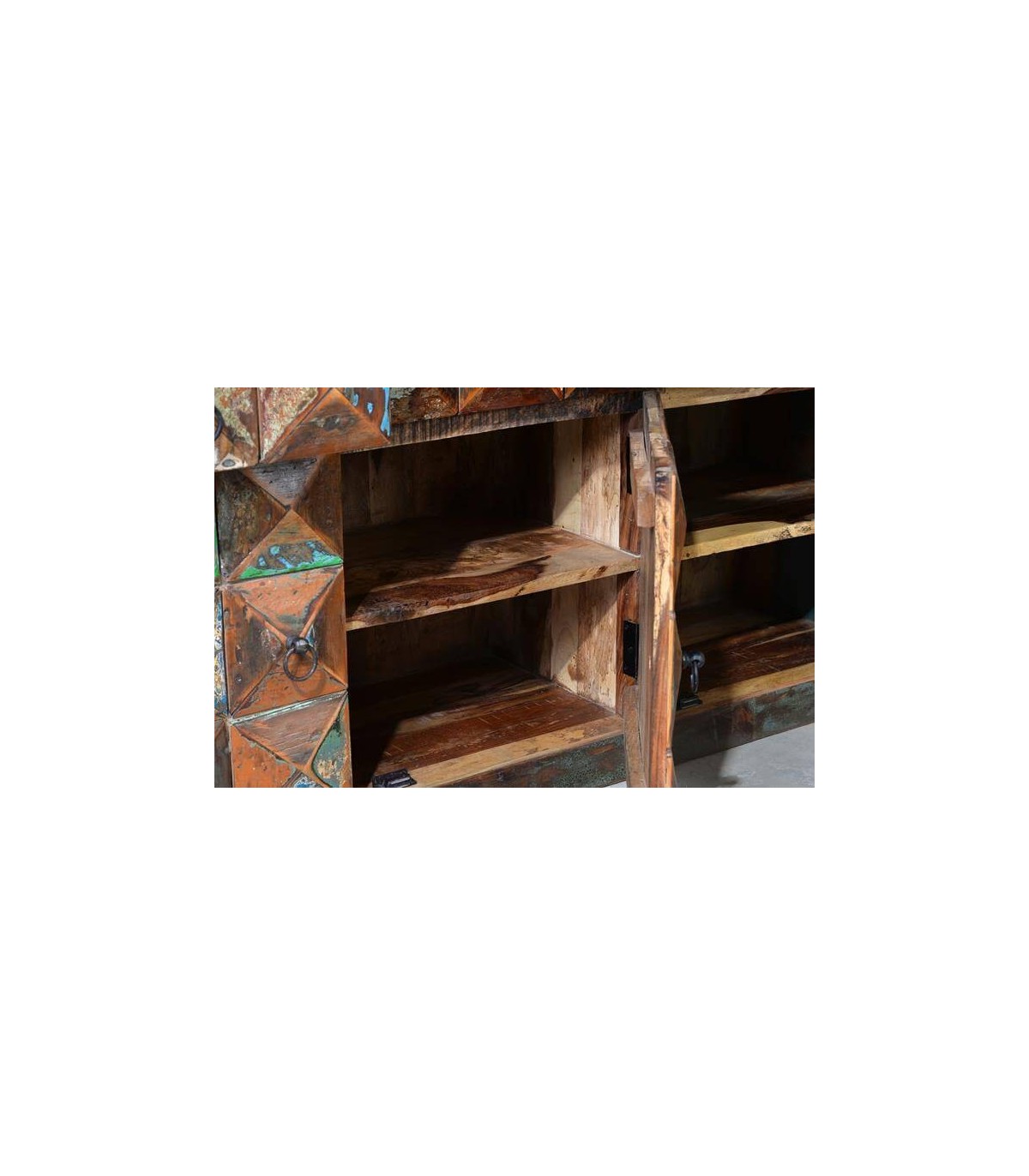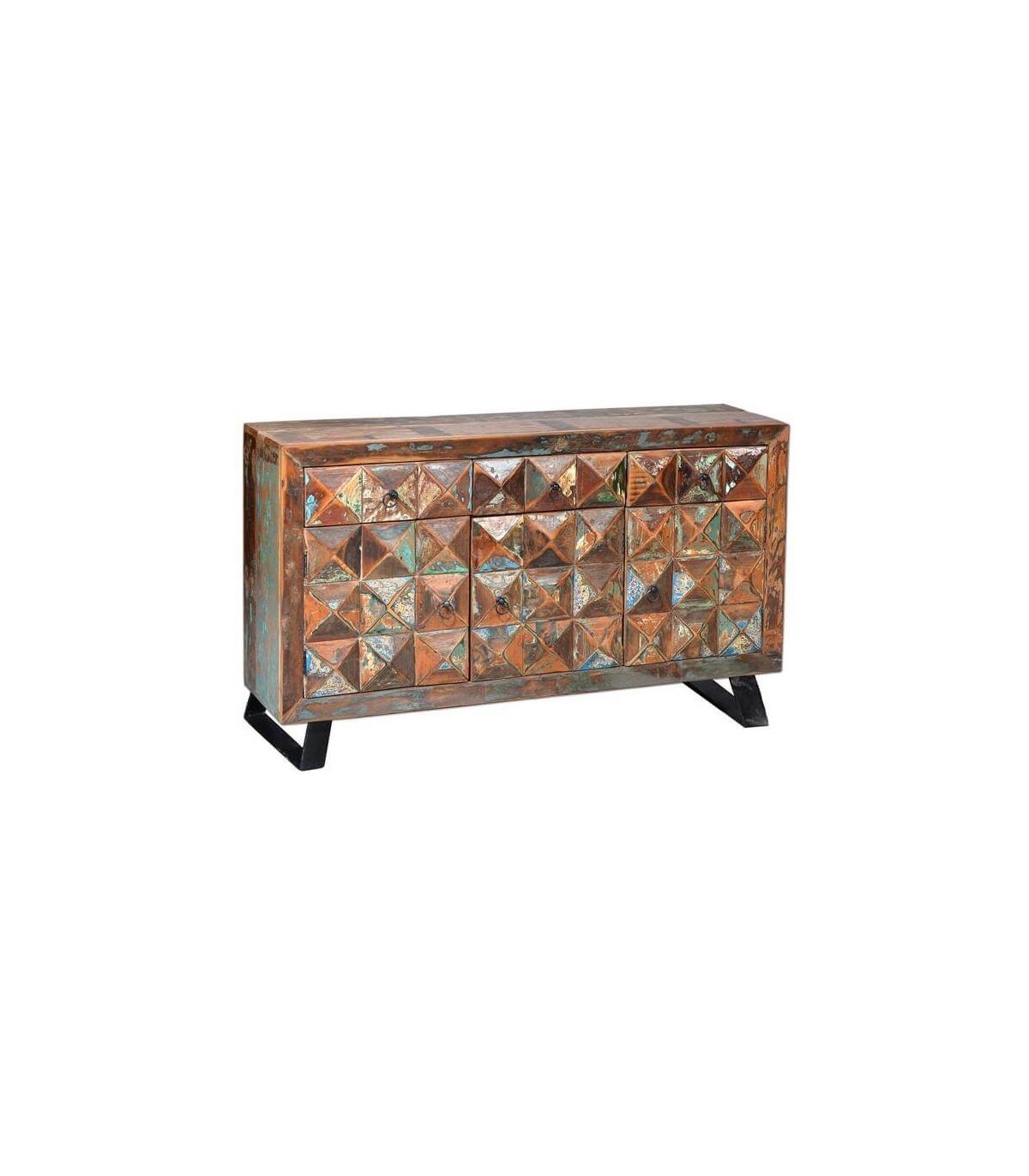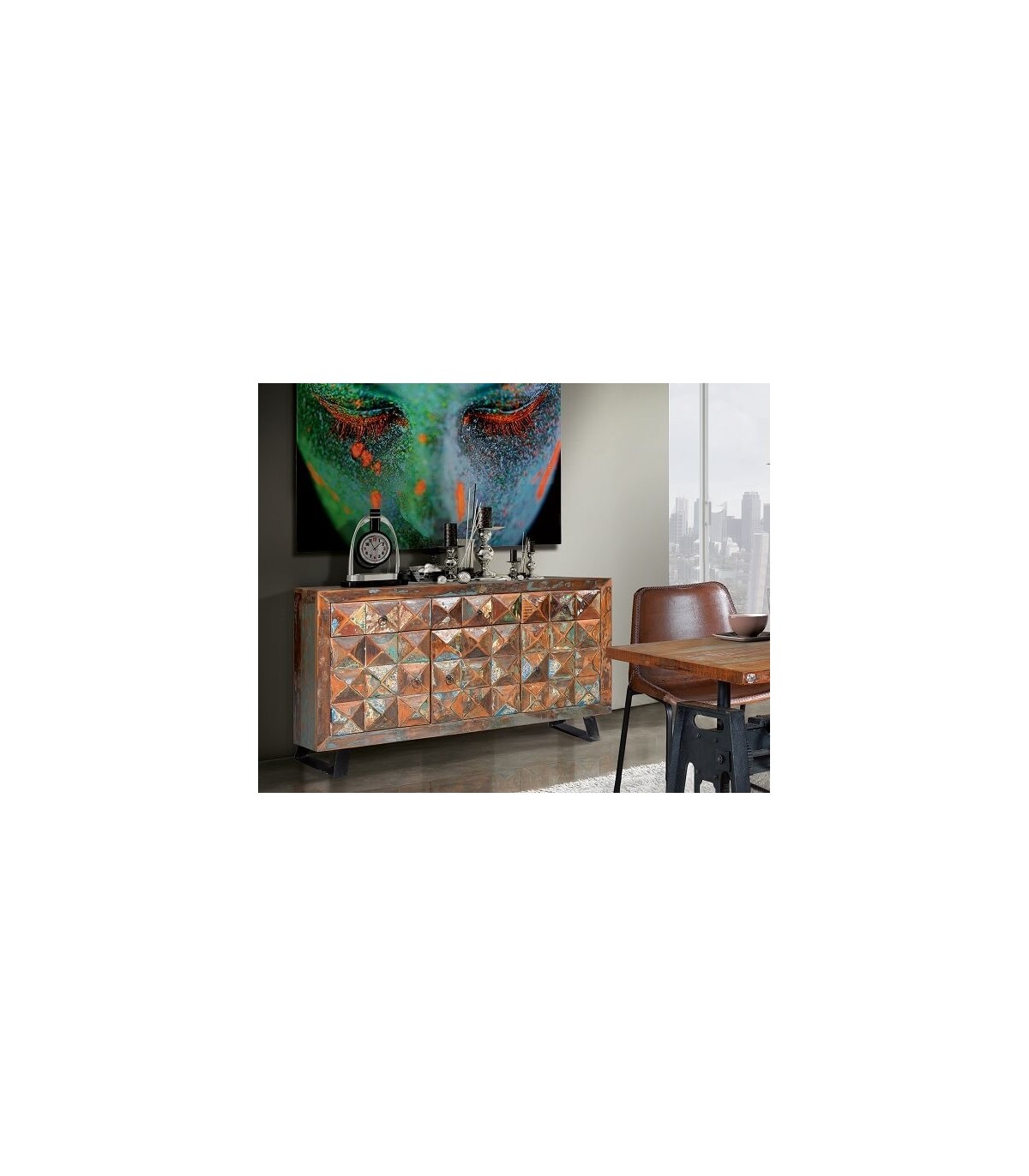 Aparador de nuestra colección de muebles Mares, una colección realizada en madera maciza reciclada 100% tratada, con la peculiaridad de el decapado en multicolor que le da un aspecto fresco y mediterráneo y la aplicación del metal negro que le da un aire industrial vintage, sin duda un muble que será el centro de atención en tu decoración.