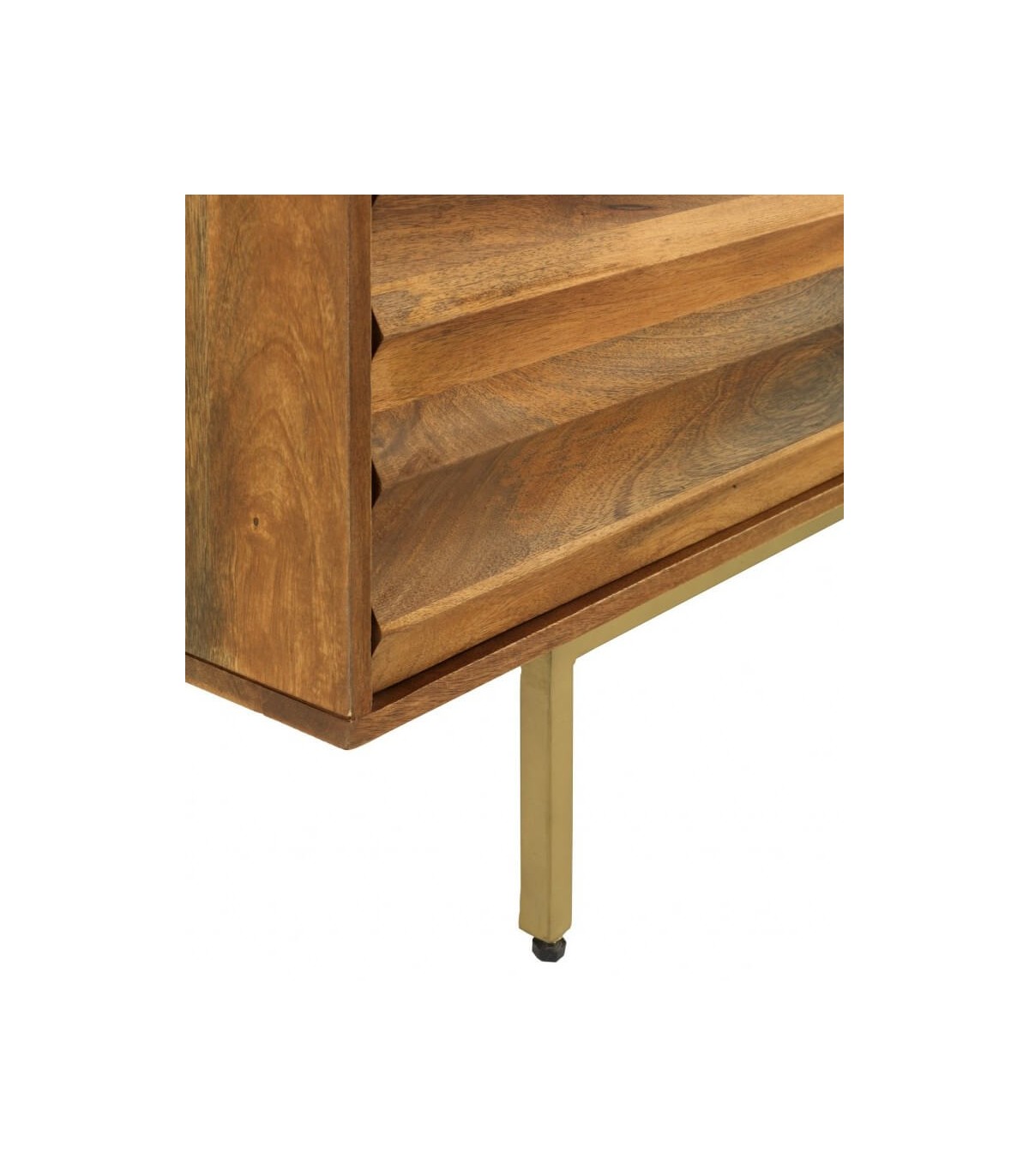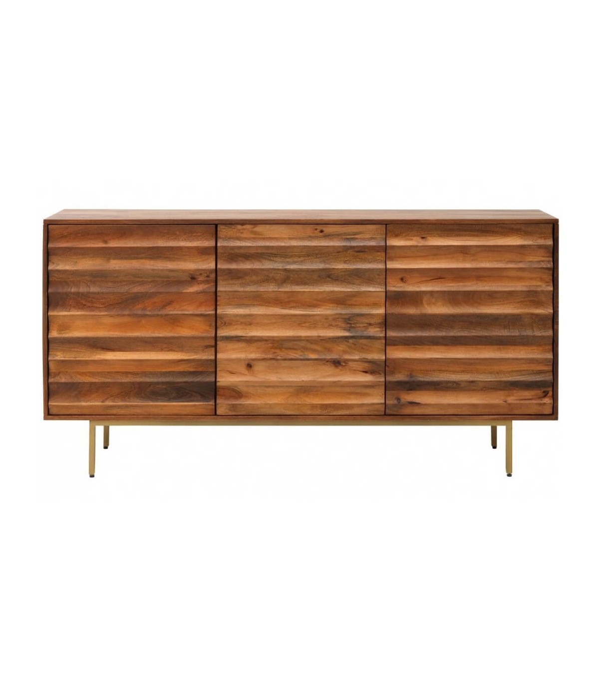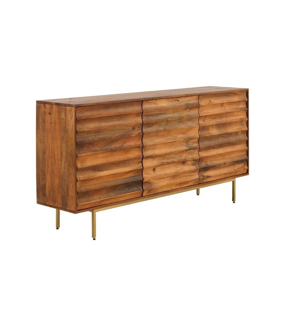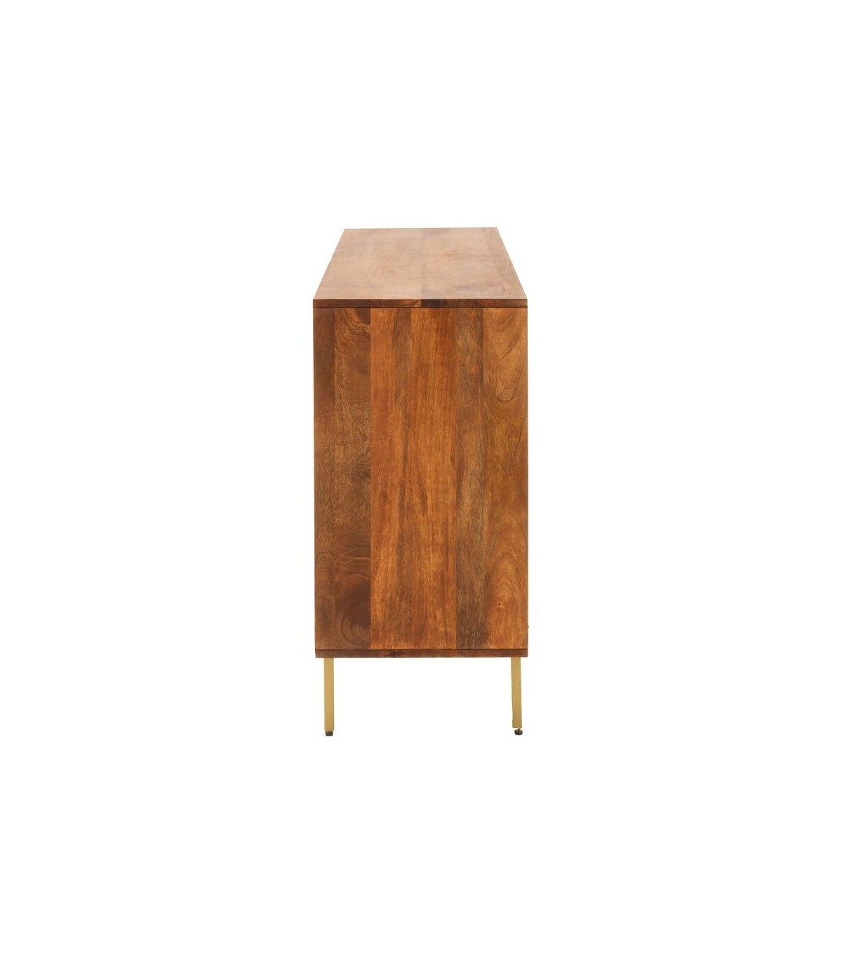 Aparador de estilo colonial, realizado en madera de mango teñida a color cerezo, con herraje de alta calidad, sin tiradores, con la base en metal dorado con patas regulables en altura para una buena estabilidad.