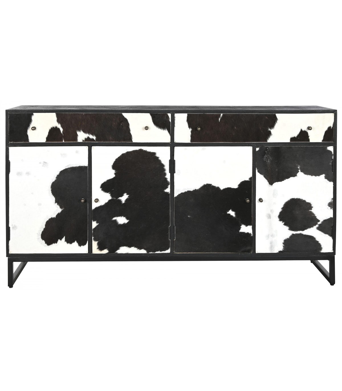 Aparador realizado en madera maciza de mango teñida color negro, patas y tiradores en metal negro, piel natural, un aparador original con las peculiaridades de que cada mueble es distinto al ser piel de vacuno original.