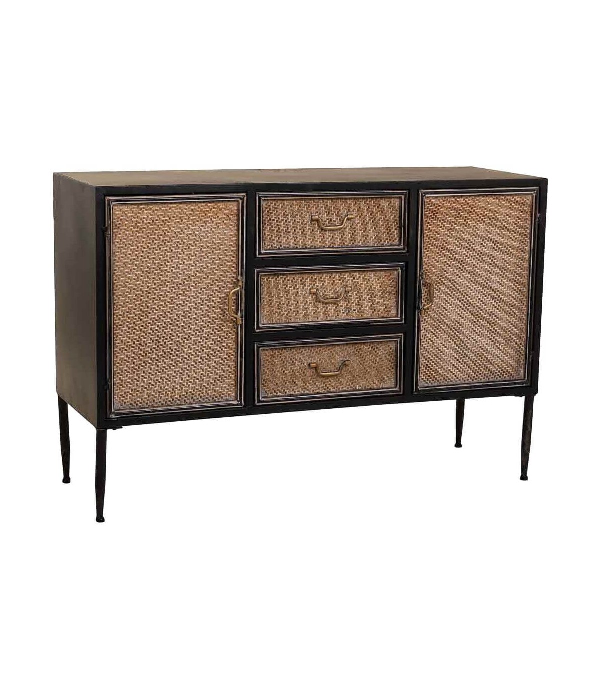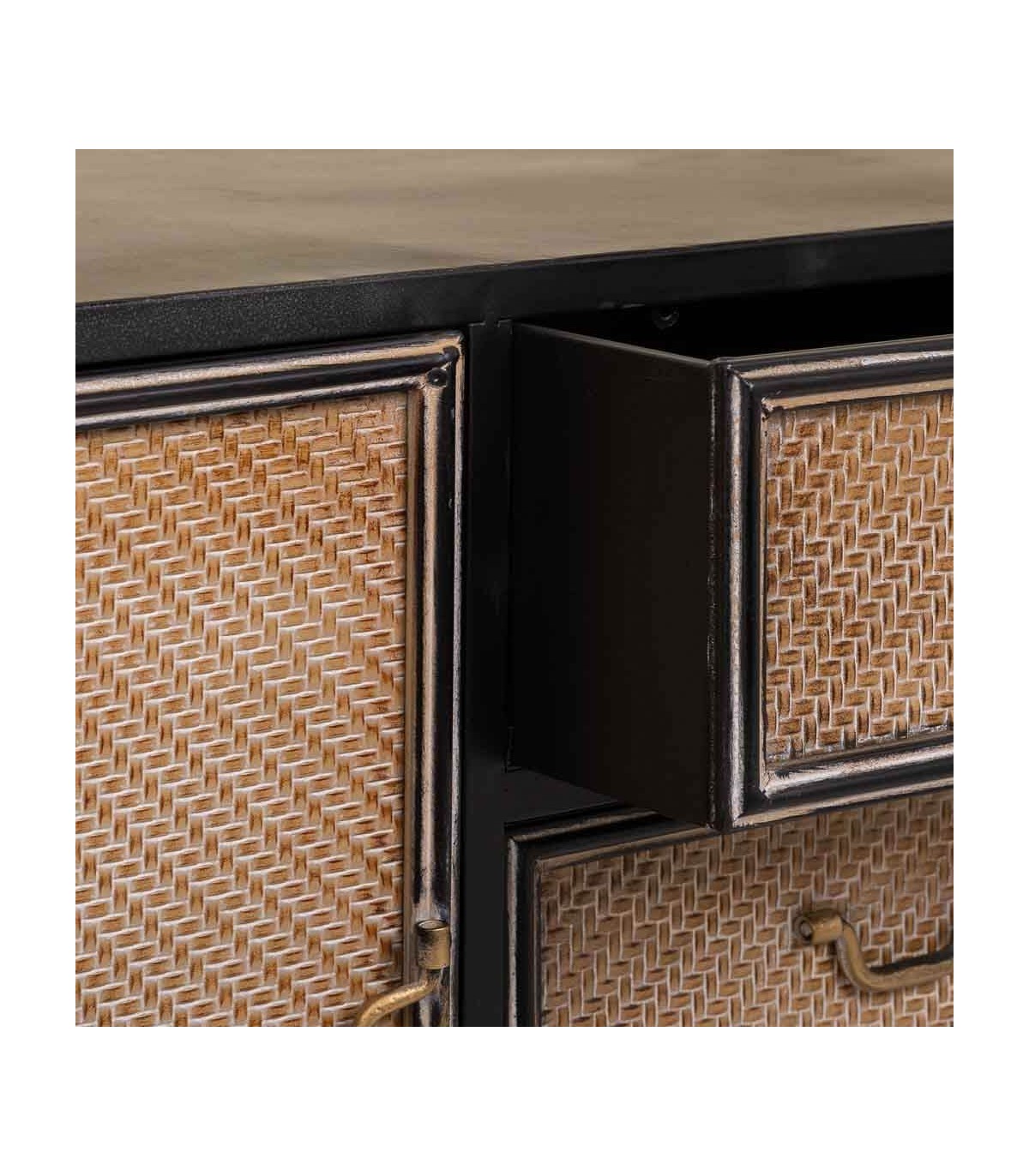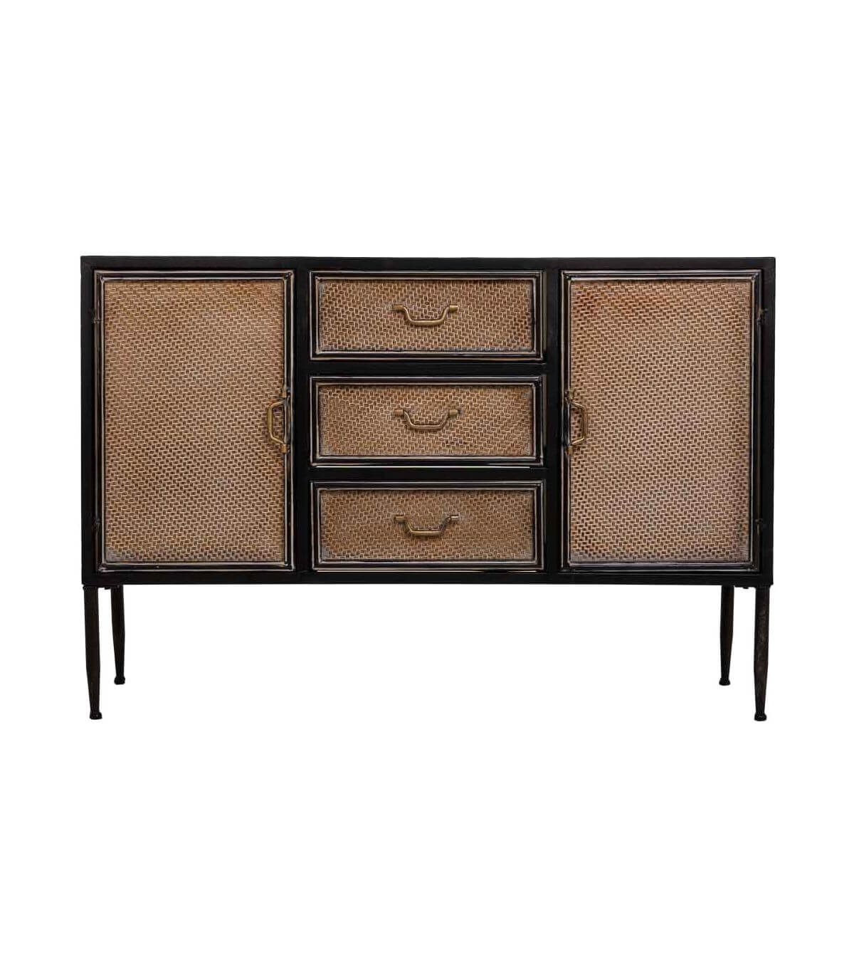 Aparador de nuestra colección de muebles Alka, una colección a caballo entre el estilo industrial y el estilo colonial, realizada en metal, jugando con la estructura en acabado negro y detalles de frentes en oro viejo imitando ratán, una colección muy robusta y decorativa, un mueble hecho para durar.