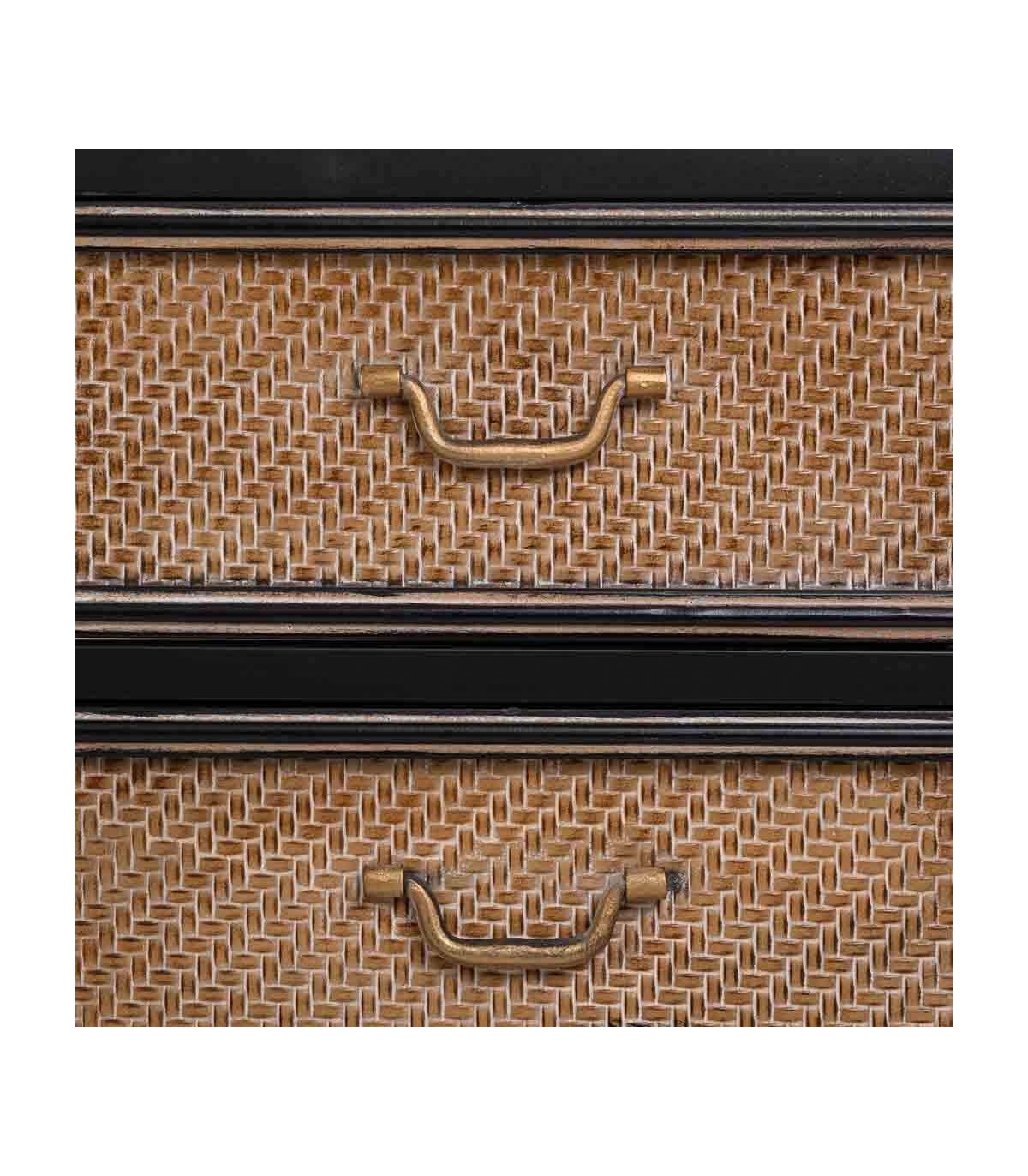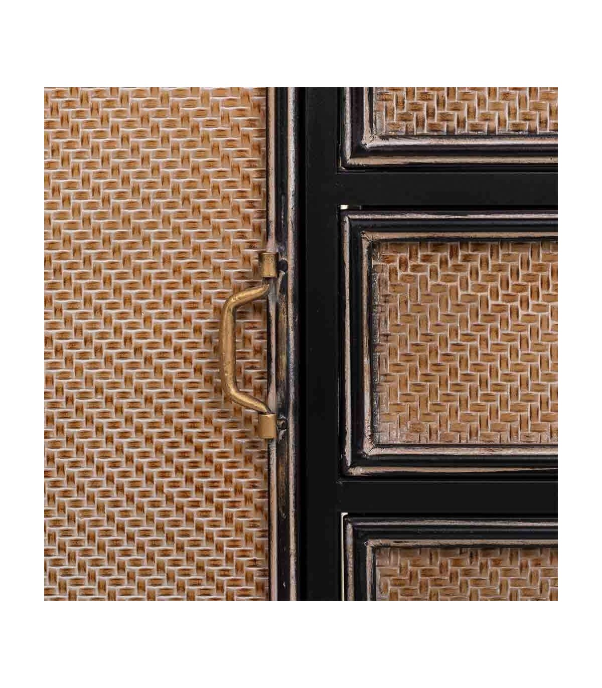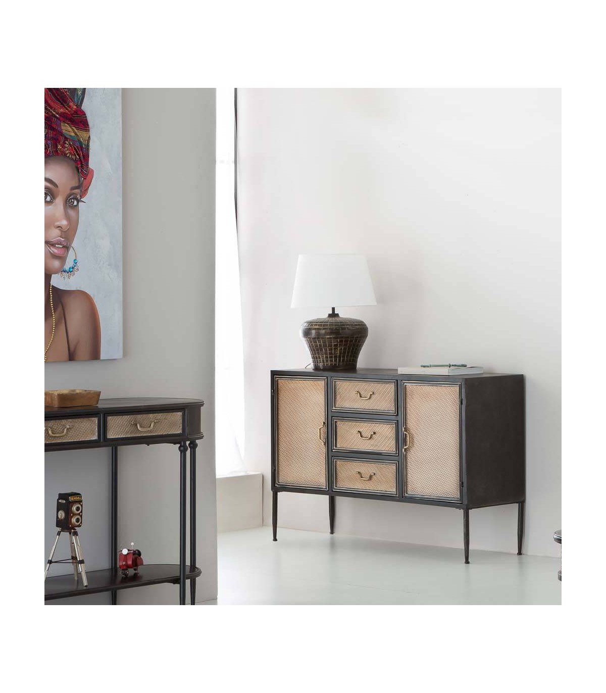Aparador de nuestra colección de muebles Alka, una colección a caballo entre el estilo industrial y el estilo colonial, realizada en metal, jugando con la estructura en acabado negro y detalles de frentes en oro viejo imitando ratán, una colección muy robusta y decorativa, un mueble hecho para durar.