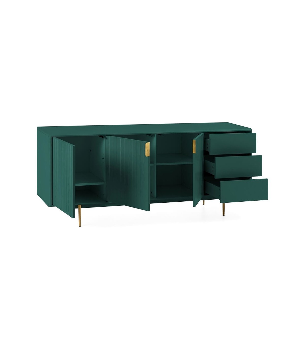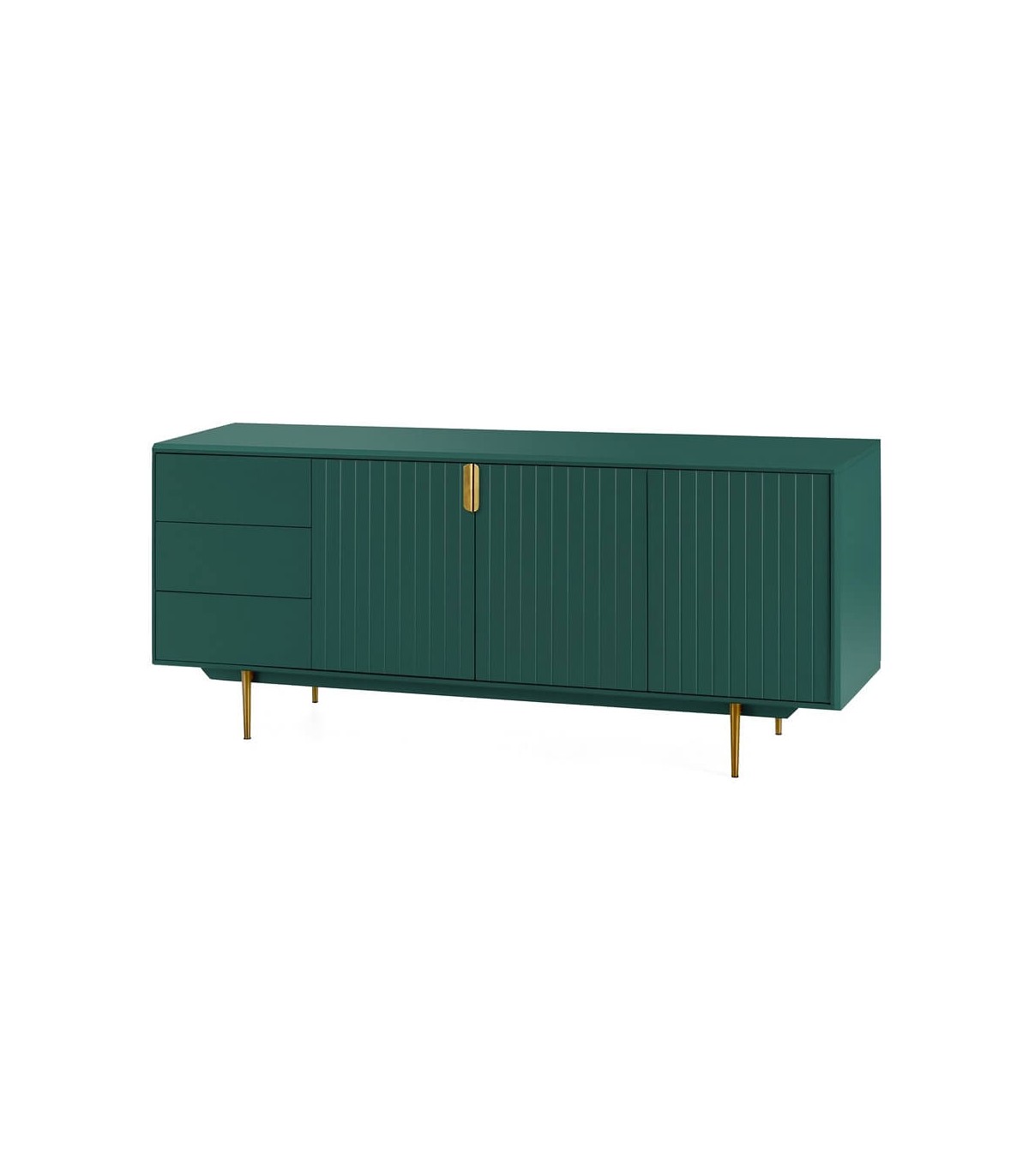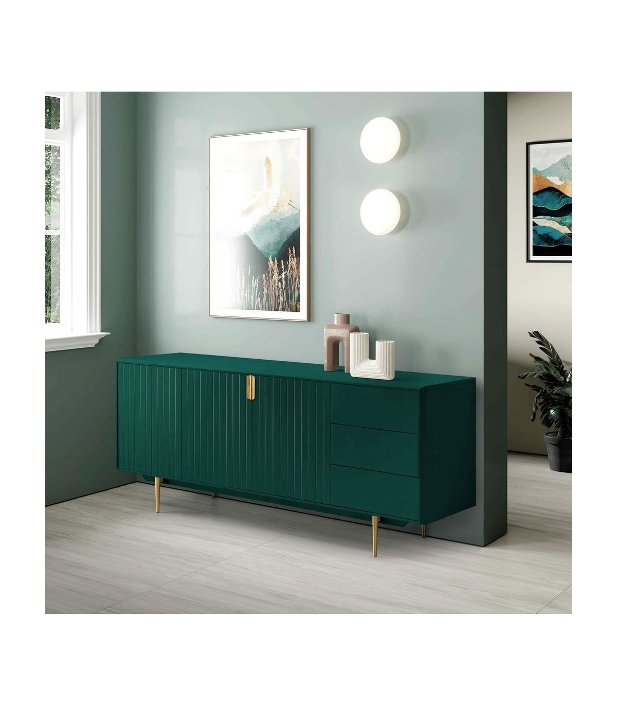 Bonito aparador realizado en madera lacada en verde satinado, patas en metal dorado, con 3 puertas y 3 cajones de estilo moderno, un aparador perfecto para darle un toque de color a tu decoración.