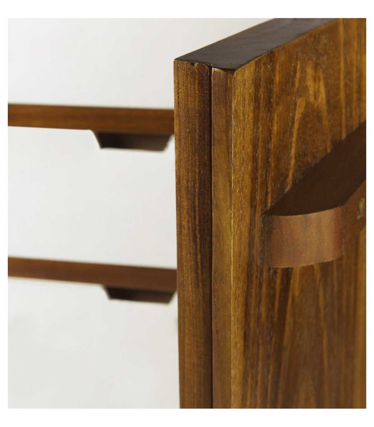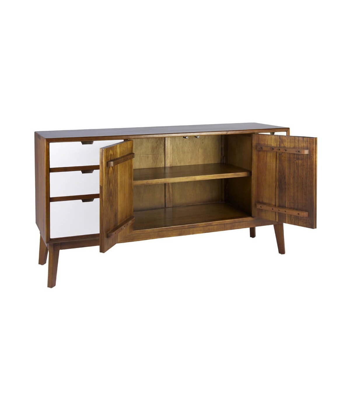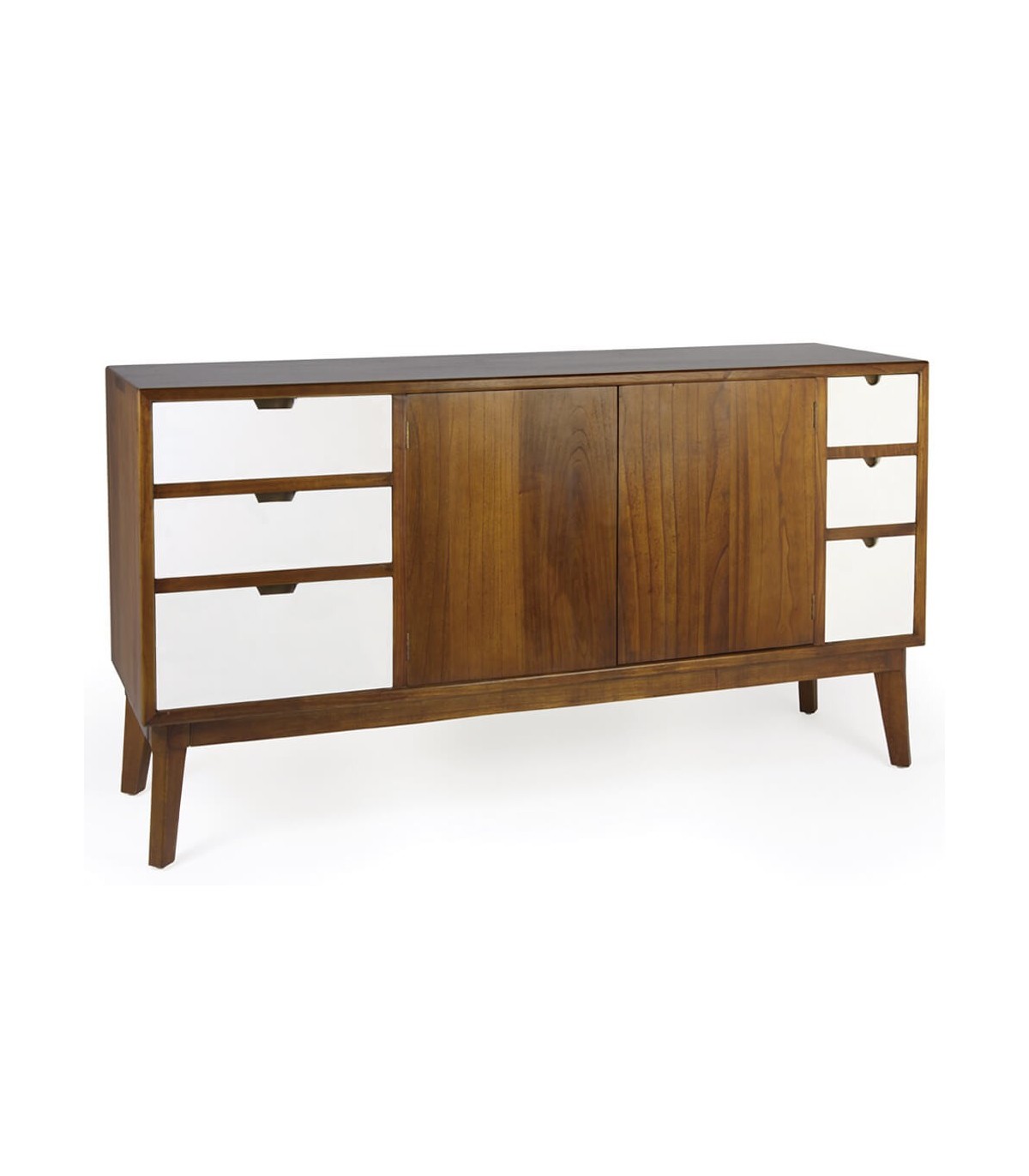 - Acabado, 100 % artesanal, hecho a mano. Madera maciza acabado teca, frente de cajones lacados en blanco, tiradores bronce.