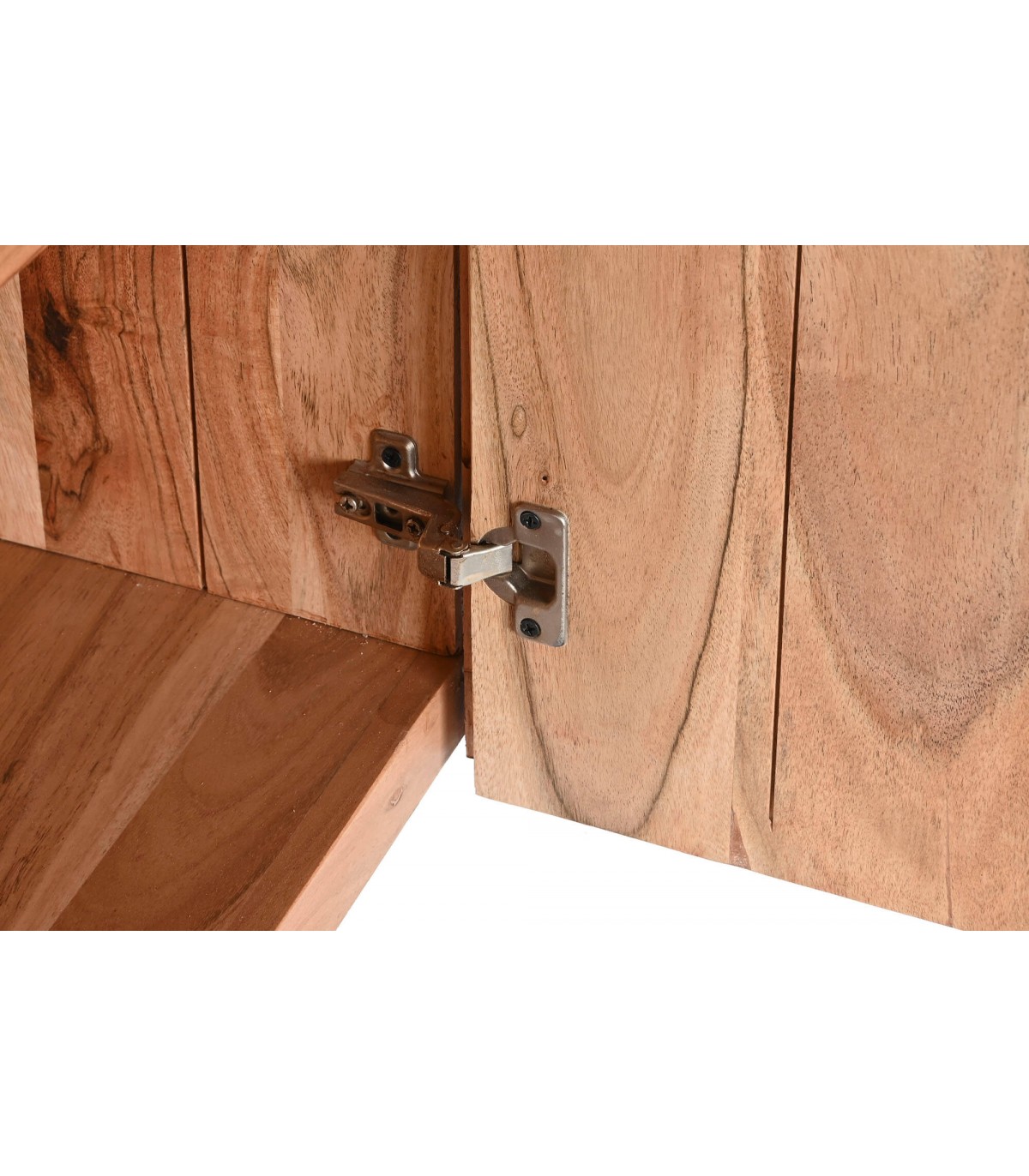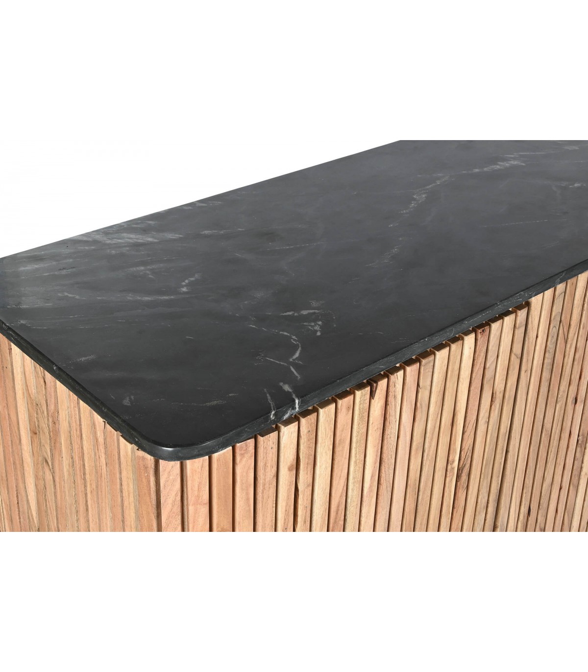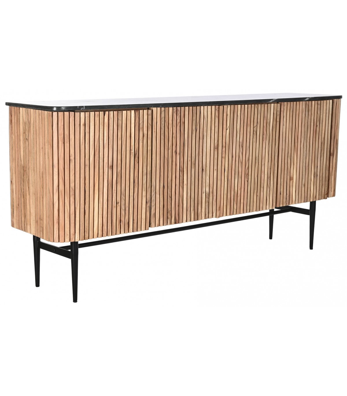 Aparador con cuatro puertas y dos cajones interiores, con el cuerpo en madera maciza de acacia efecto a listonado, las patas en metal y la tapa en mármol negro.