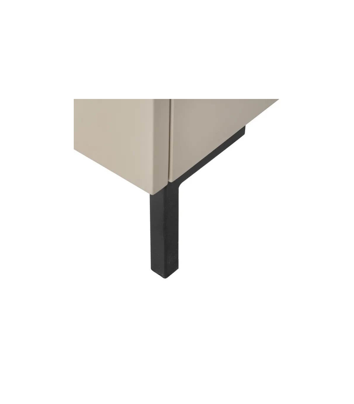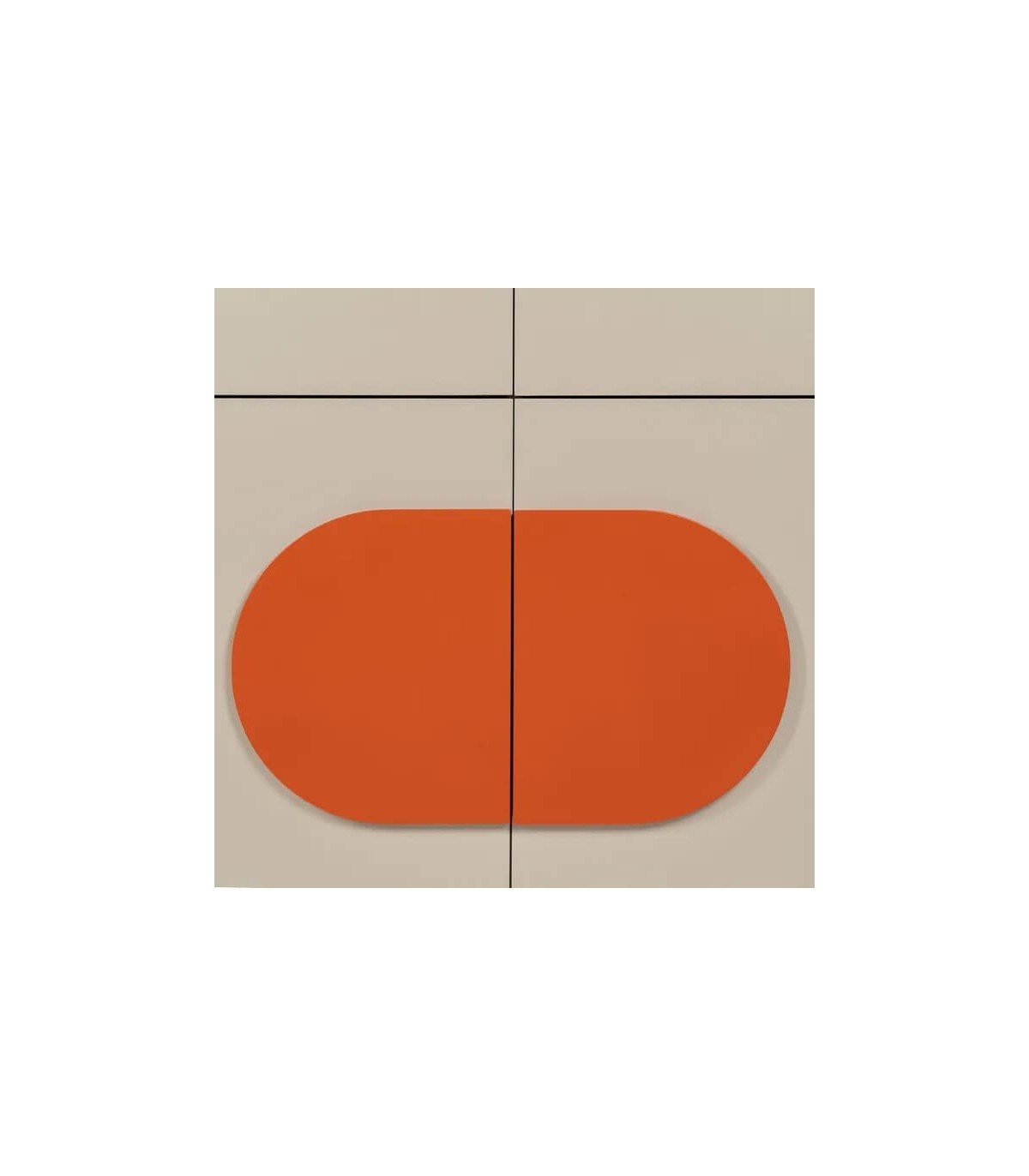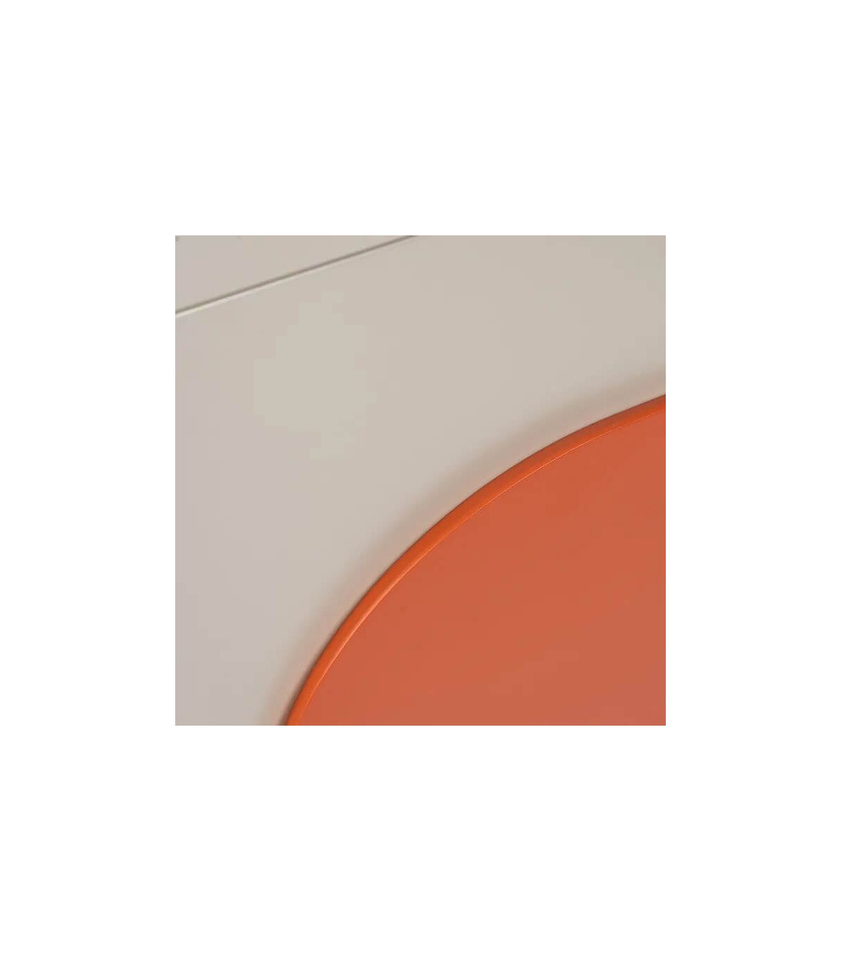 Acabado, madera lacada en color topo y naranja, patas en metal negro.